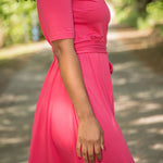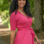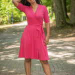 Omlottklänningar har en särskild plats i våra hjärtan, då de kombinerar smickrande siluetter med överlägsen komfort. Här är vår knälånga modell, sydd i stretchig trikå med knyt i midjan och vidd i kjolen. Bestie wrap dress återkommer i vår kollektion och är en av våra mest omtyckta klänningar.