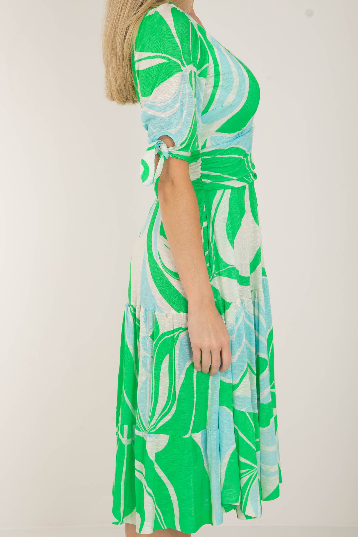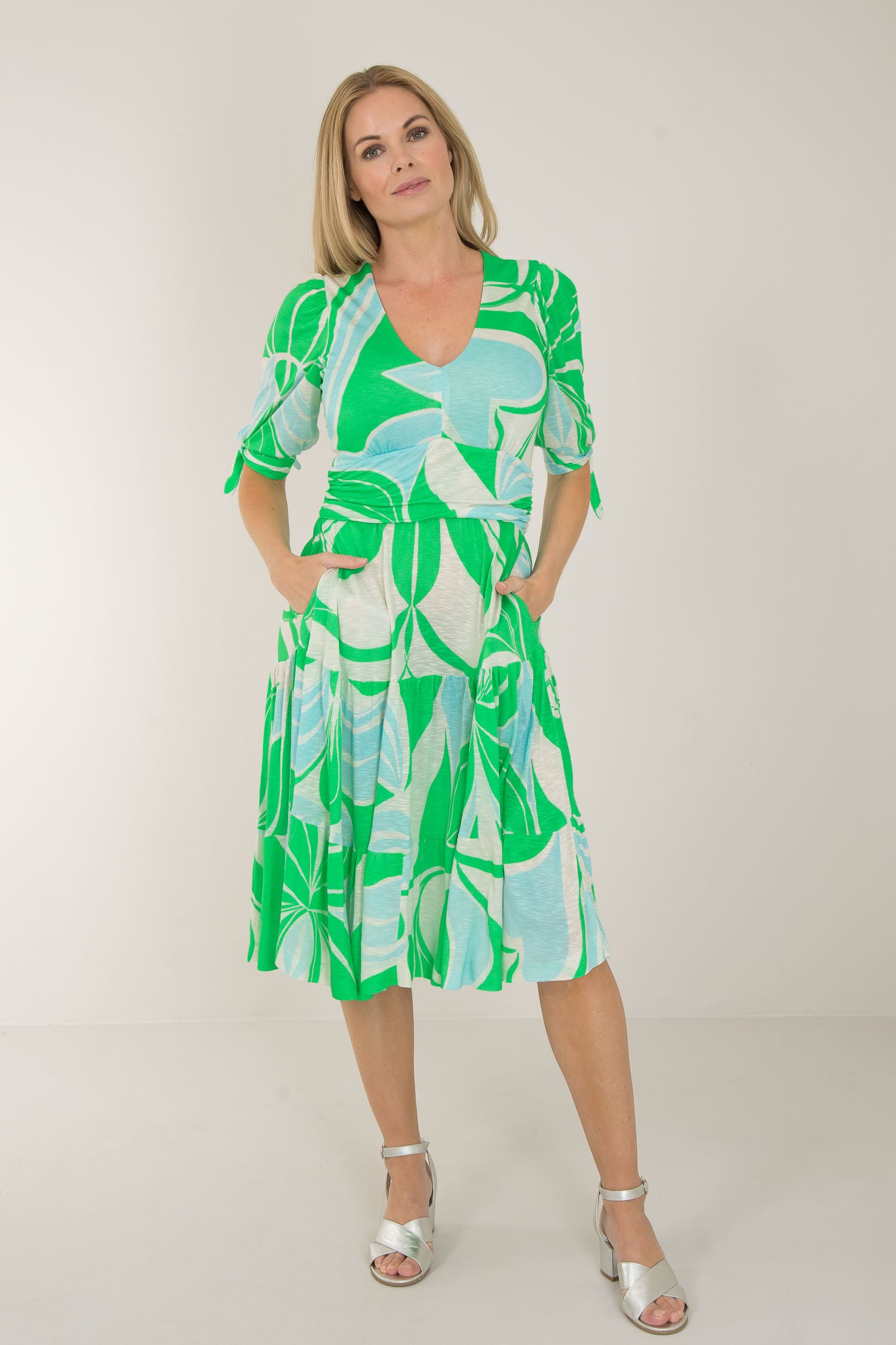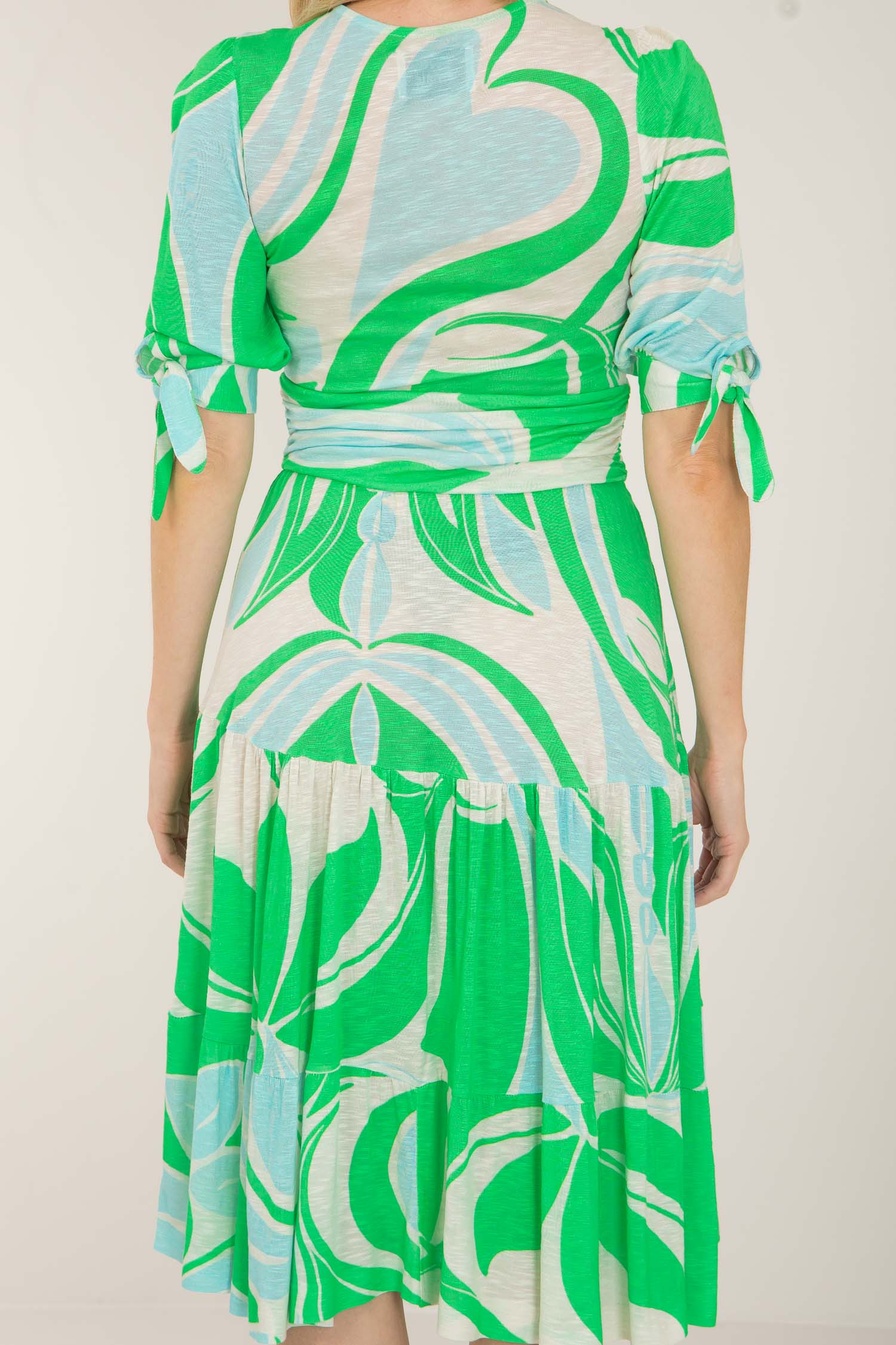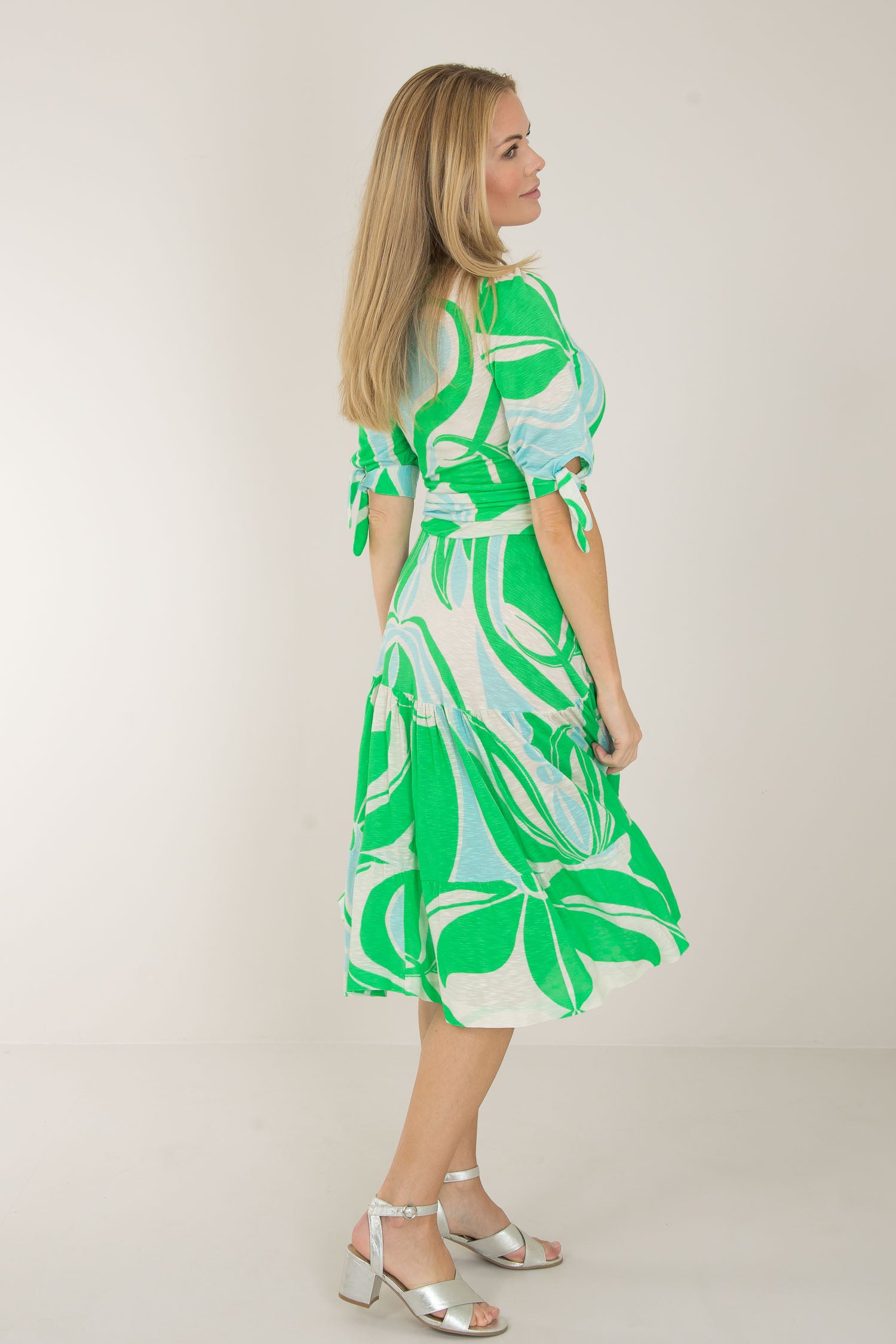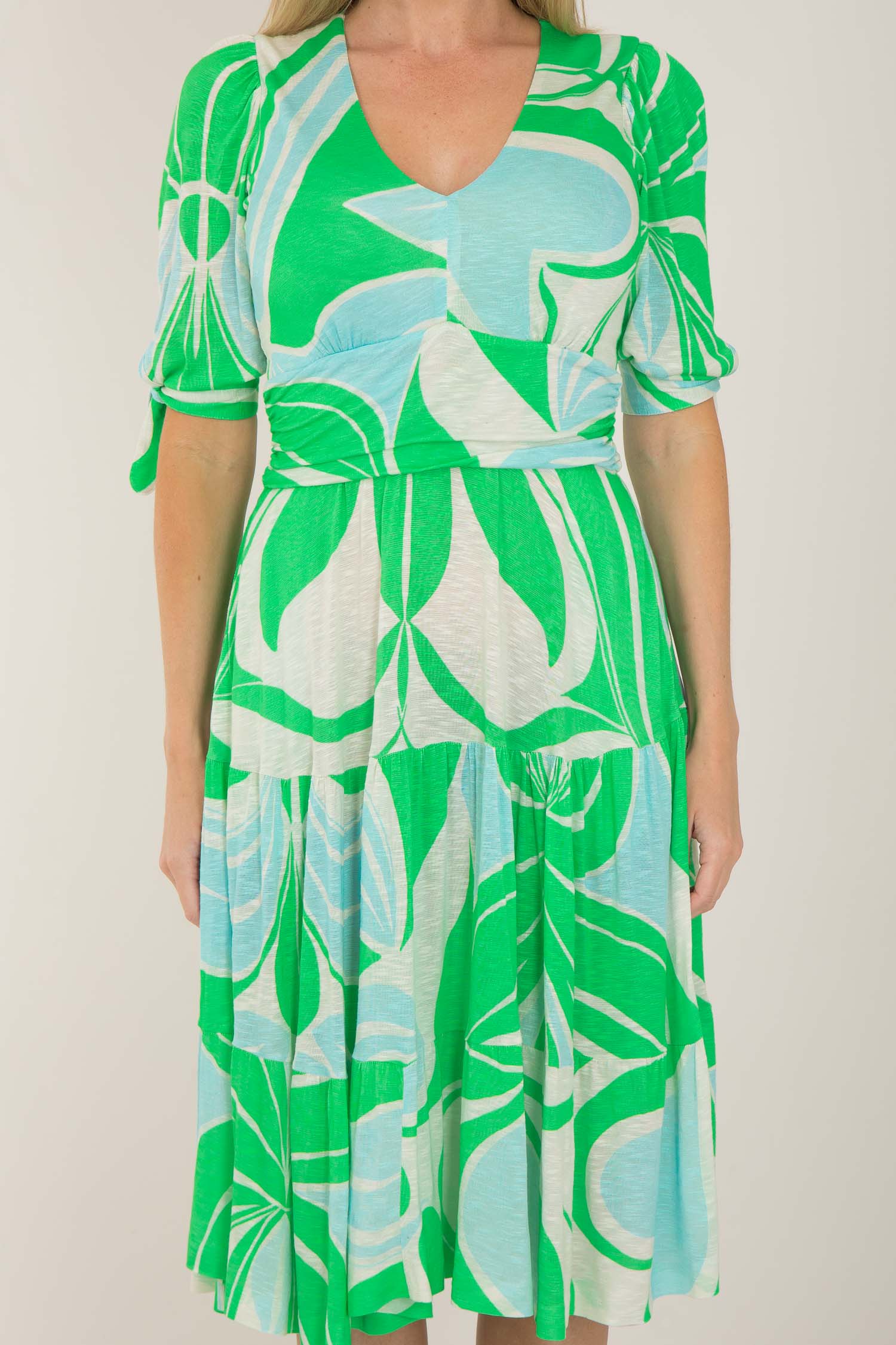 Flowy short jersey dress är en sommardröm med ett stort och maffigt mönster som verkligen sticker ut och ger klänningen det där lilla extra. Denna klänning är designad för dig som vill utstråla resort-chic elegans samtidigt som du vill känna dig bekväm i en mjuk trikå. Med en figursydd överdel, puffiga ärmar och draperat midjeband skapas en perfekt balans mellan enkelhet och sofistikation. För extra bekvämlighet har klänningen sköna fickor i sidan.