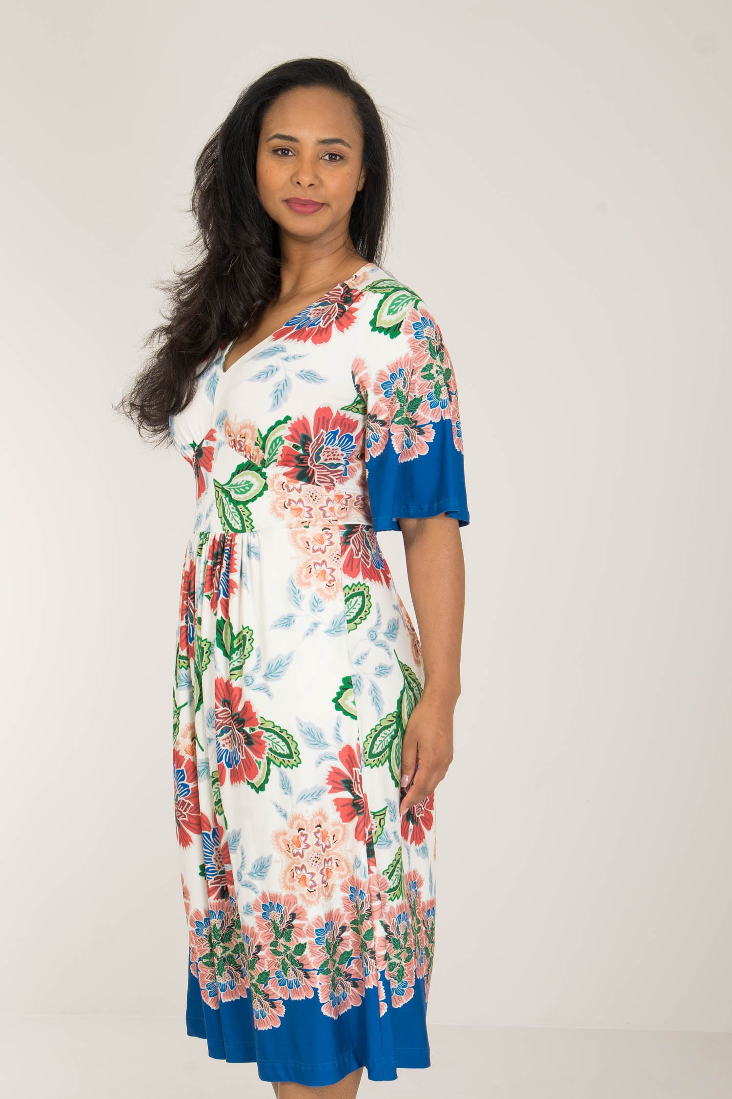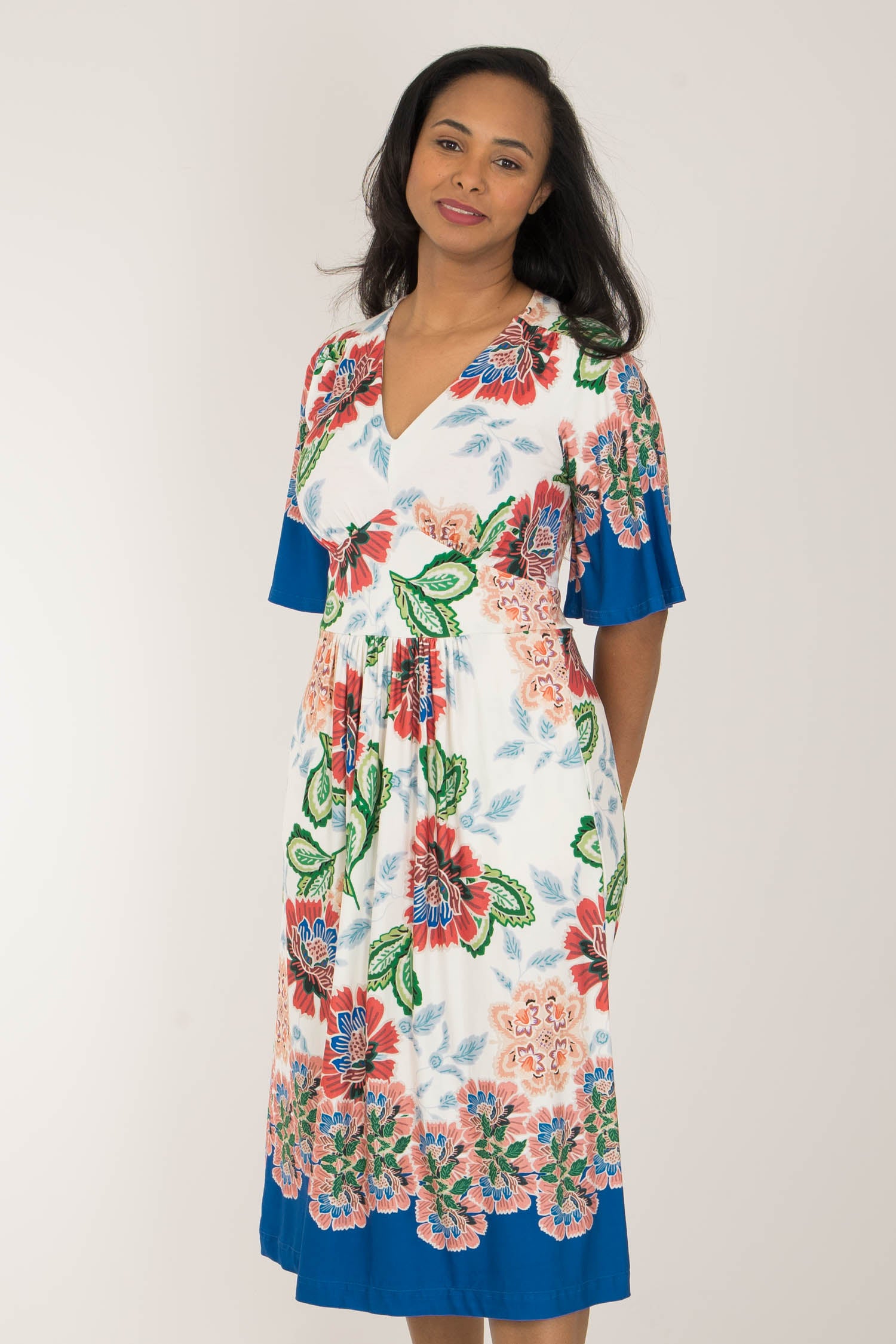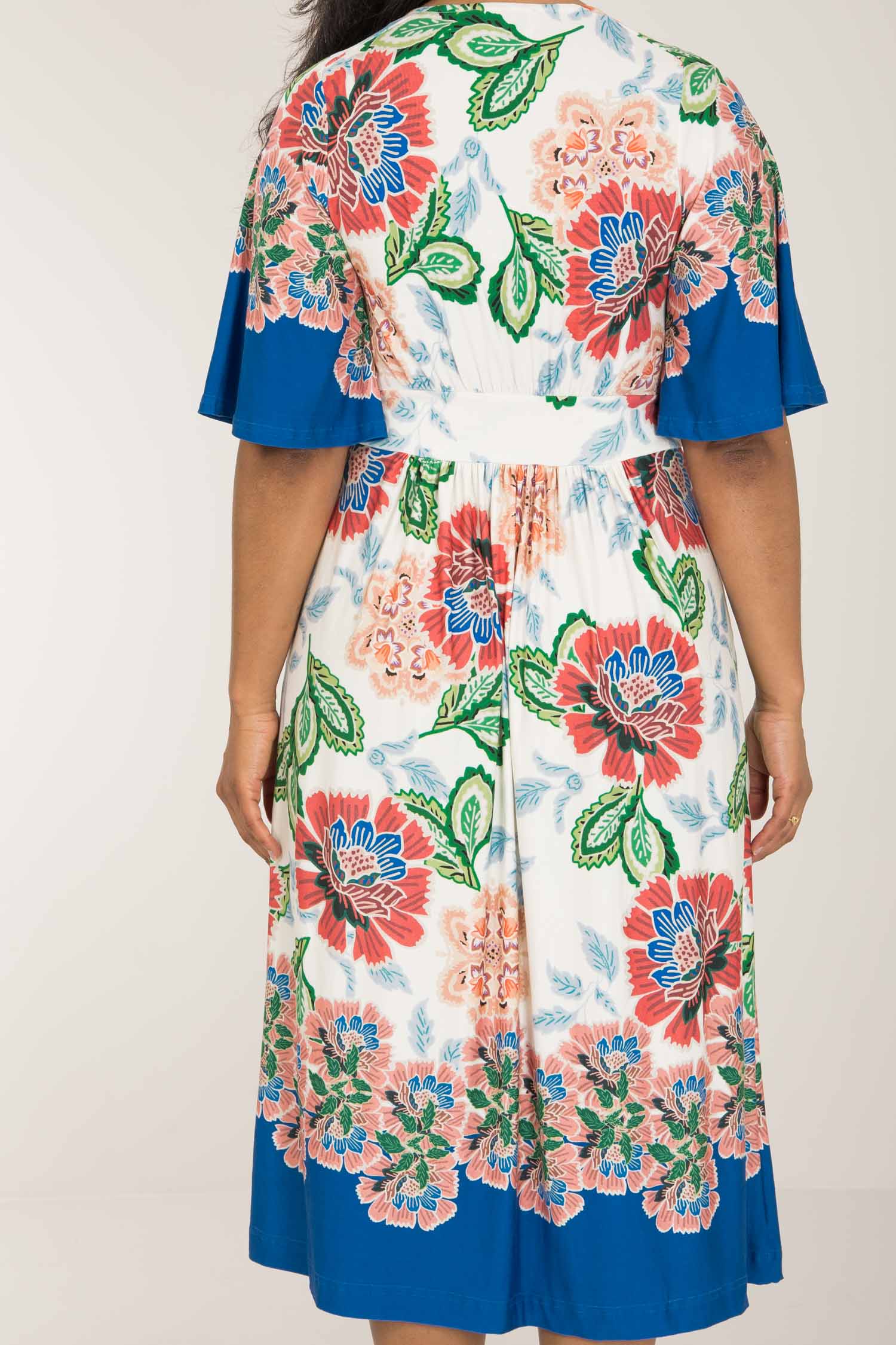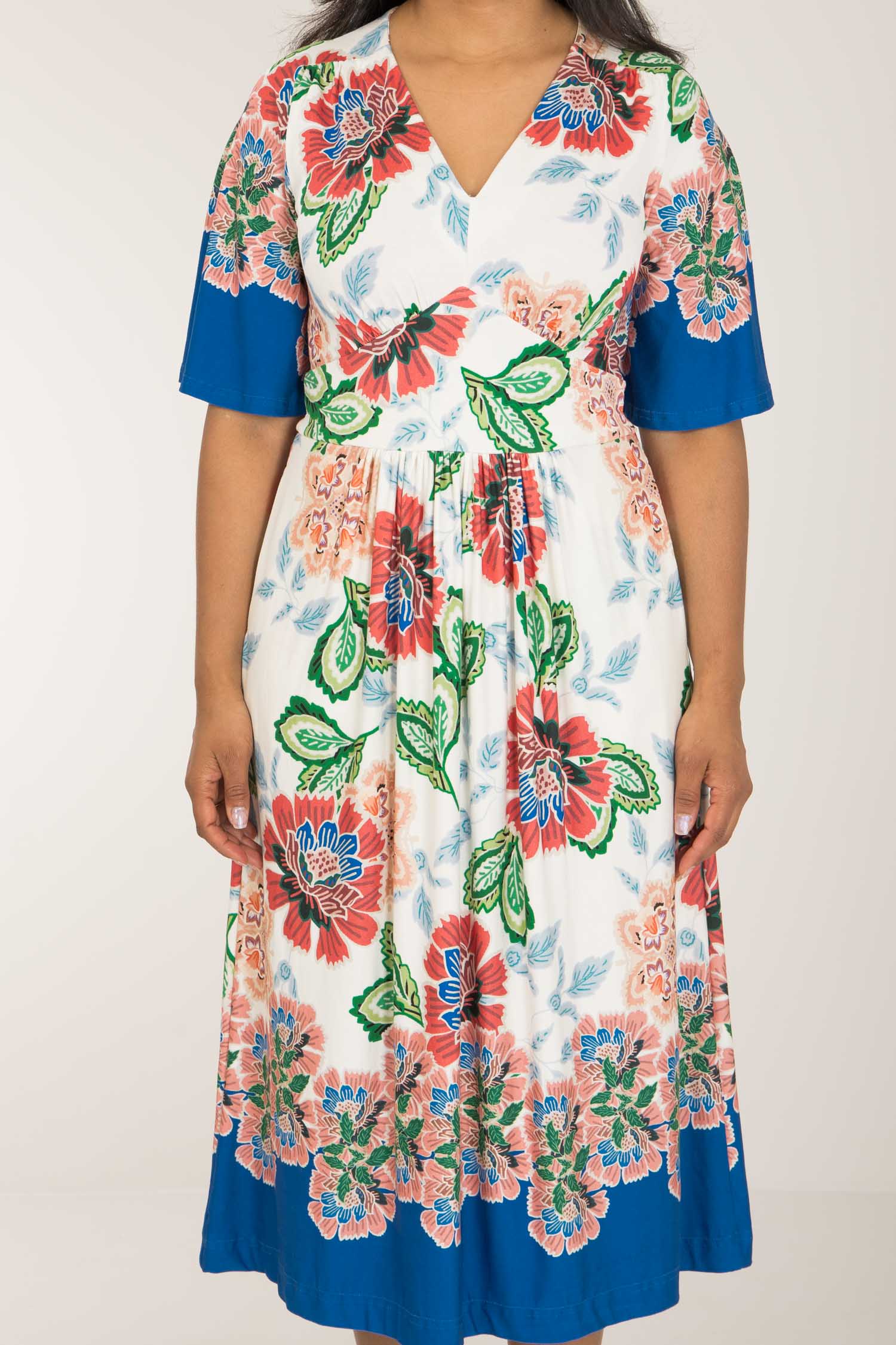 Nina jersey dress är något extra! Denna blommönstrade trikåklänning kombinerar komfort och stil på bästa sätt. Klockade ärmar och V-ringning med rynkdetaljer vid axeln ger en feminin och elegant touch. Figurnära upptill med formande midja och vid kjol som smickrar figuren.