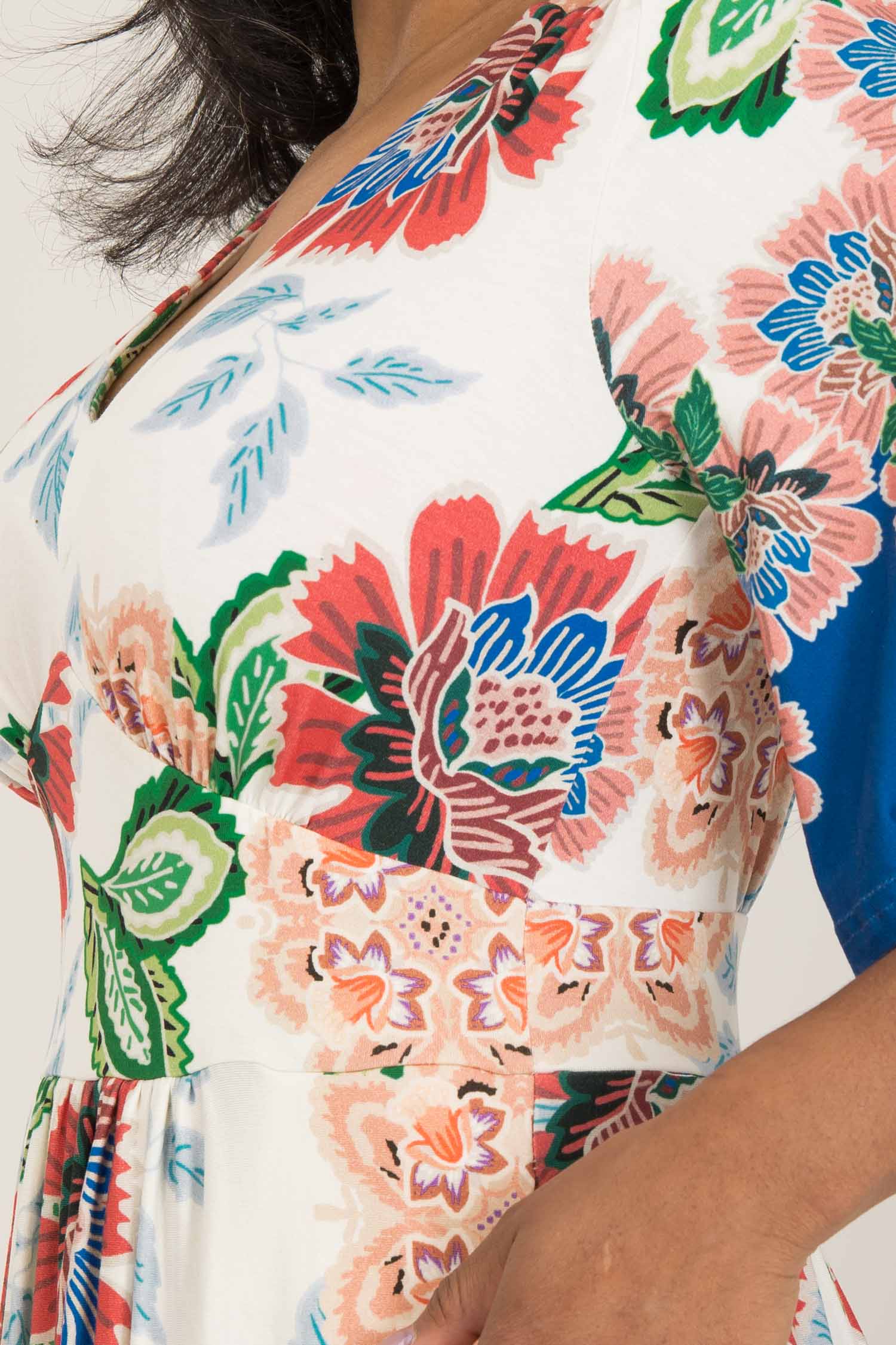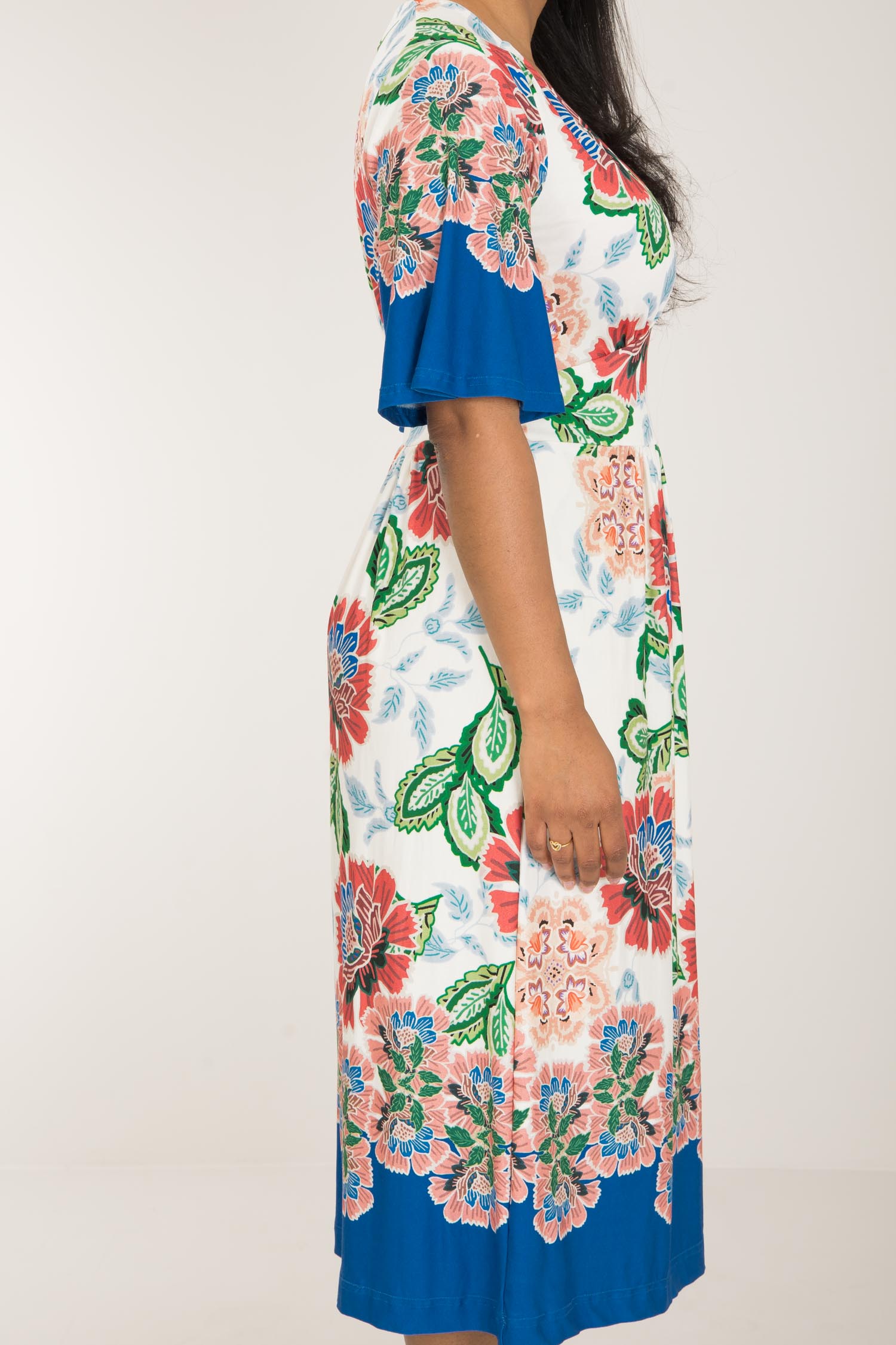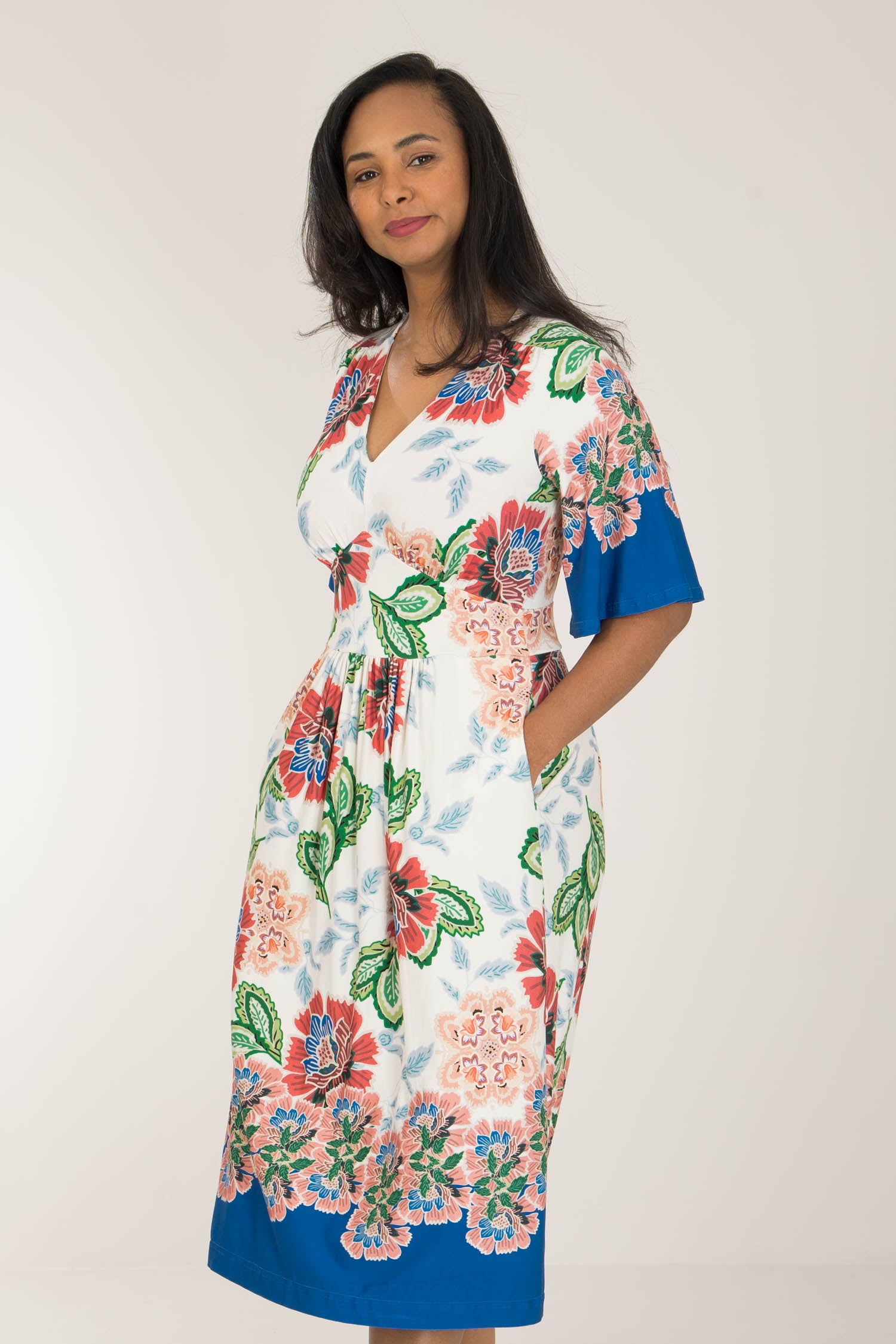 Nina jersey dress är något extra! Denna blommönstrade trikåklänning kombinerar komfort och stil på bästa sätt. Klockade ärmar och V-ringning med rynkdetaljer vid axeln ger en feminin och elegant touch. Figurnära upptill med formande midja och vid kjol som smickrar figuren.