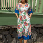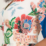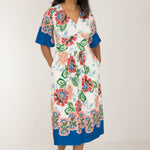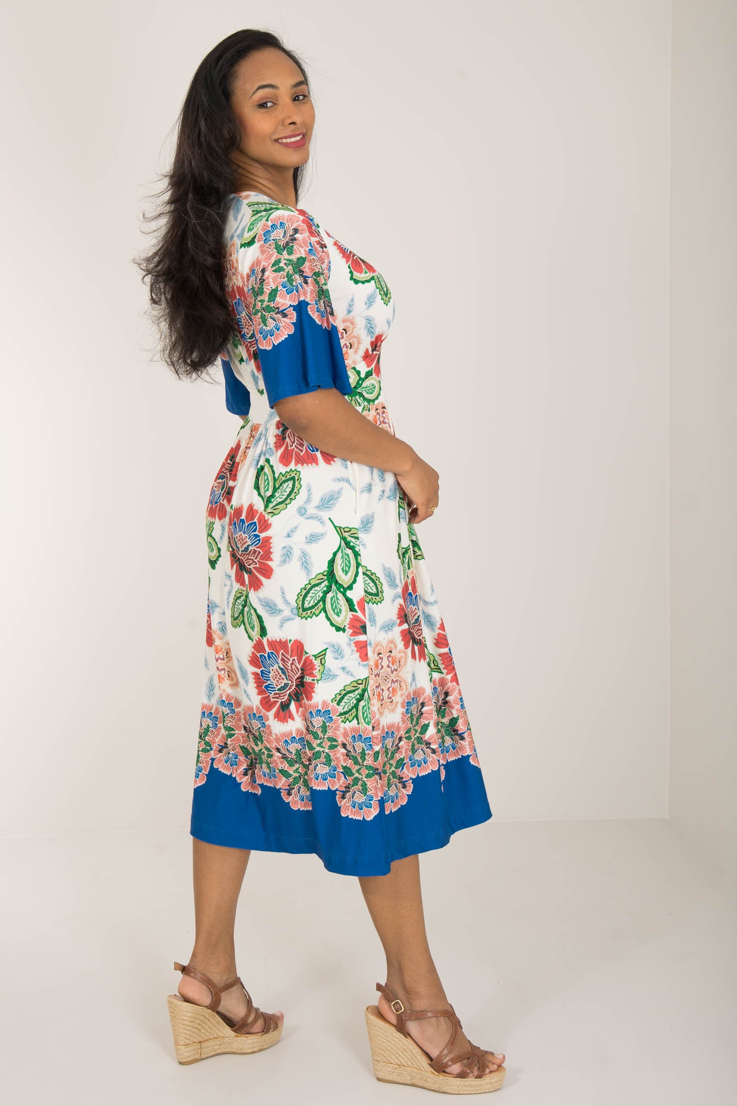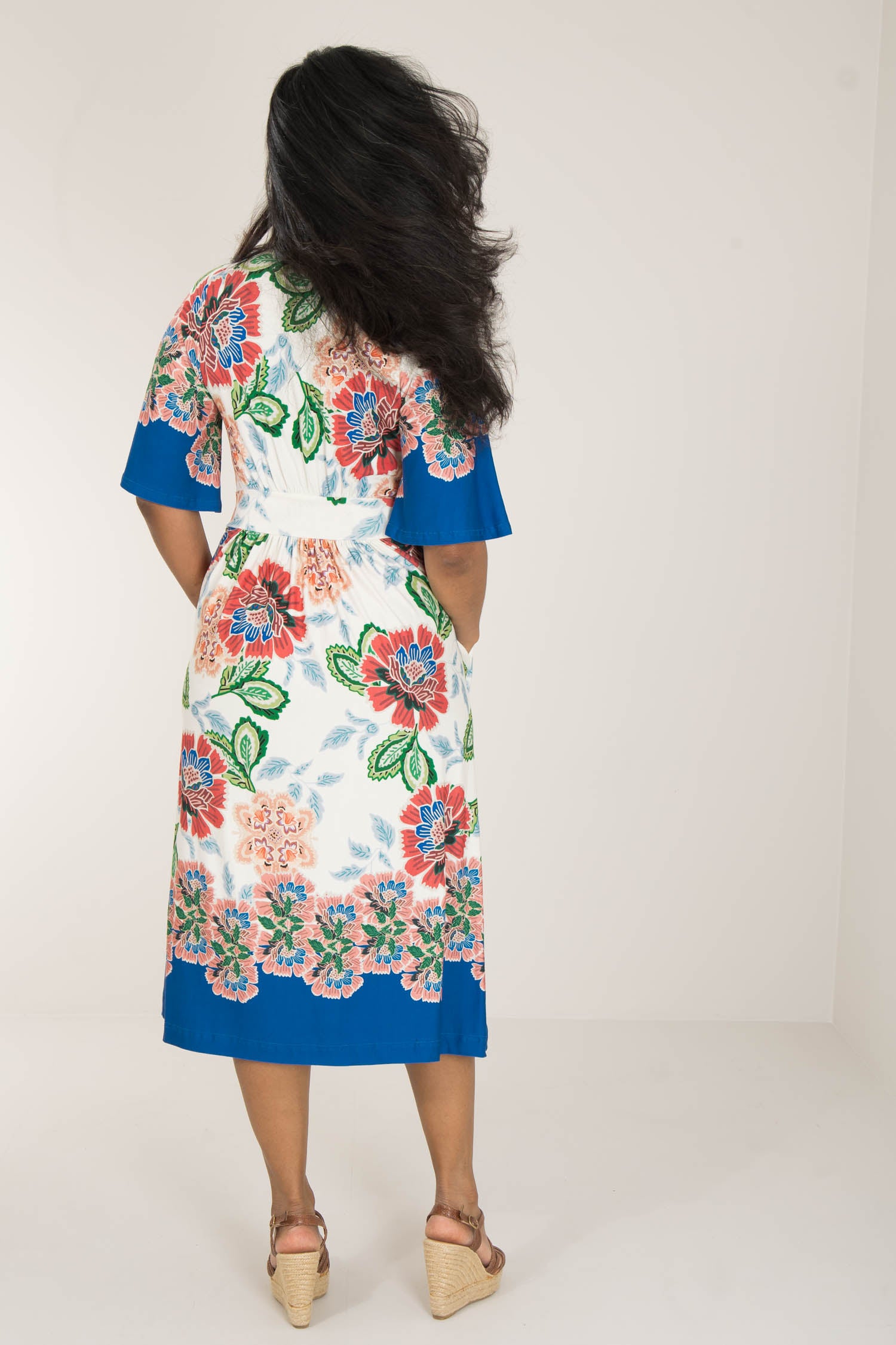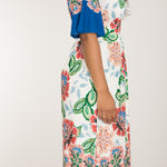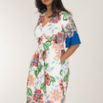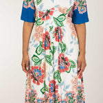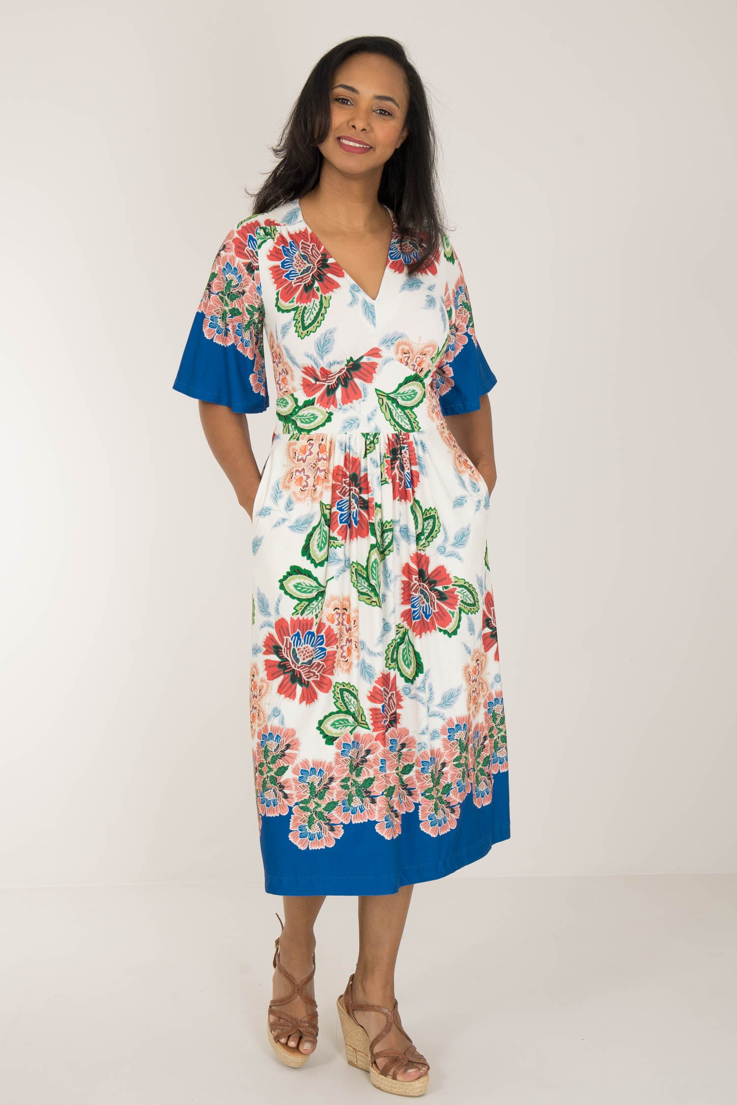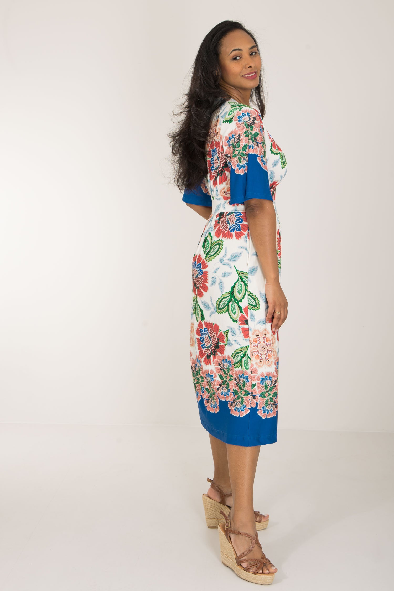 Nina jersey dress är något extra! Denna blommönstrade trikåklänning kombinerar komfort och stil på bästa sätt. Klockade ärmar och V-ringning med rynkdetaljer vid axeln ger en feminin och elegant touch. Figurnära upptill med formande midja och vid kjol som smickrar figuren.