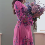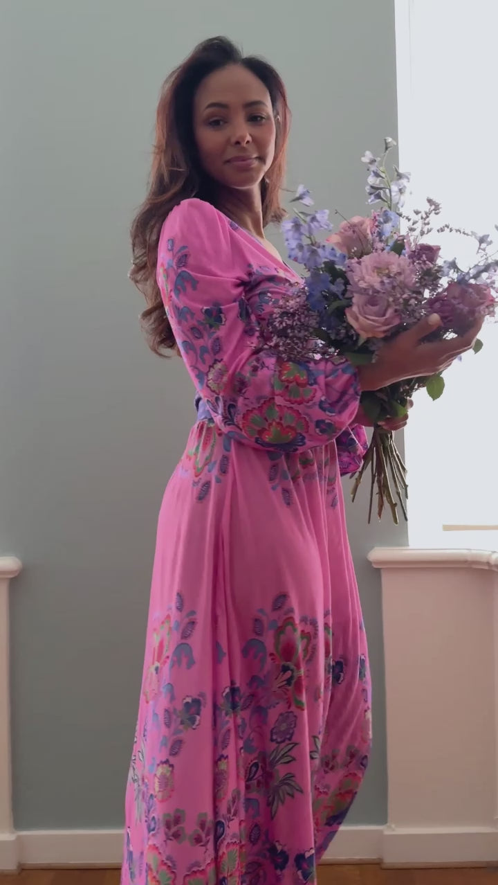 The print frames the neckline and the waist, creating a cohesive look and a beautifully balanced silhouette. The dress has an ankle-length skirt with a soft drape and long, slightly wider sleeves with elastic at the cuffs.