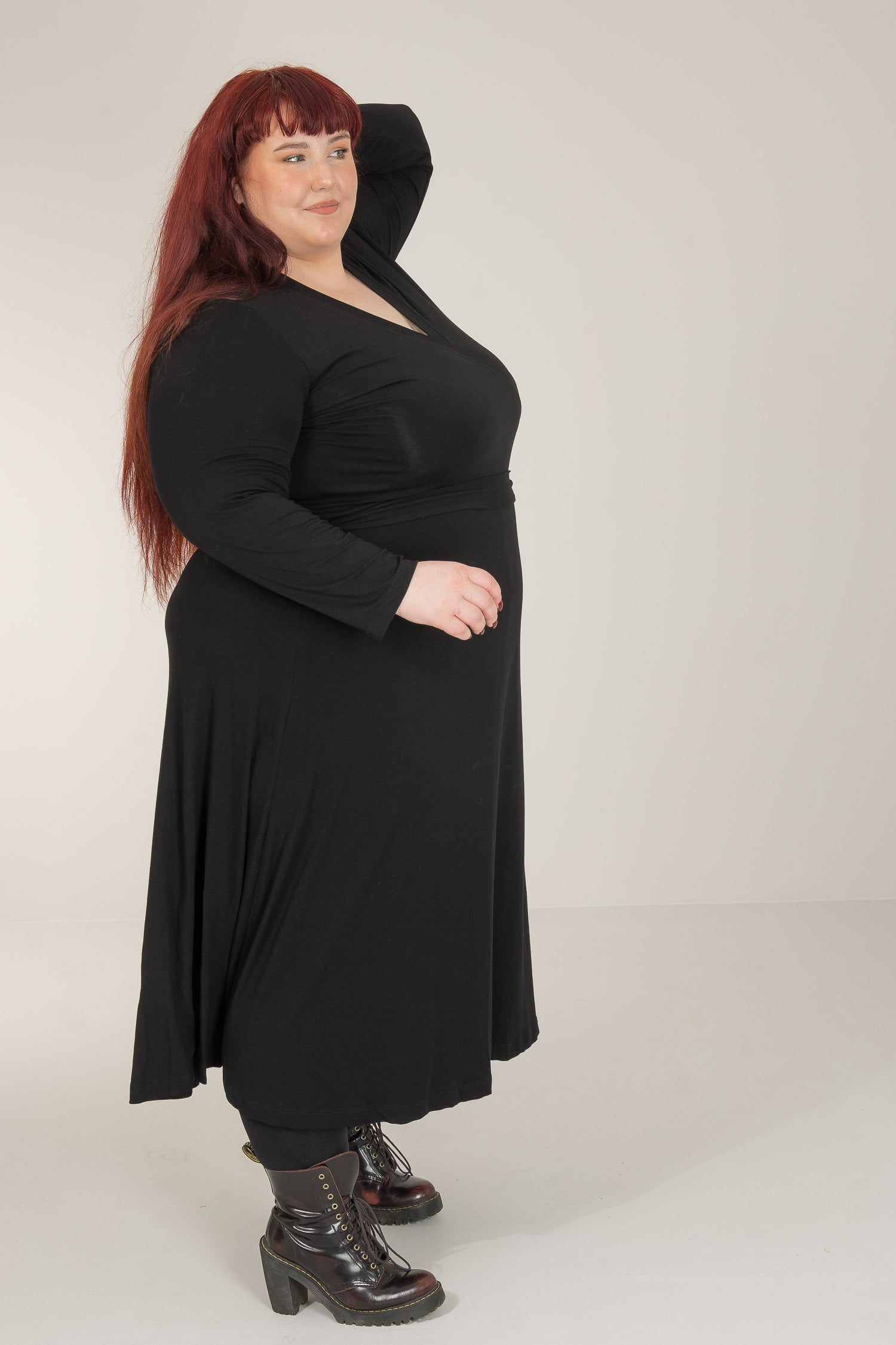 Om du läser att en klänning är sydd i stretchigt tyg med tungt fall, så är det en av våra mest omtyckta kvaliteter. Tyget är en hållbart tillverkad trikå av Vortex-viskos och elastan – mjukt, följsamt och med en elegant tyngd som ger ett vackert fall längs kroppen.