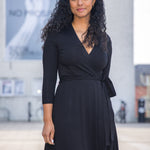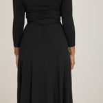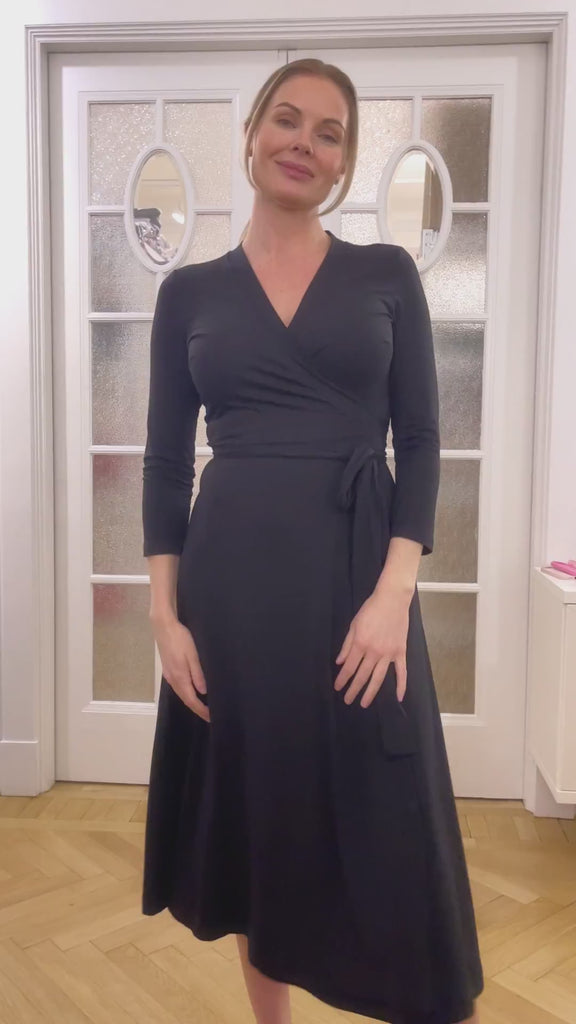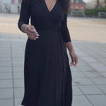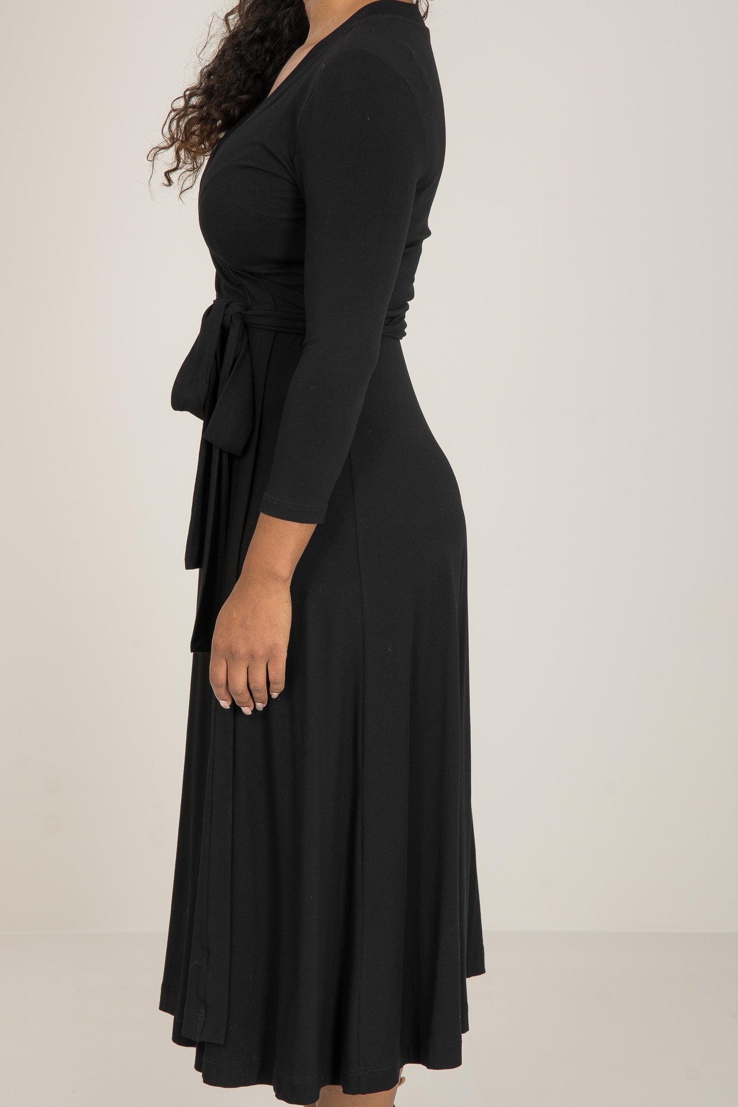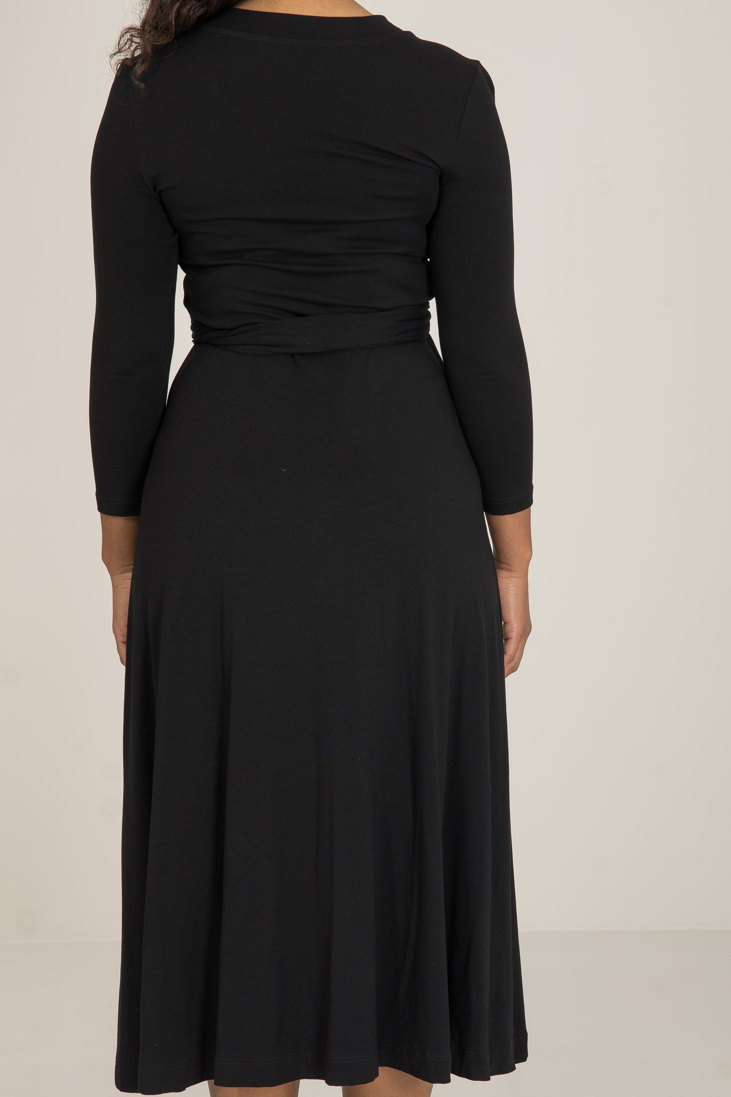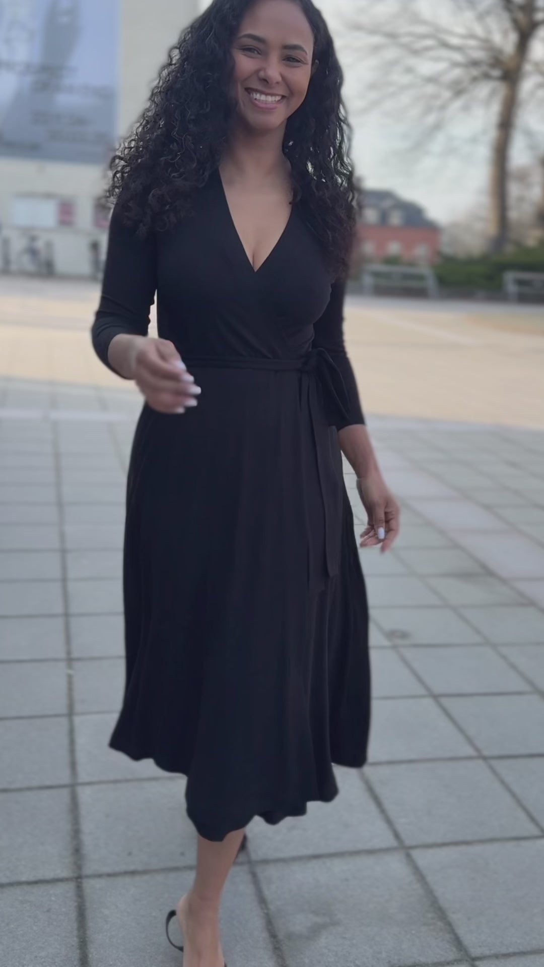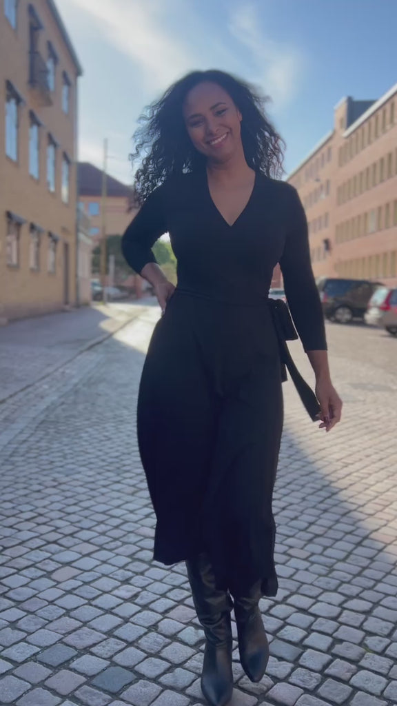 Omlottklänningen är sydd i en stretchig trikå med viskos och elastan med ett tungt fall. Kvalitén är mjuk, följsam, nopprar inte och håller både formen och färg tvätt efter tvätt. Med andra ord – här har du en klänning gjort för att användas mycket (och länge)