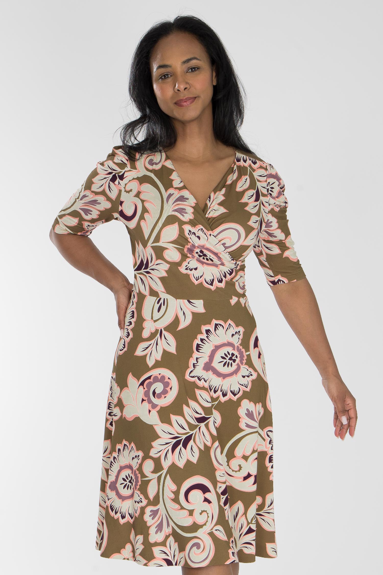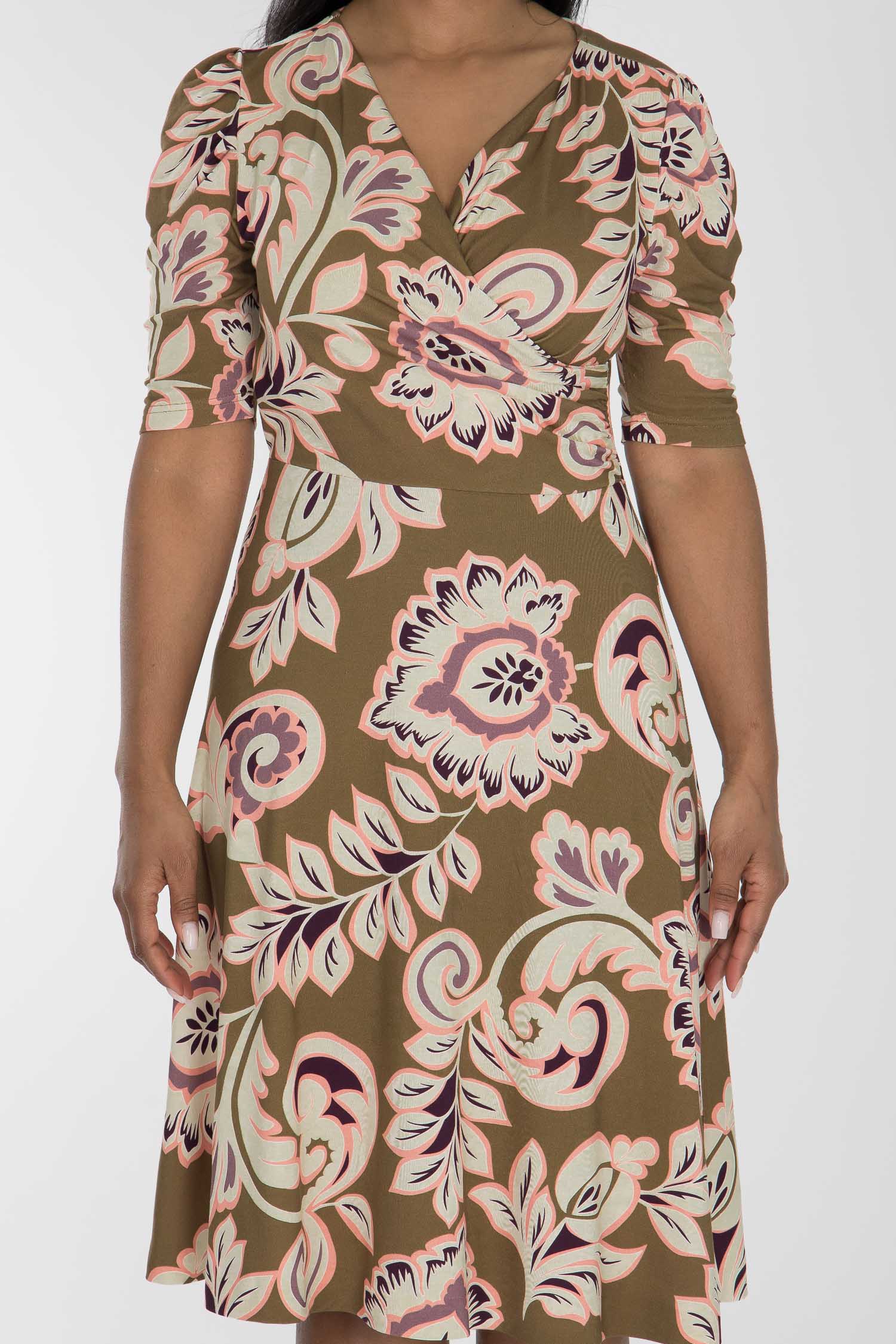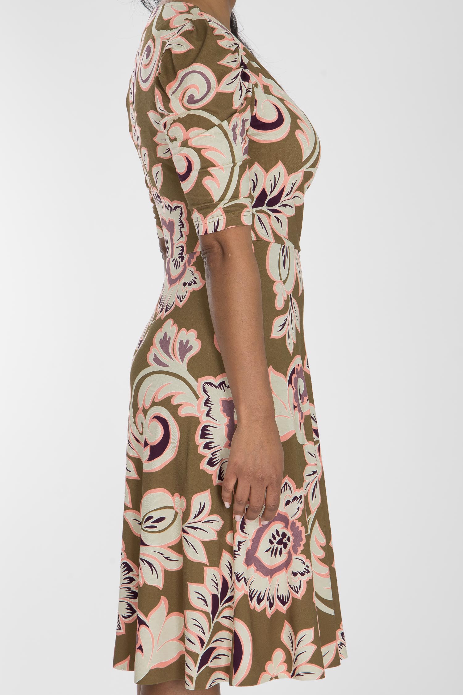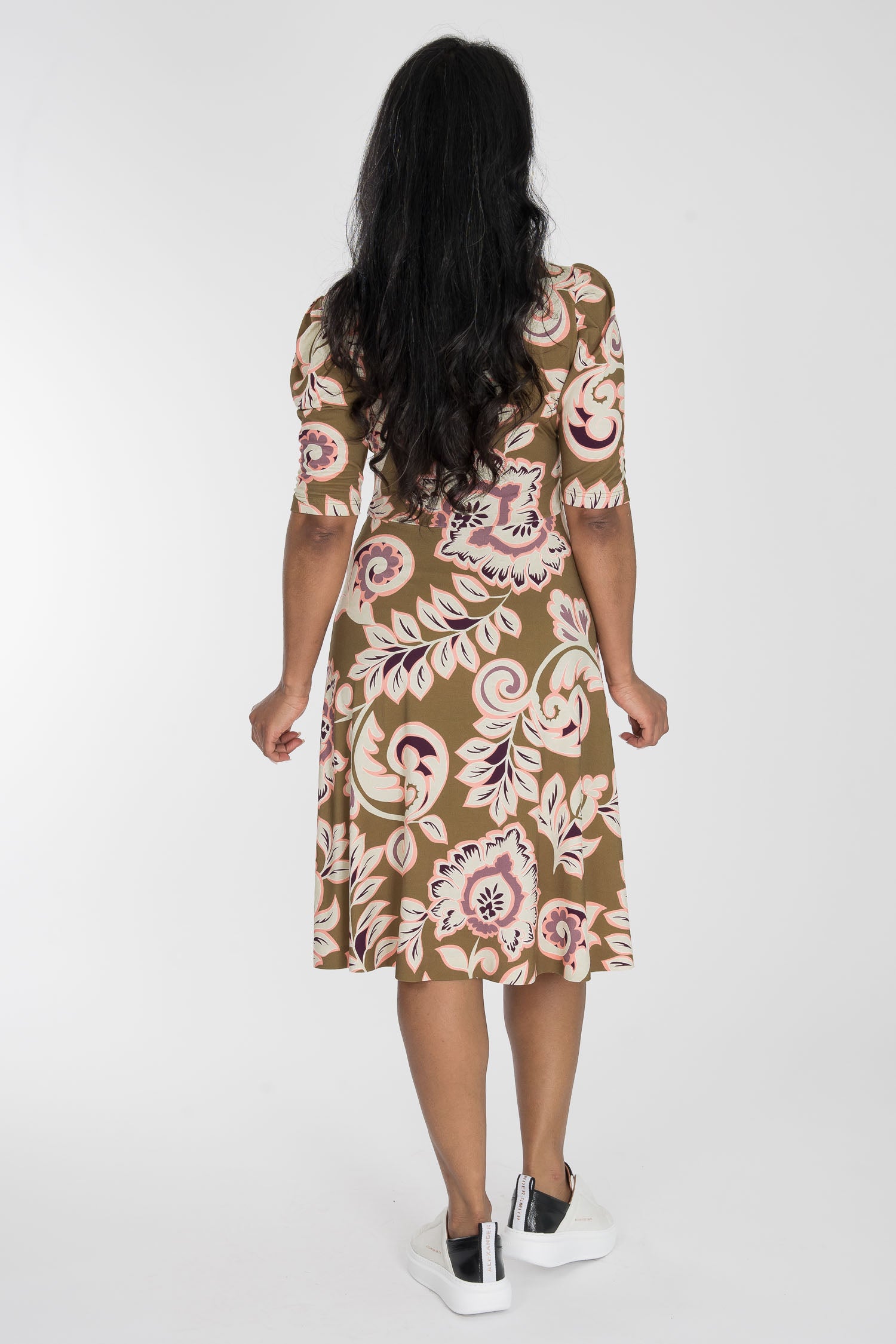 Klänningen har kort puffärm och är sydd i ett nytt mönster med varm olivgrön botten och stora blommor i rosa, offwhite och mauve. En bekväm och stilren modell som fungerar lika bra till vardag som till mer uppklädda tillfällen. Finns även i knälång längd.