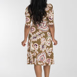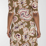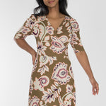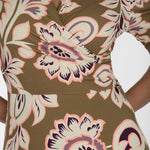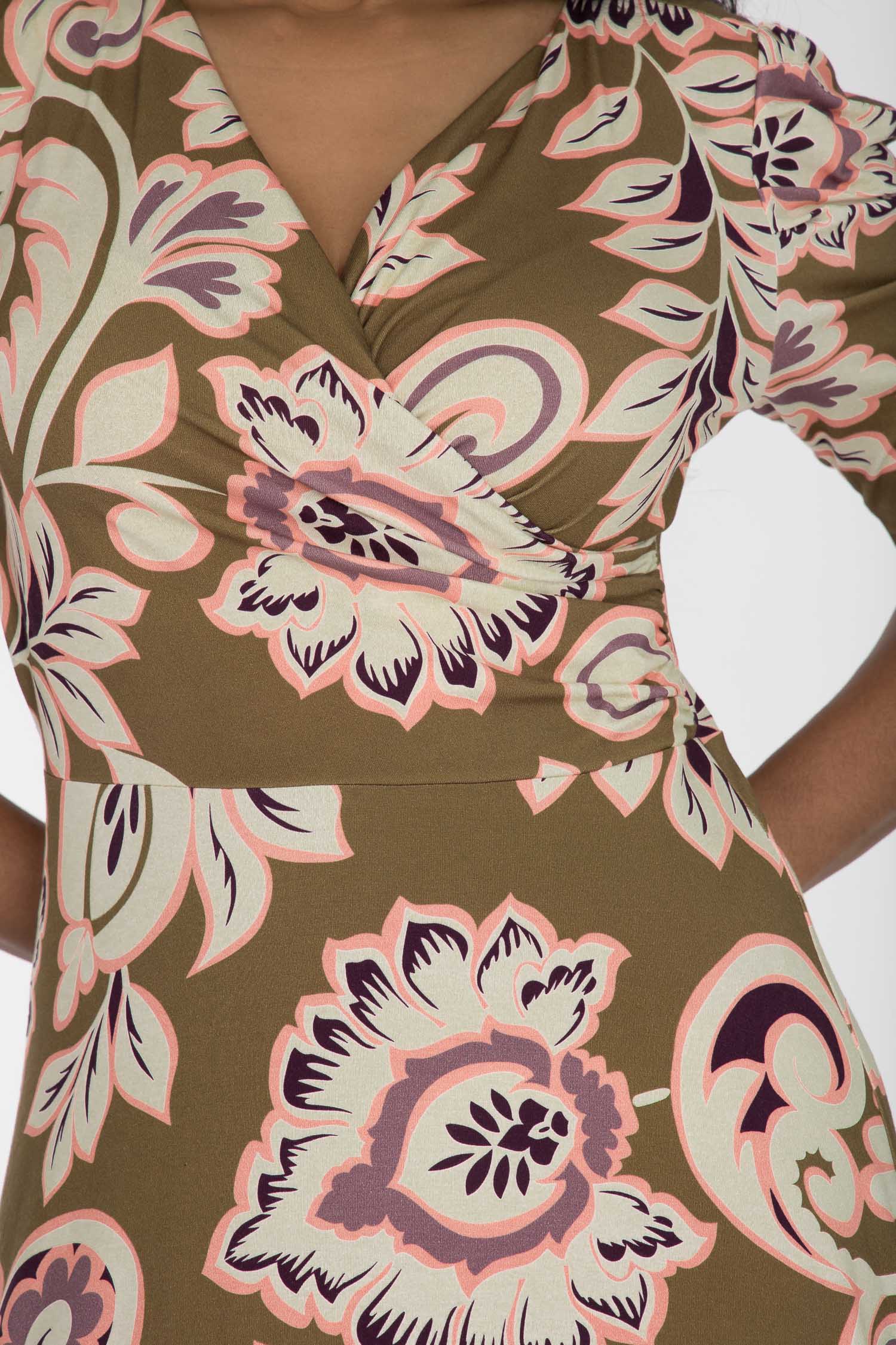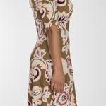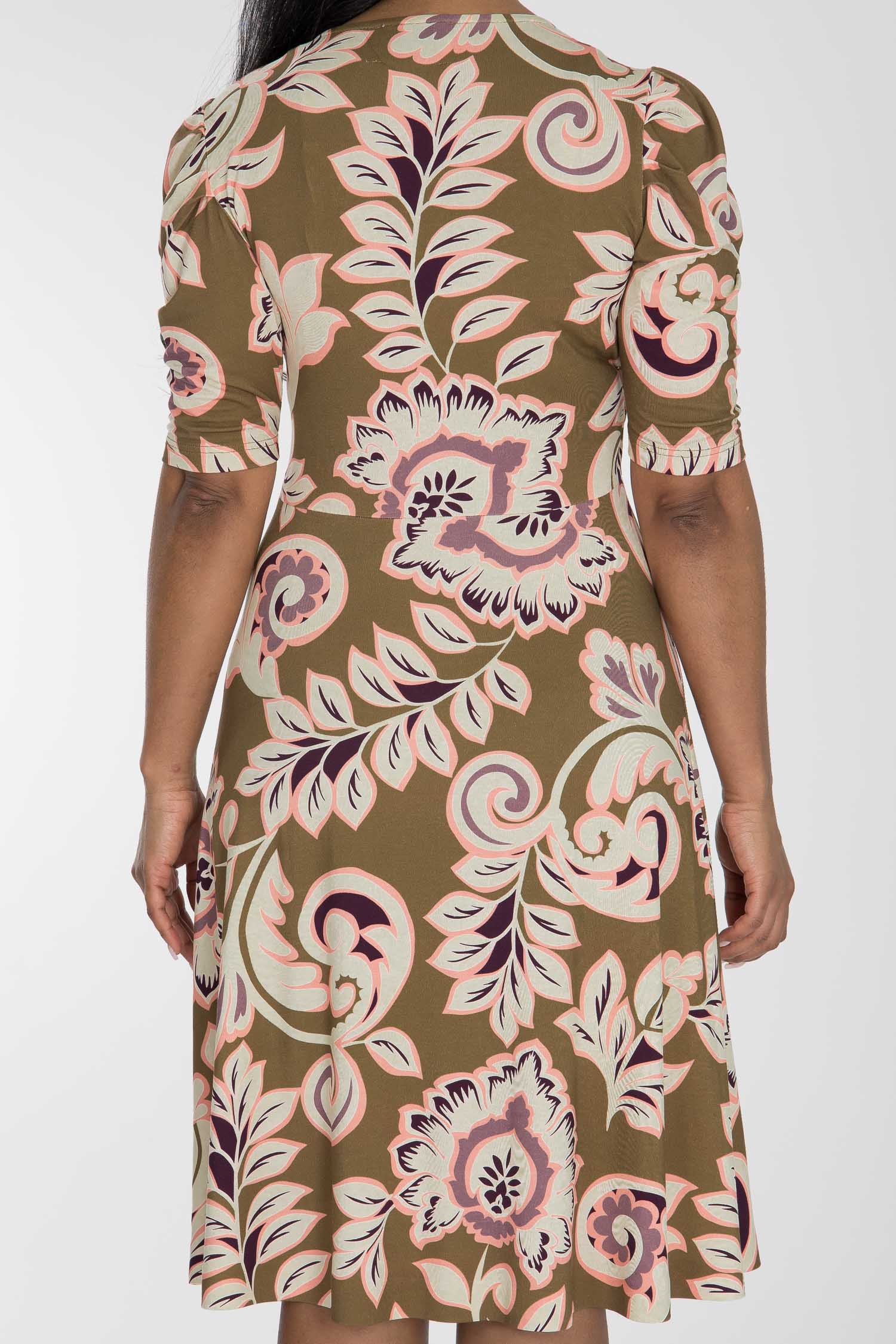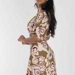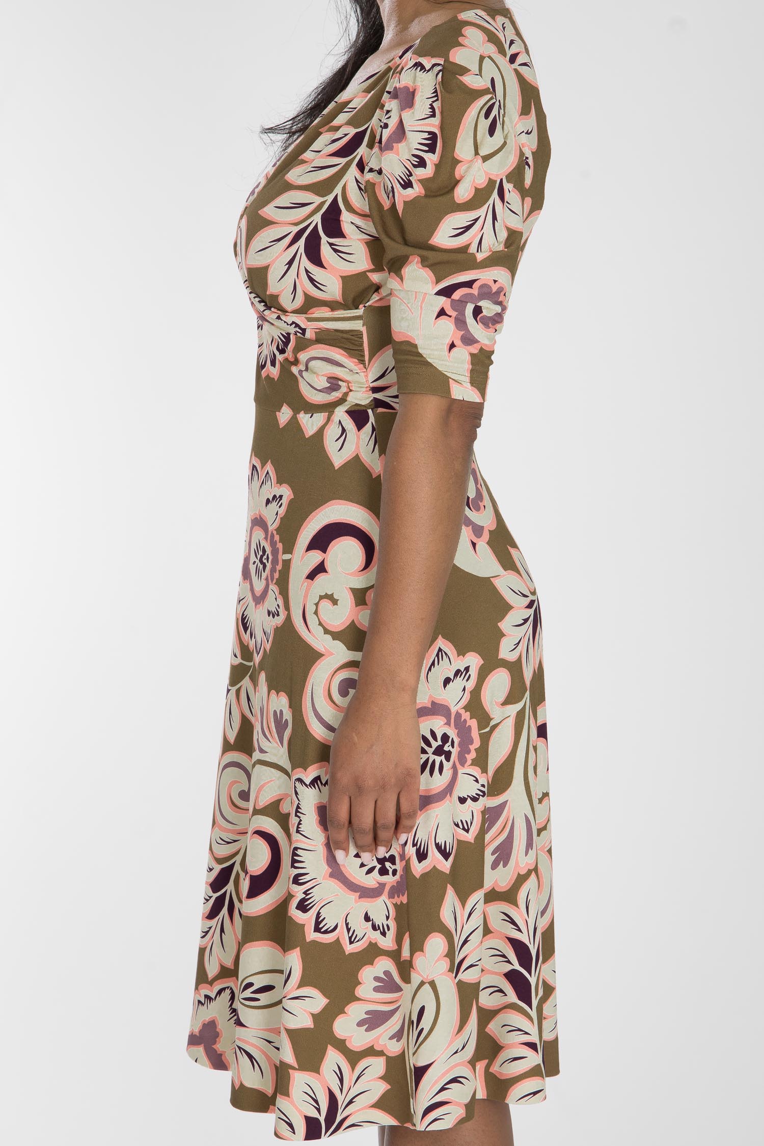 Klänningen har kort puffärm och är sydd i ett nytt mönster med varm olivgrön botten och stora blommor i rosa, offwhite och mauve. En bekväm och stilren modell som fungerar lika bra till vardag som till mer uppklädda tillfällen. Finns även i knälång längd.