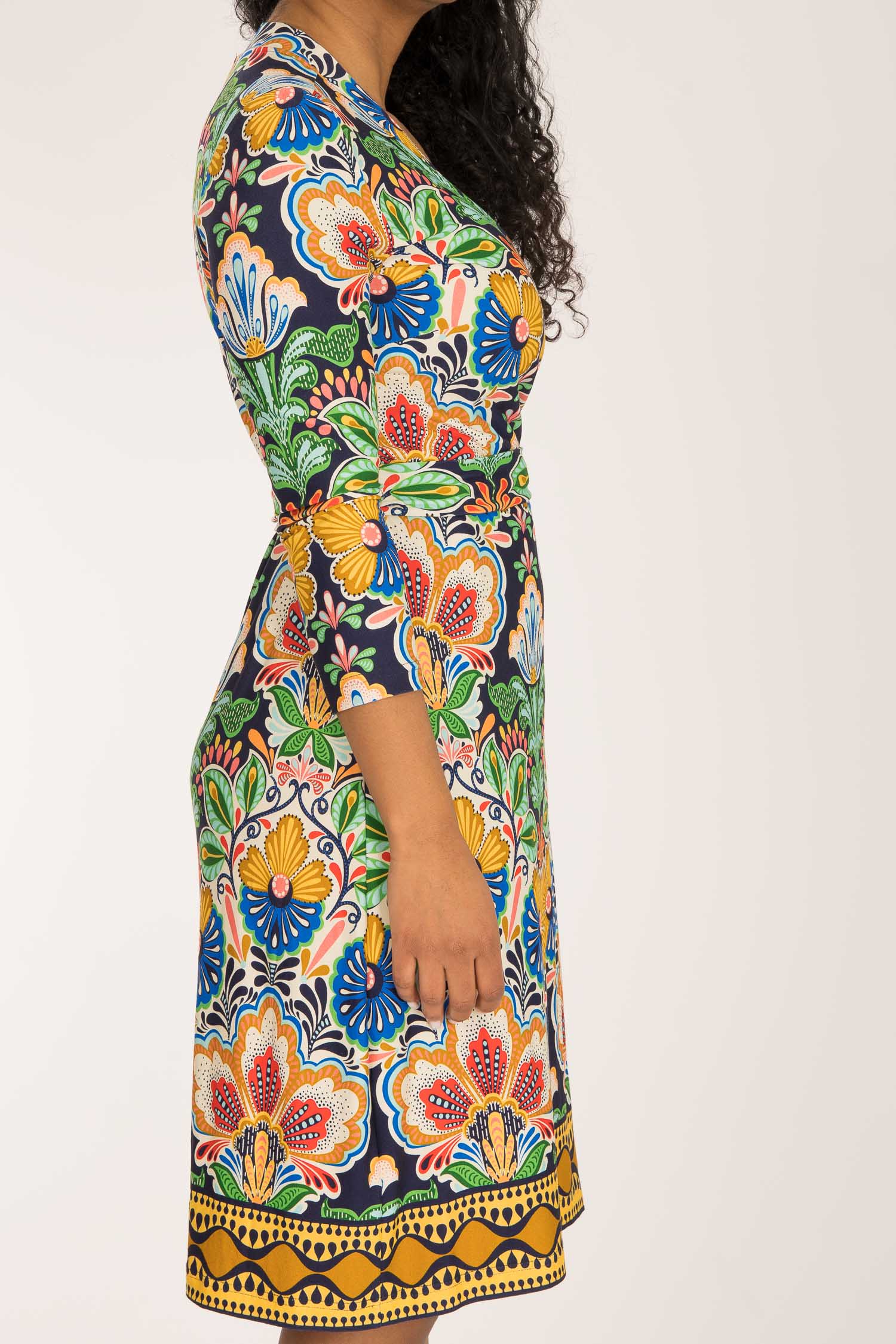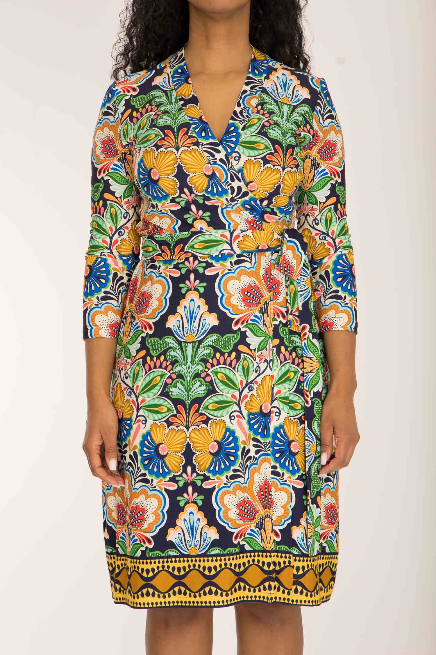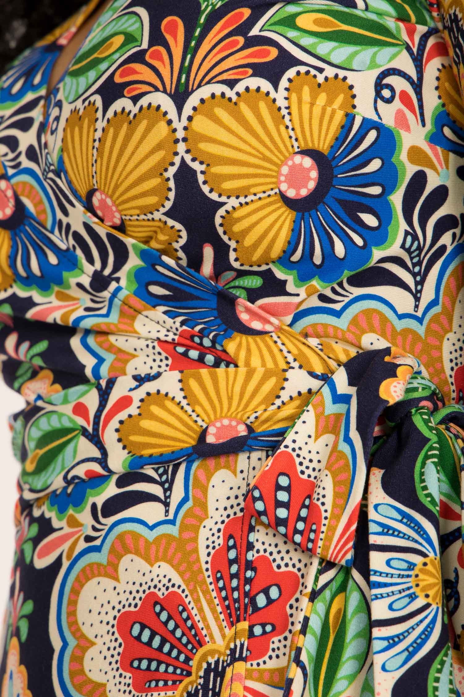 Slim Wrap – Omlottklänning med rakare kjol och färgstarkt folklore-mönster.
