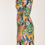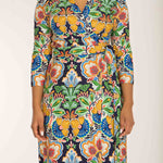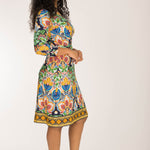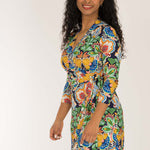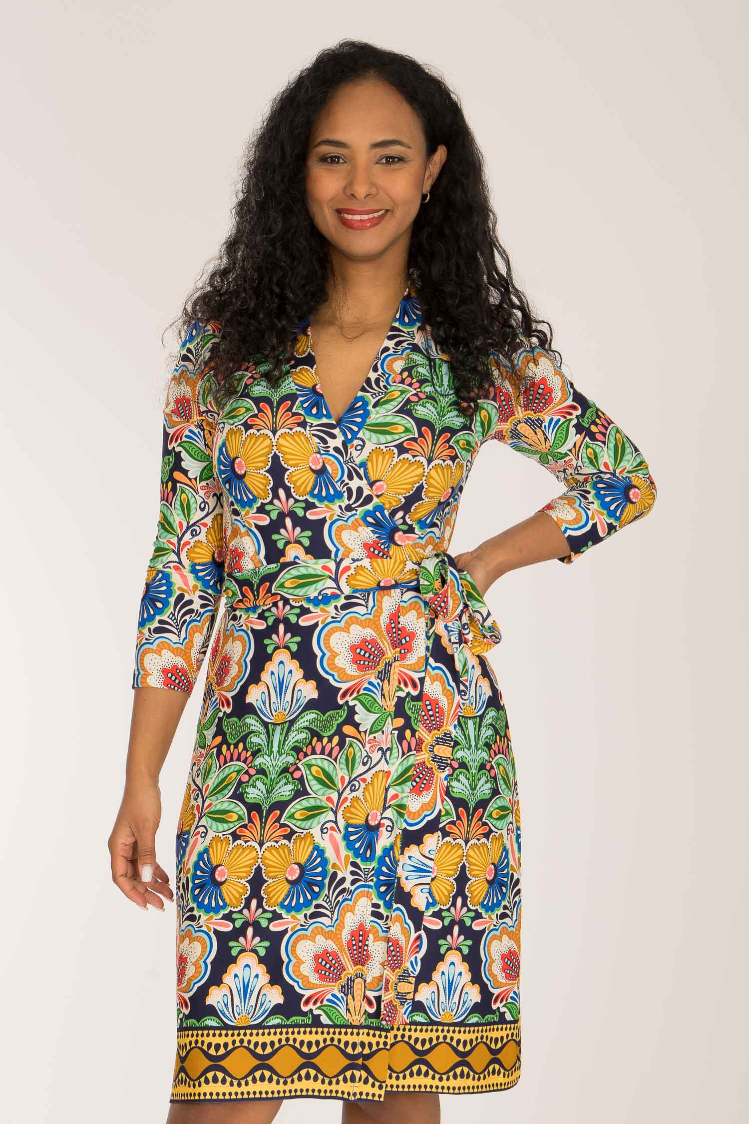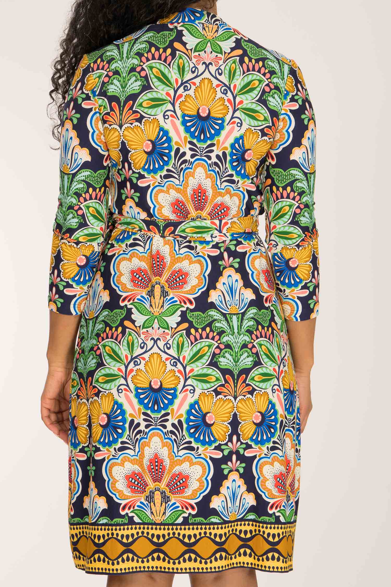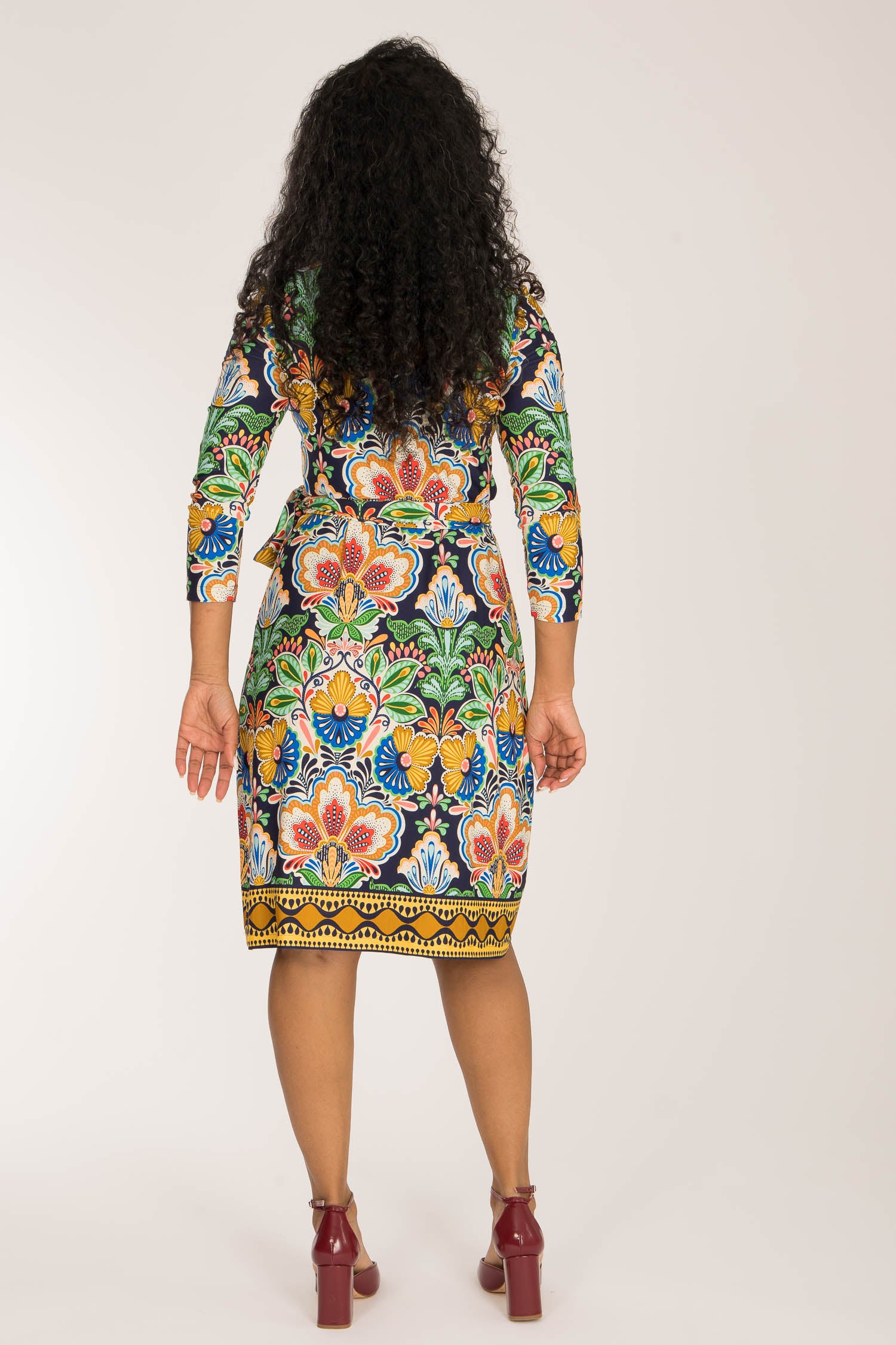 Slim Wrap – Omlottklänning med rakare kjol och färgstarkt folklore-mönster.
