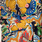 Mönstret är en färgsprakande folkloredröm med pigga nyanser av grönt, gult, rött och blått på en djup marinblå botten. Nertill pryds kjolen av en dekorativ bård som ger en fin inramning och förstärker den bohemiskt eleganta känslan.