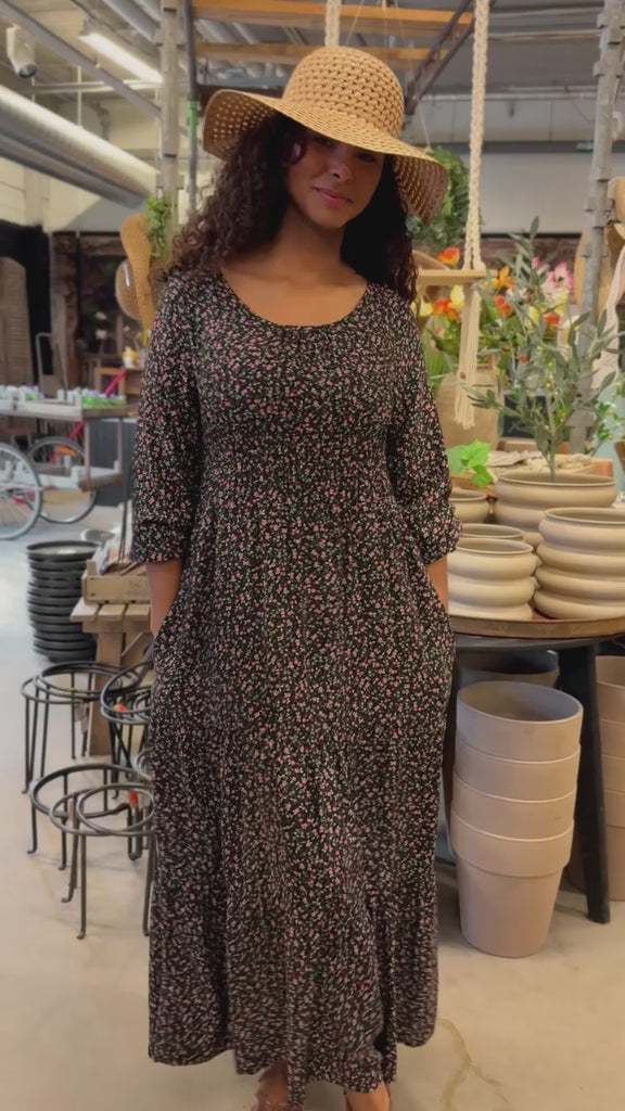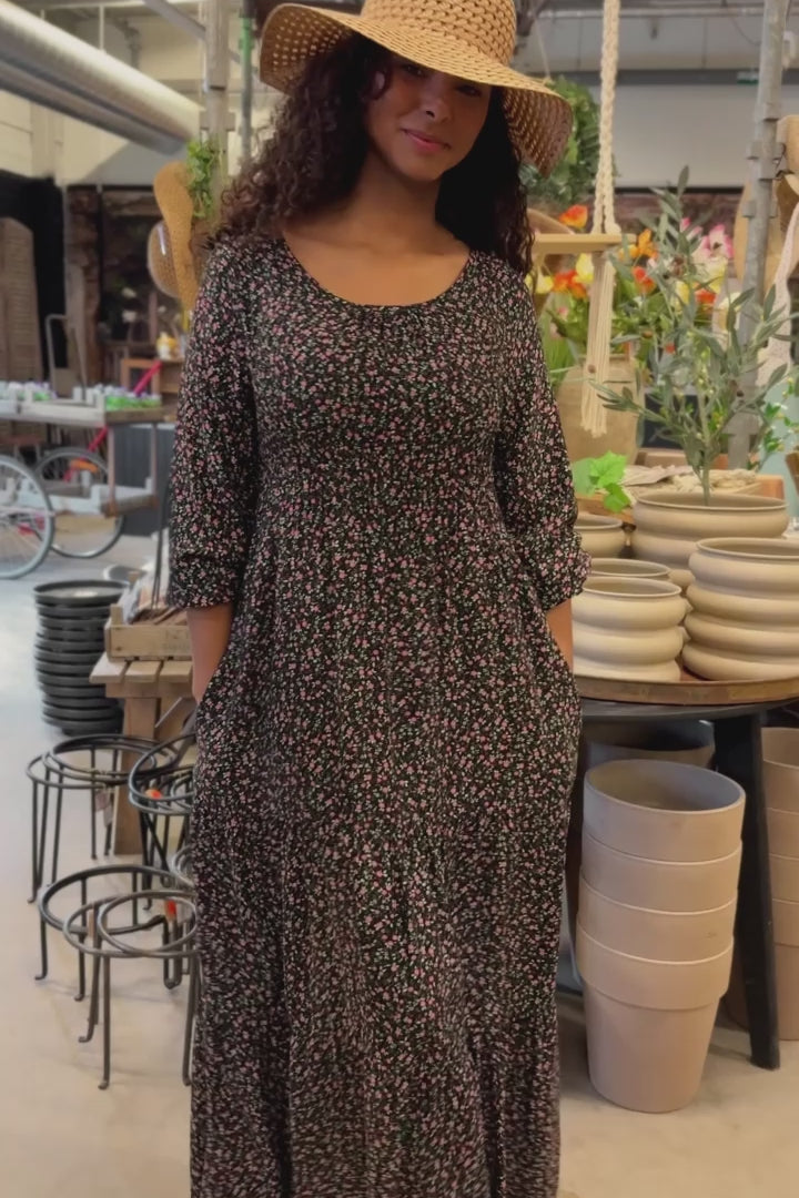 Soft viscose smock midi dress - Black-Pink flower