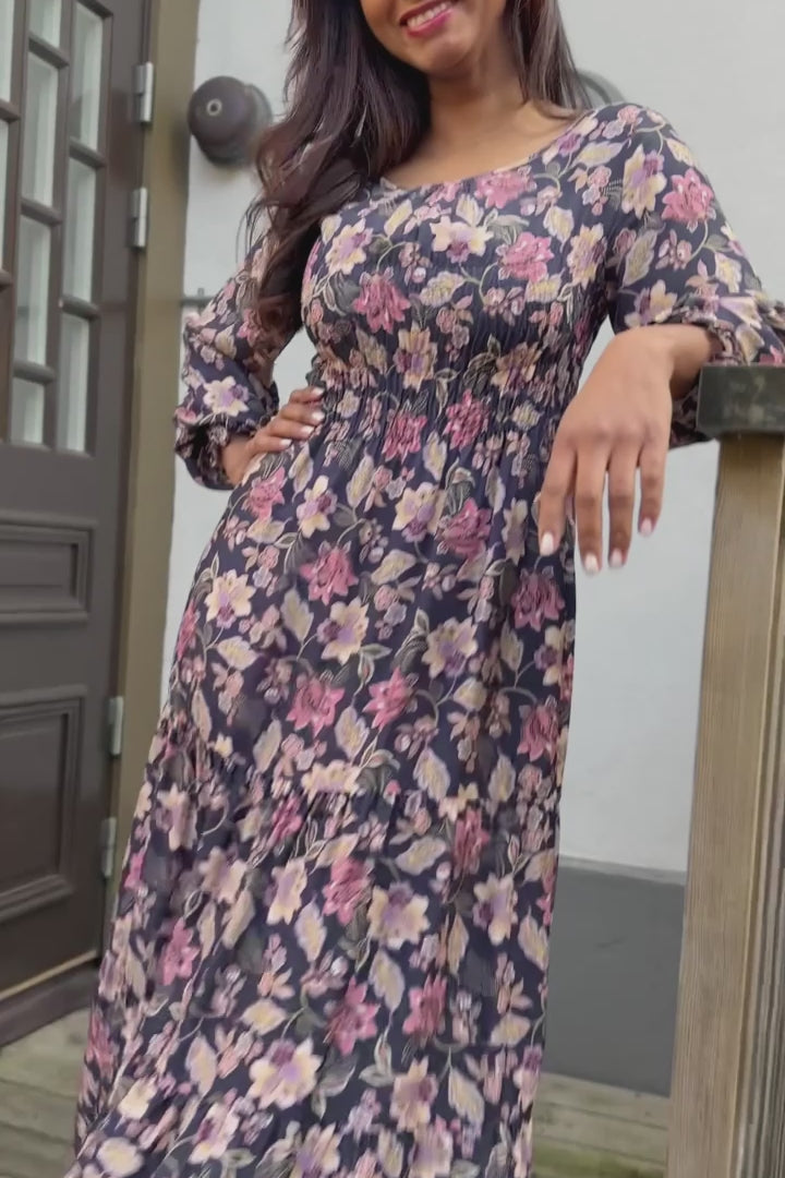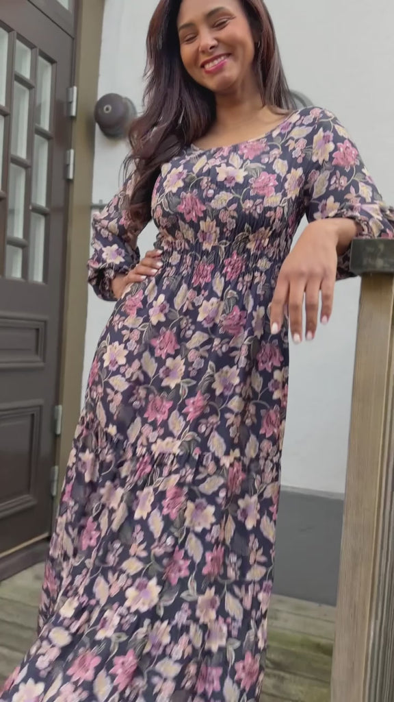 Soft viscose smock midi dress - Navy pink flower