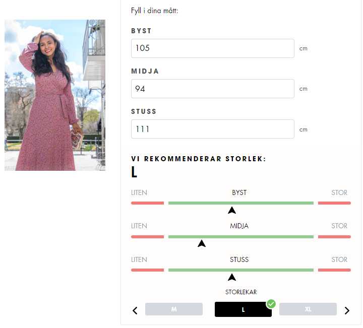 Klicka på "HITTA DIN STORLEK" vid klänningen så visas guiden där du fyller i dina mått. När du har fyllt i dina mått så får du fram en storlek vi rekommenderar MEN du kan ofta välja mellan 2 storlekar. Om du KLICKAR på storlekarna så ser du resultatet om den går mot LITEN eller STOR. Här väljer DU den passform som du trivs bäst i, tajtare eller lite lösare. Hamnar pilen på rött kommer den inte att passa bra.