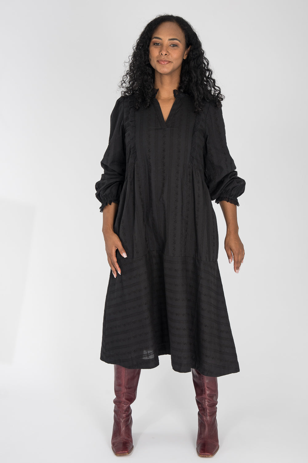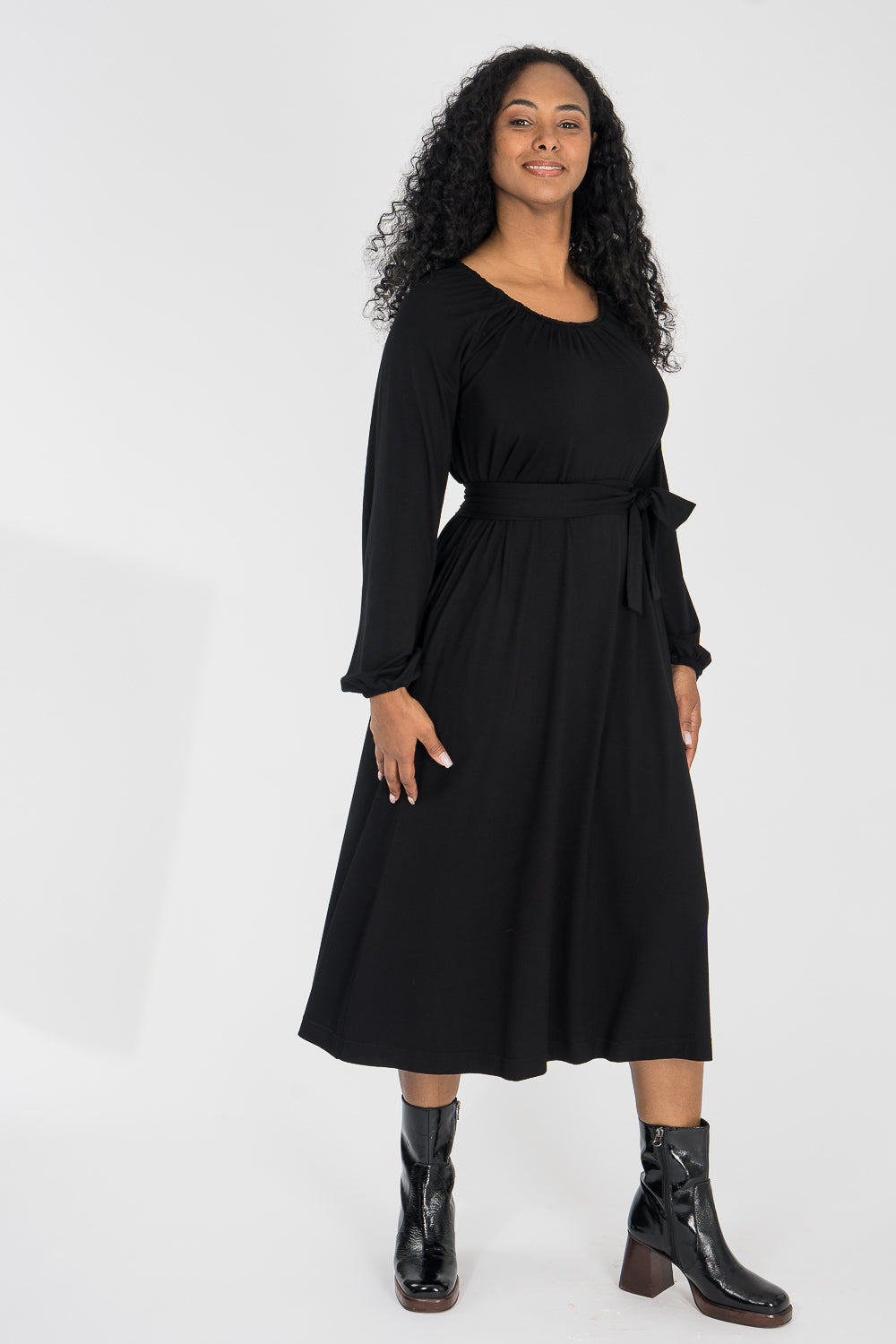 En lyxig trikåkvalitet med subtil glans och en lätt festkänsla. Tyget är en stretchig viskosjersey med mjukt fall, följsam känsla mot huden och en lite blank yta som fångar ljuset på ett elegant sätt. Den diskreta lystern ger klänningarna en elegant karaktär utan att de känns för uppklädda – perfekt för tillfällen där du vill känna dig lite extra fin, men fortfarande bekväm.
