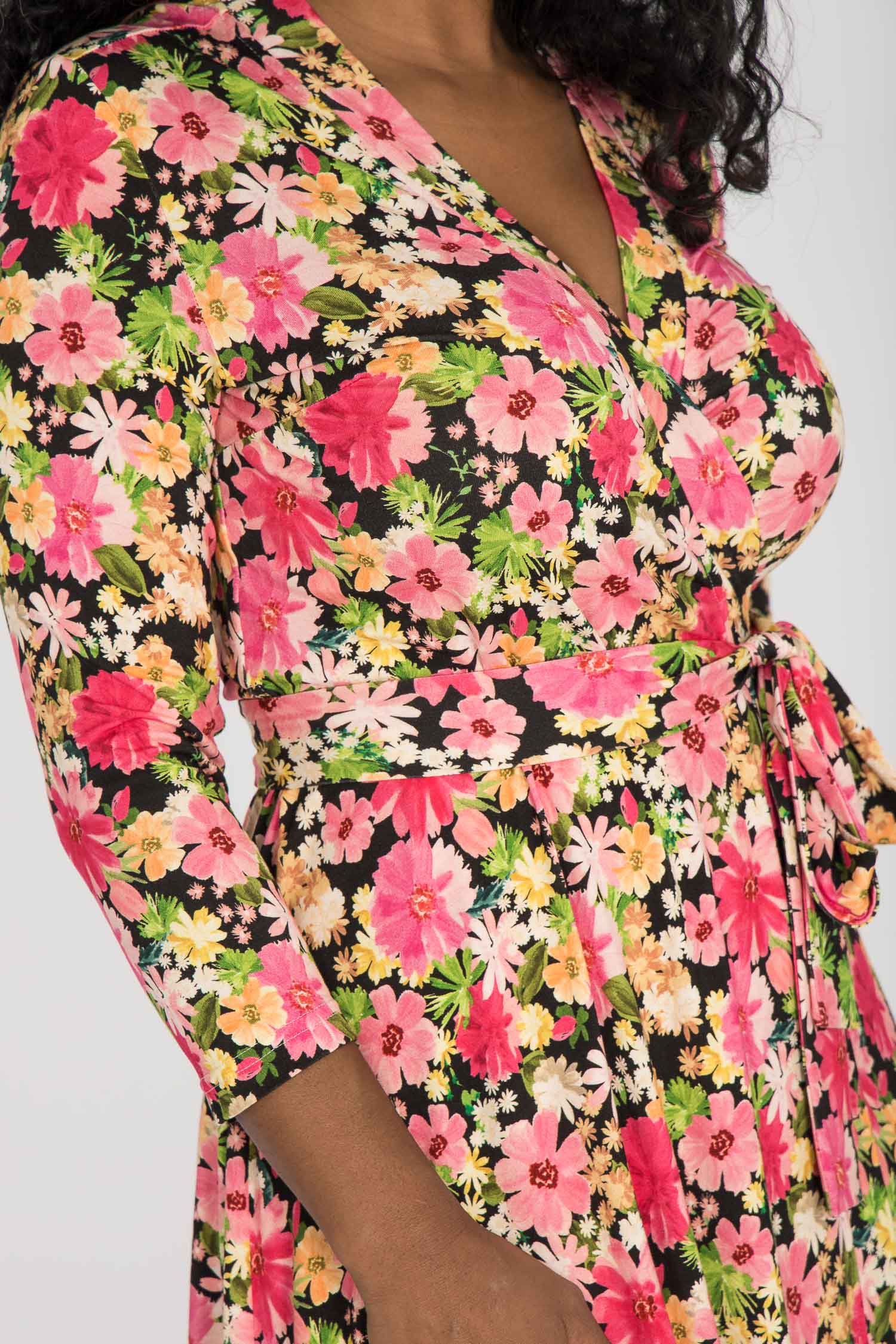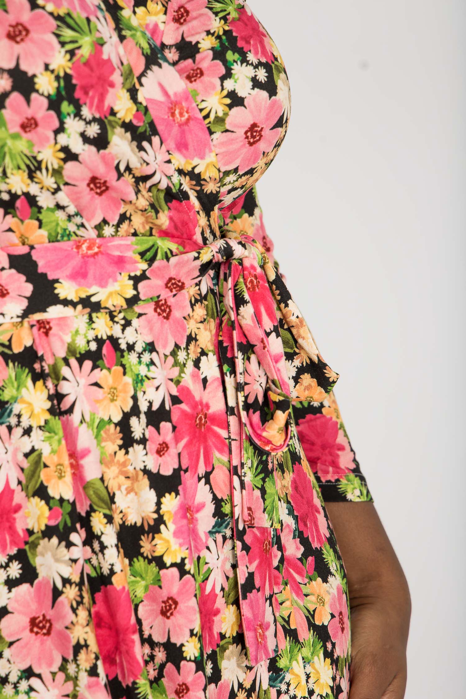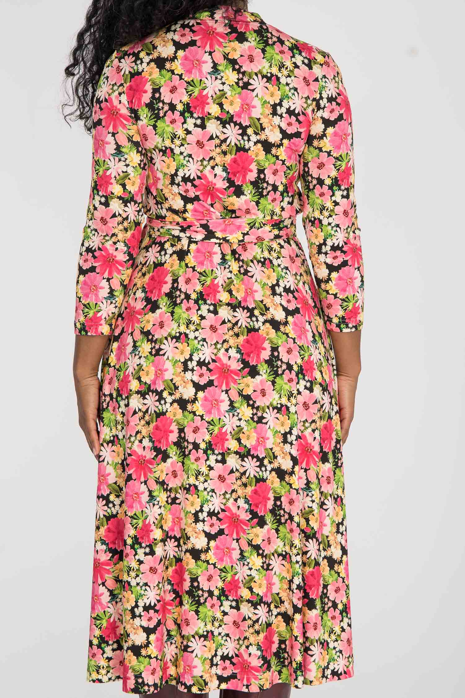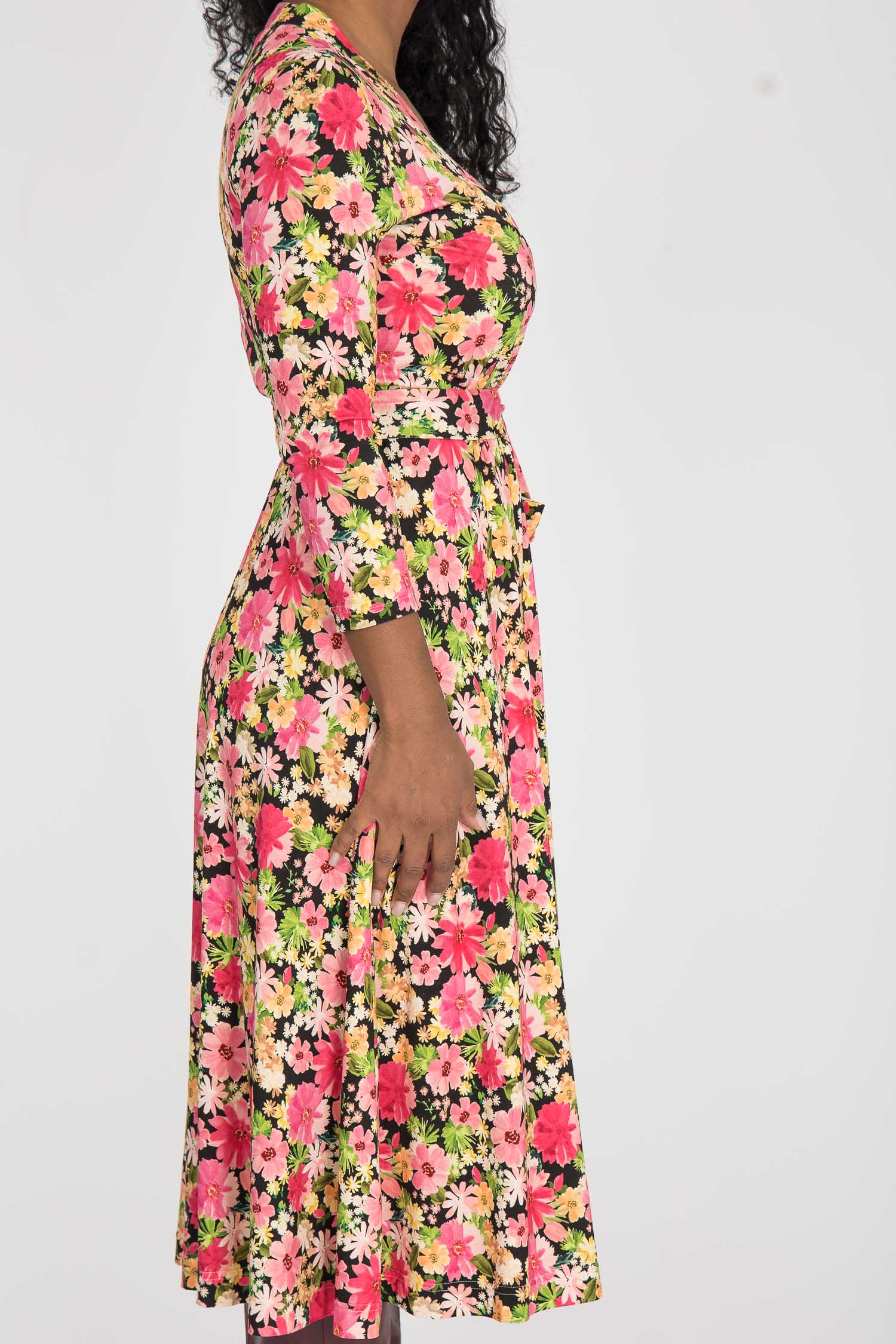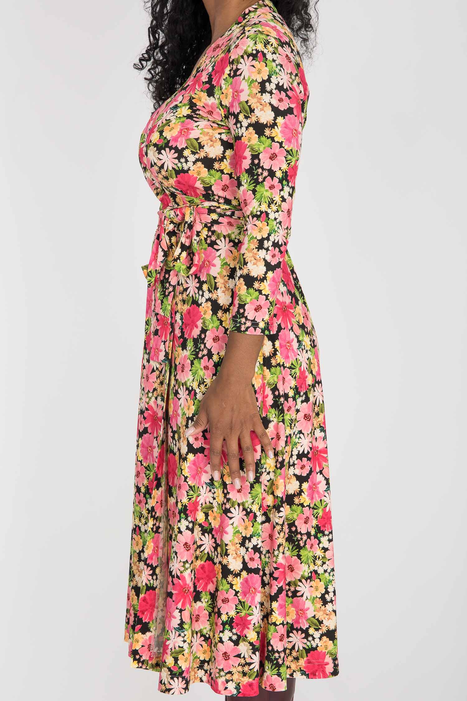 Mönstret är fullt av färgstarka blommor i rosa, gult och grönt på mörk botten – en klänning som piggar upp garderoben och funkar lika bra till vardags som när du vill klä upp dig lite extra.