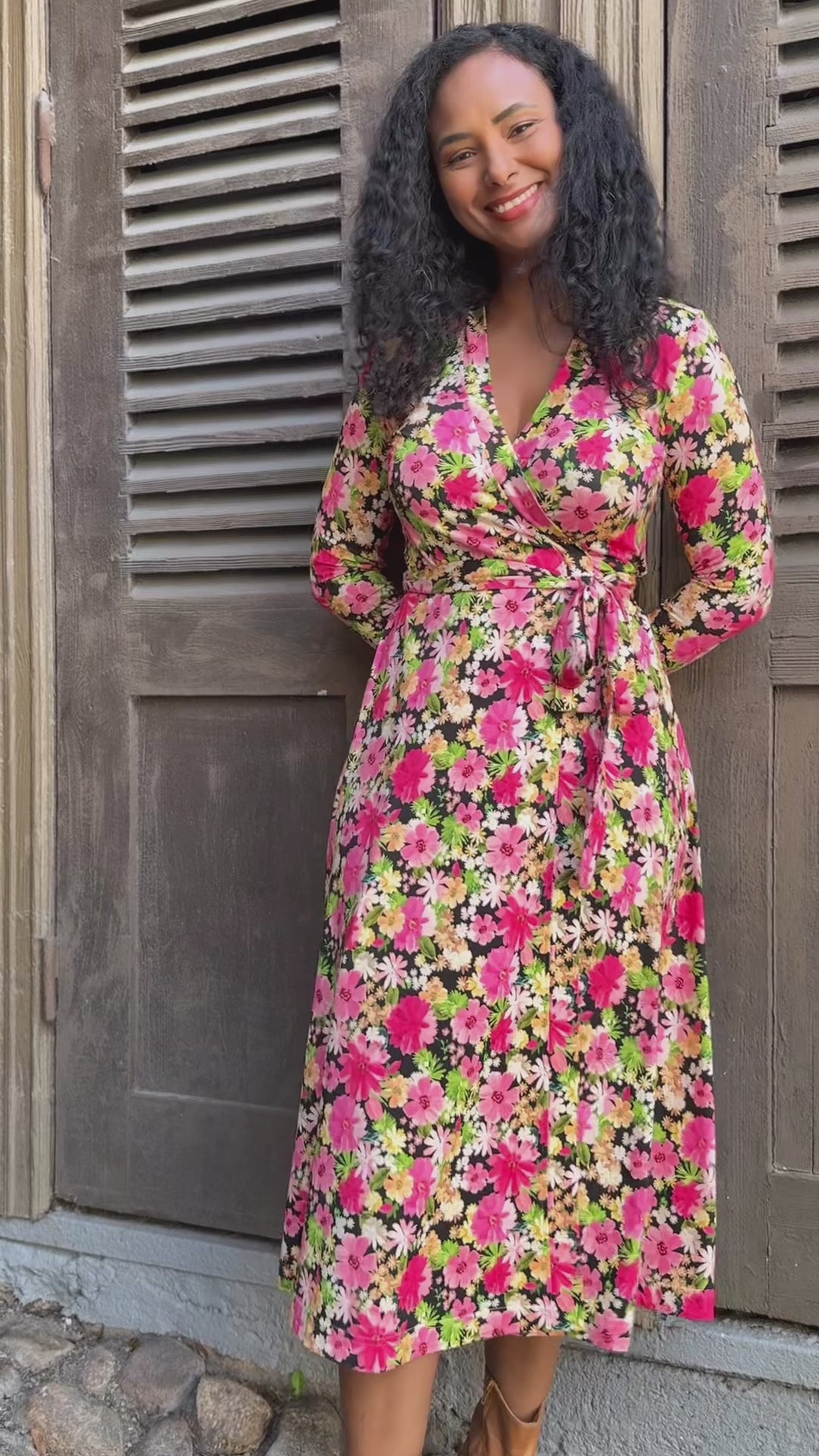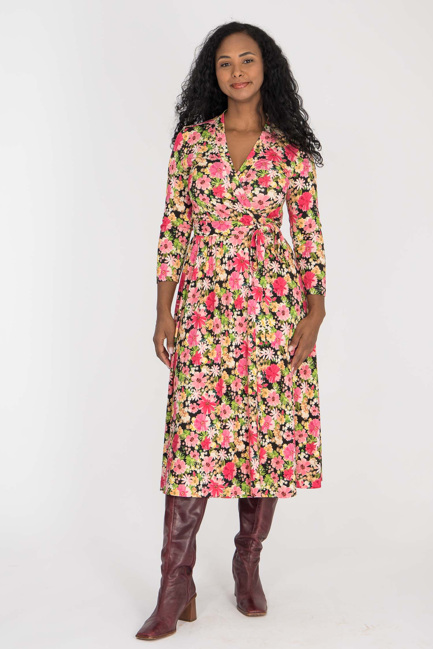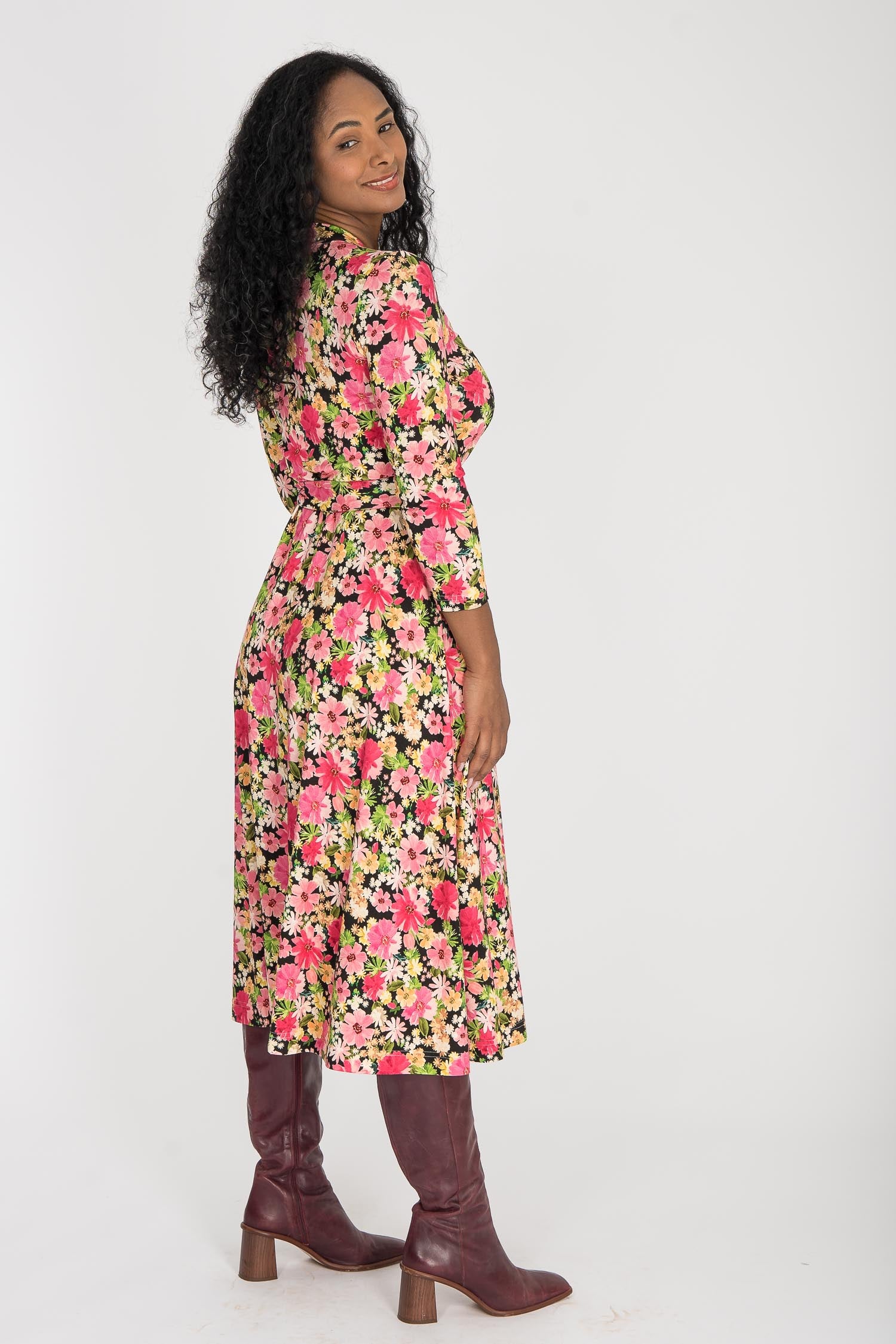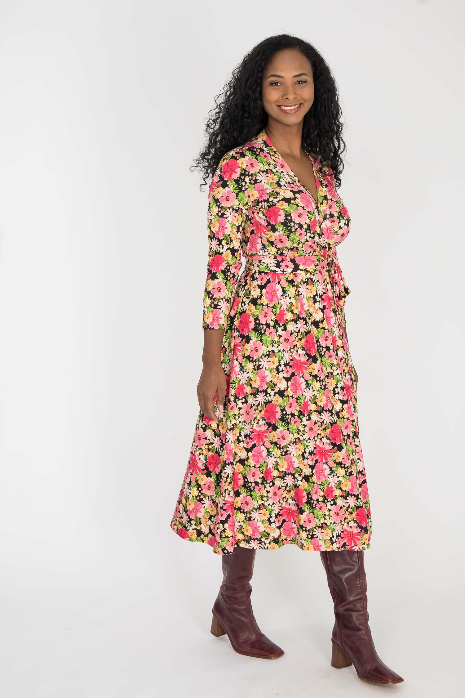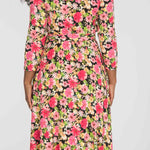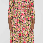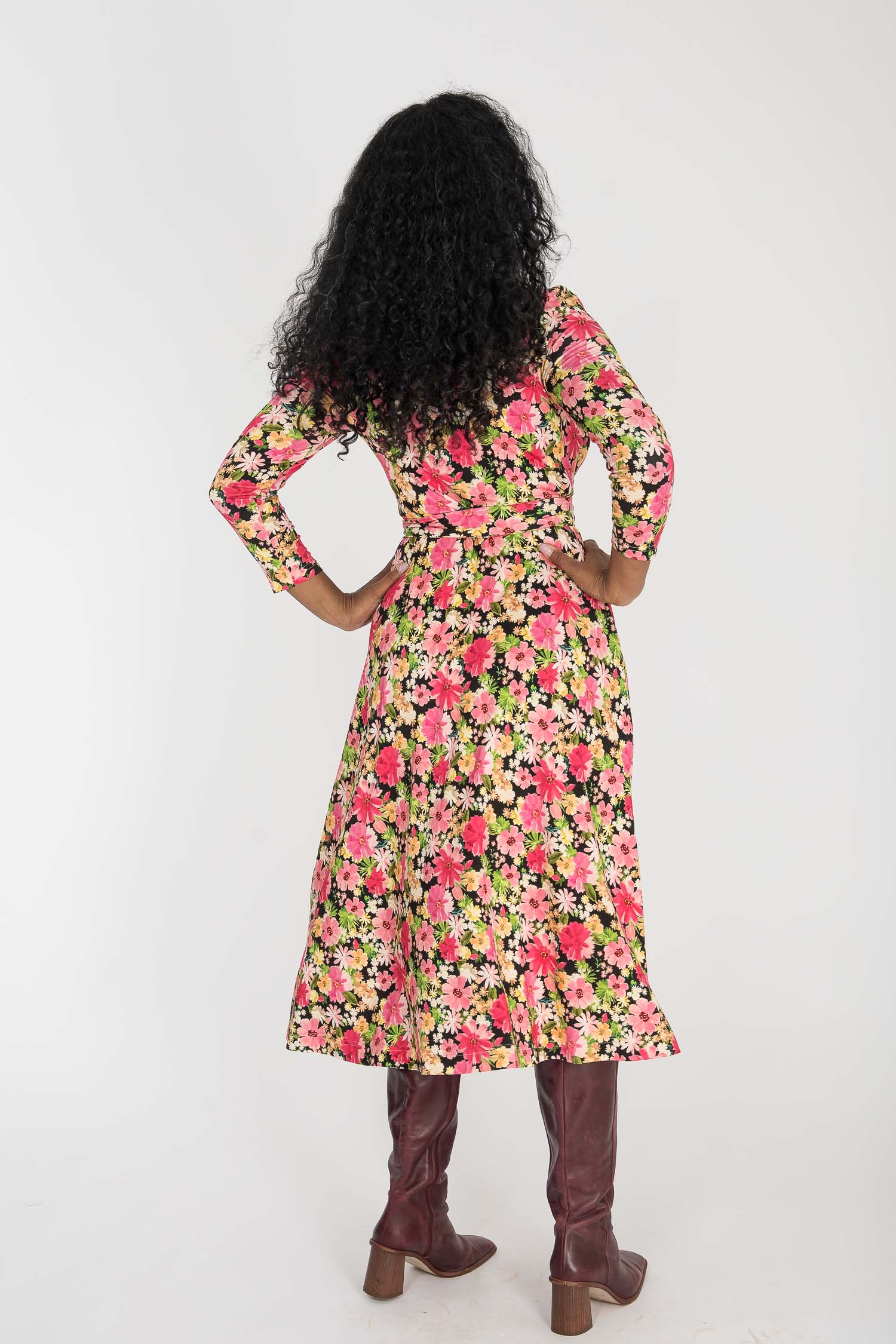 Mönstret är fullt av färgstarka blommor i rosa, gult och grönt på mörk botten – en klänning som piggar upp garderoben och funkar lika bra till vardags som när du vill klä upp dig lite extra.