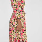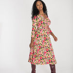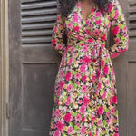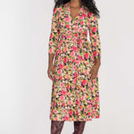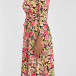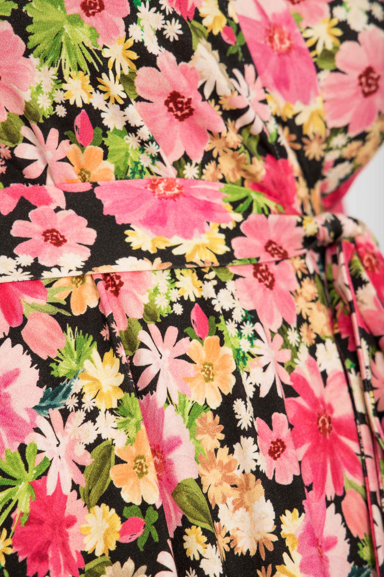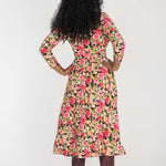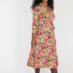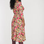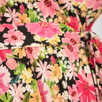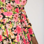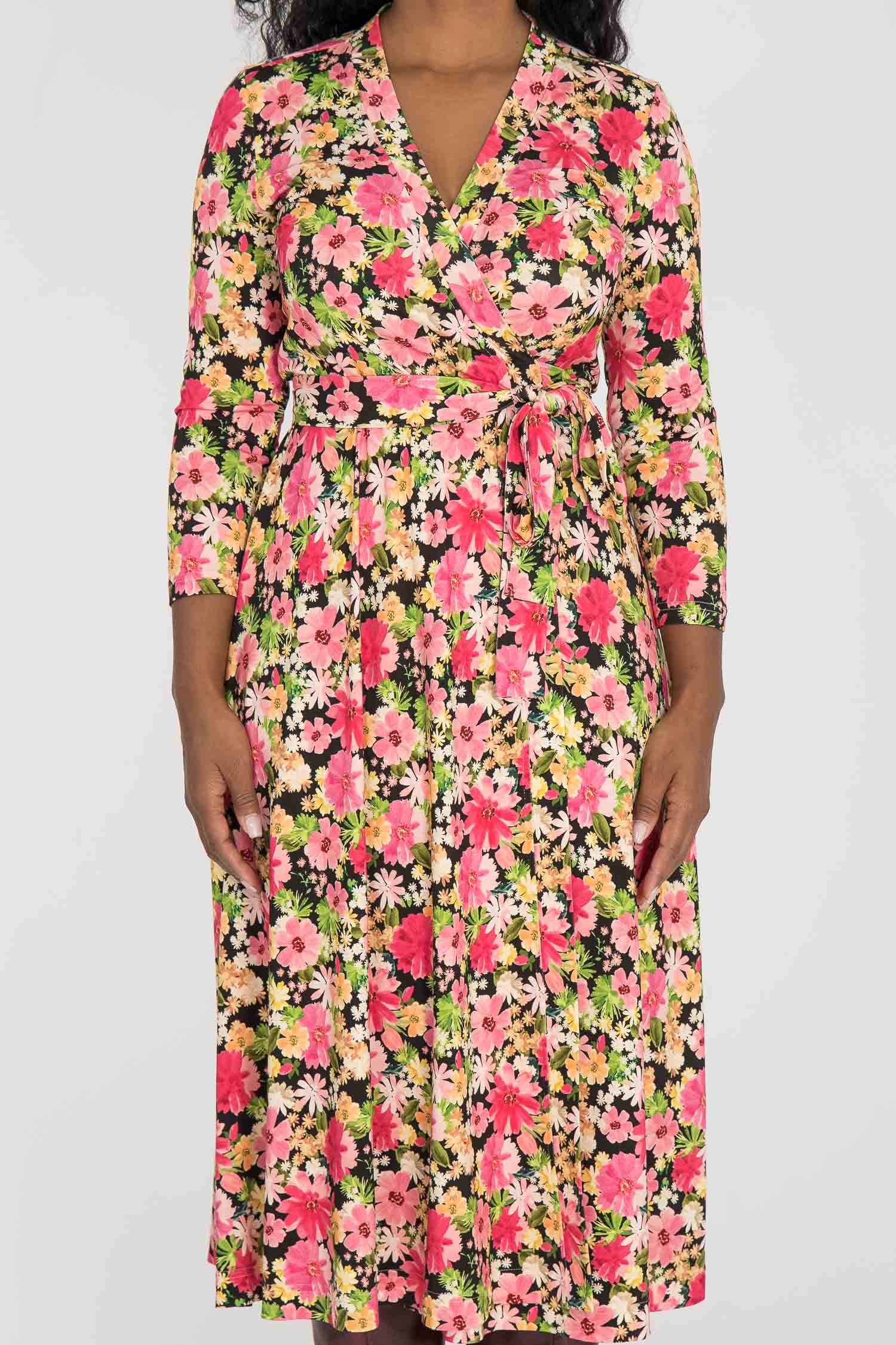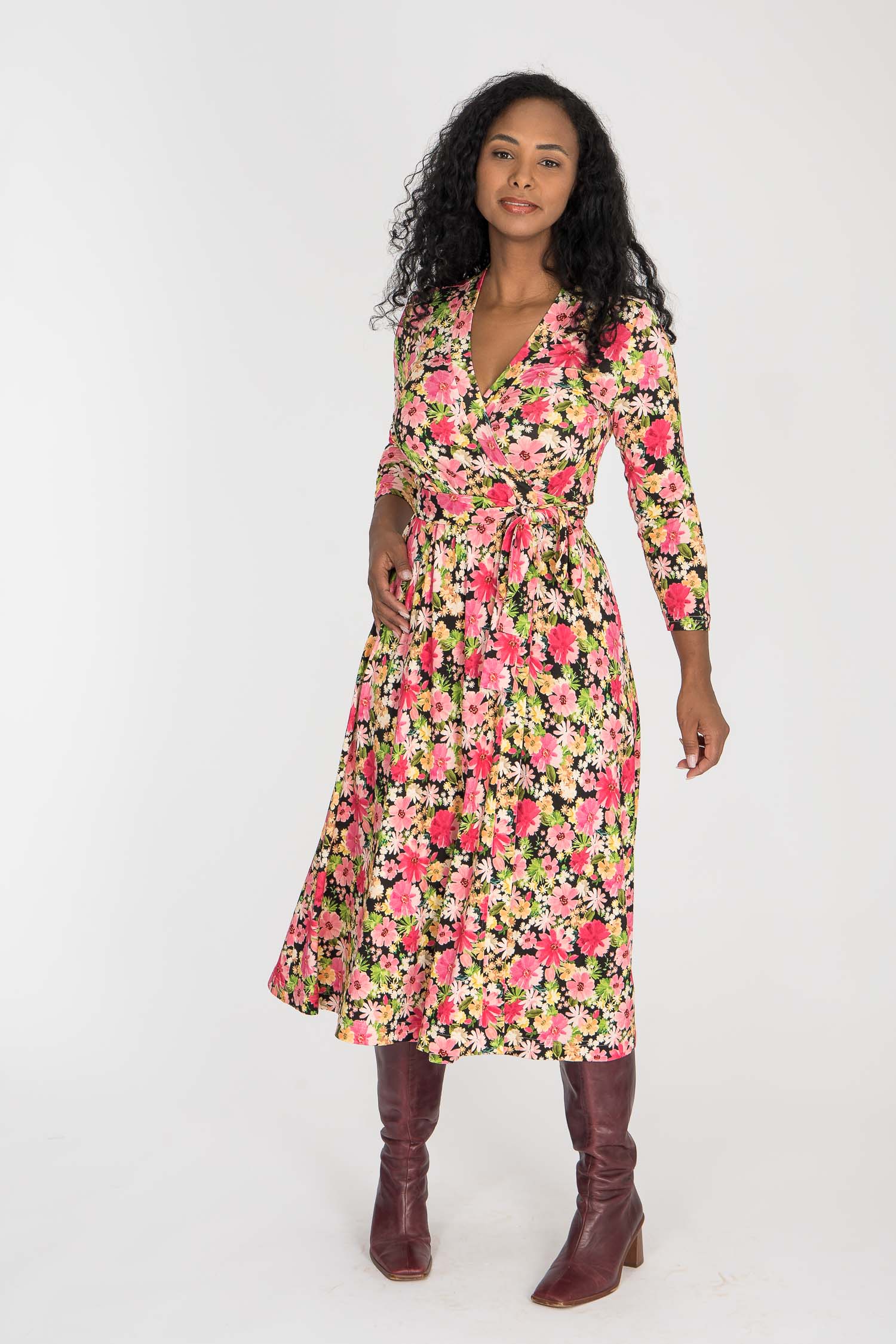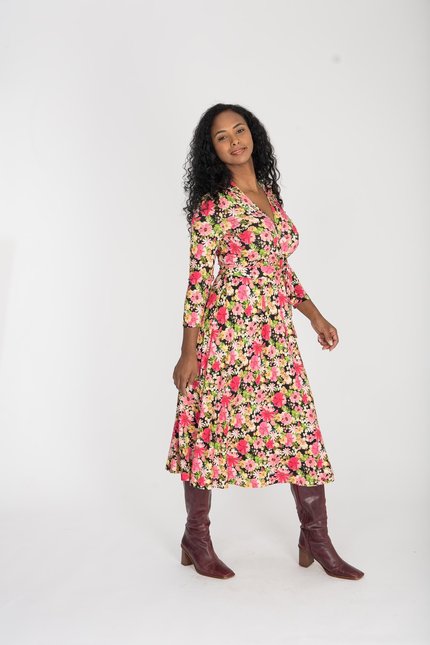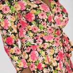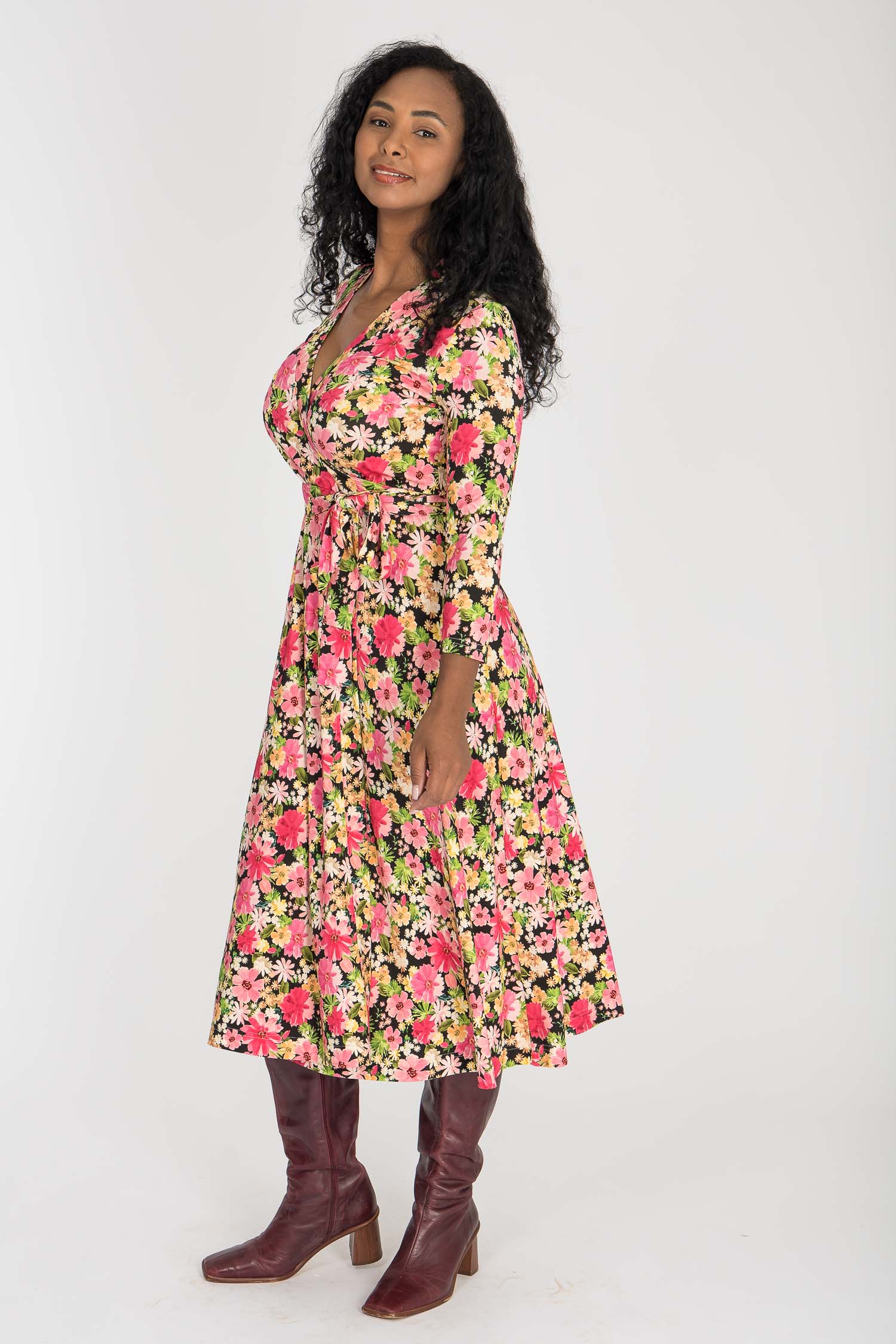 Mönstret är fullt av färgstarka blommor i rosa, gult och grönt på mörk botten – en klänning som piggar upp garderoben och funkar lika bra till vardags som när du vill klä upp dig lite extra.