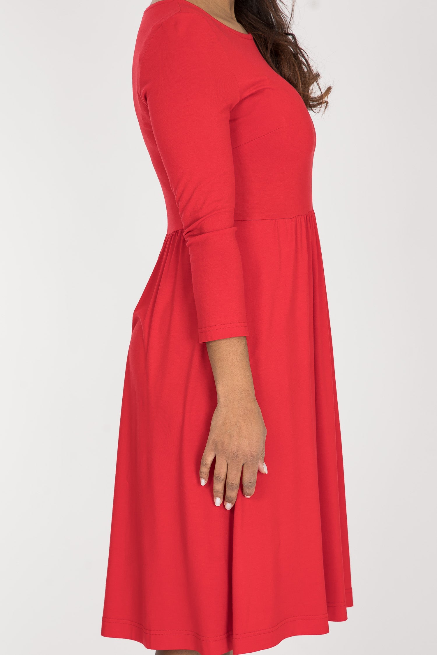Vår omtyckta Ideal dress finns äntligen även i enfärgat, med samma sköna passform. Klänningen är sydd i mjuk viskostrikå med tungt, fint fall. Den är figurnära upptill, med en vidare midja och avskärning ganska högt upp, och en vippig kjol som faller fint runt kroppen. Perfekt när du vill känna dig bekväm men ändå klädd.