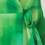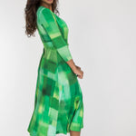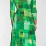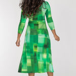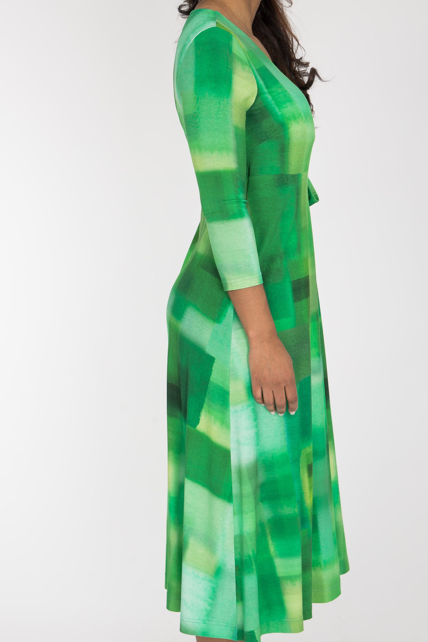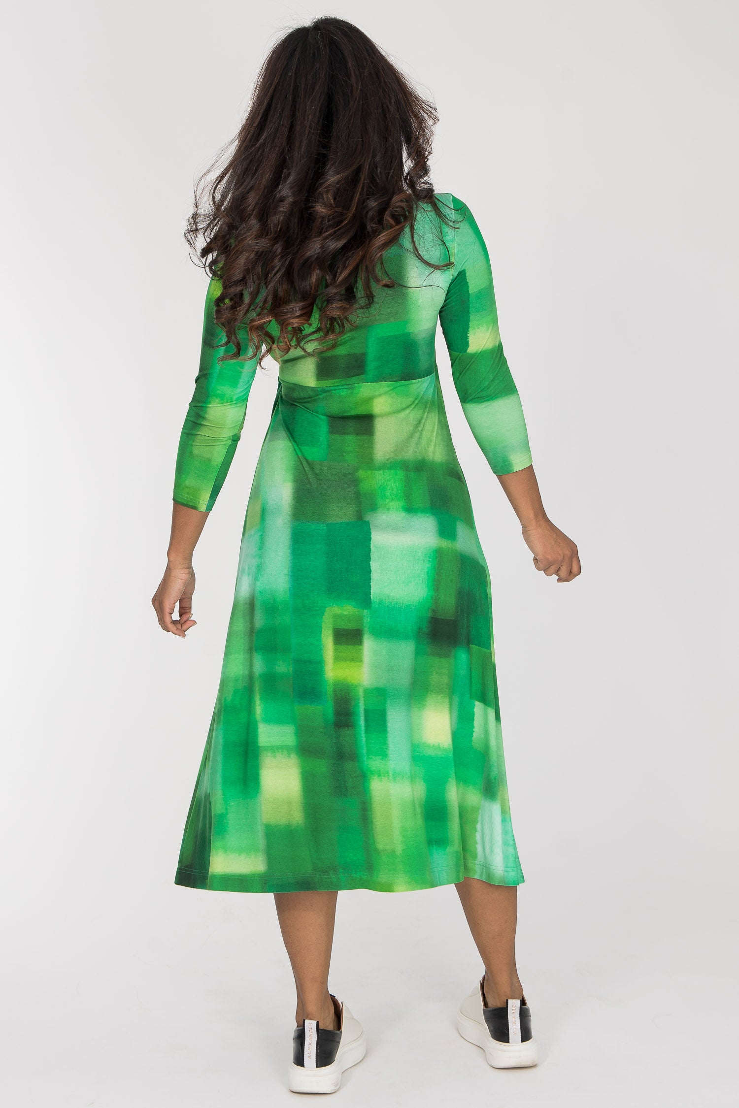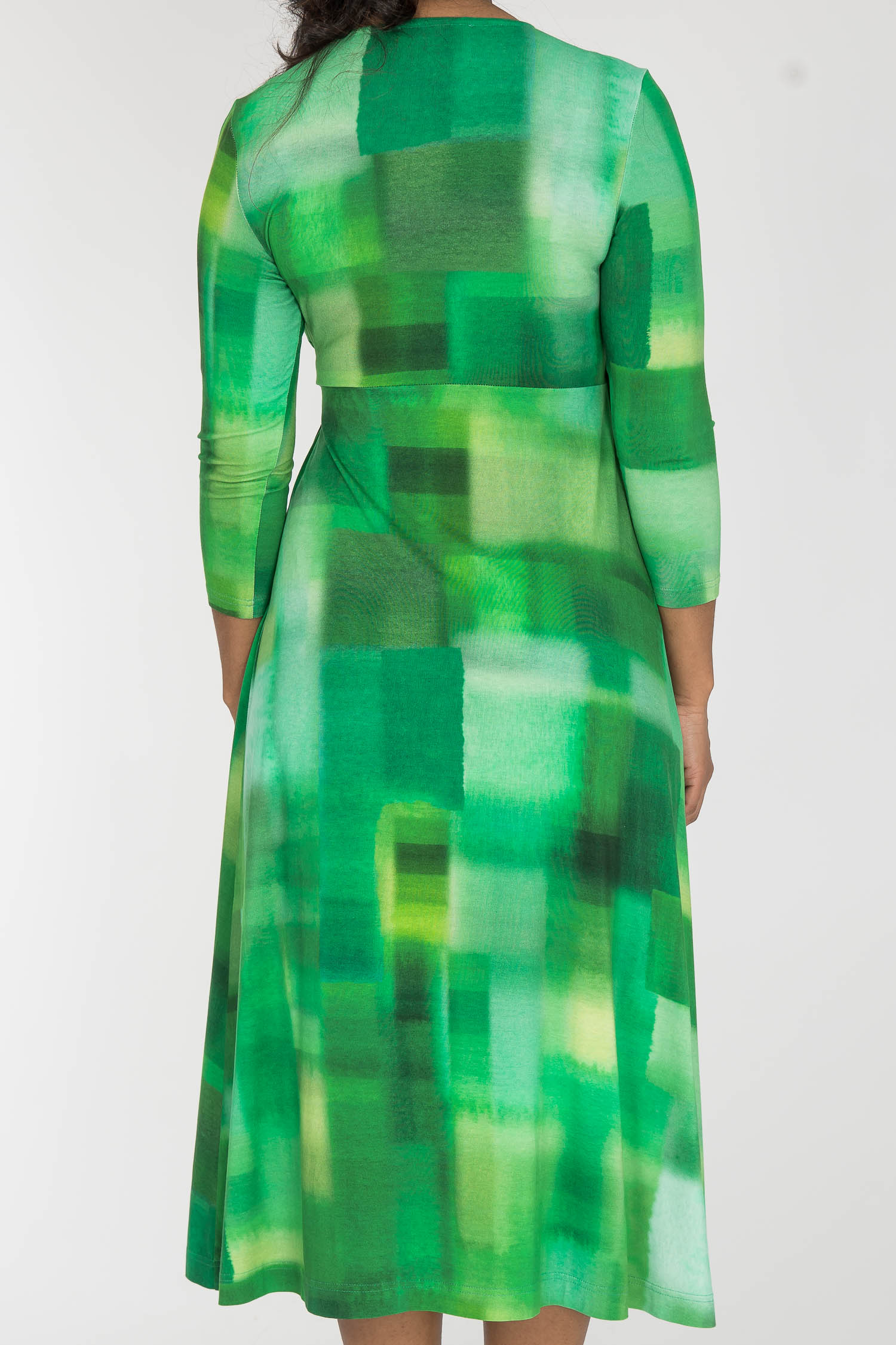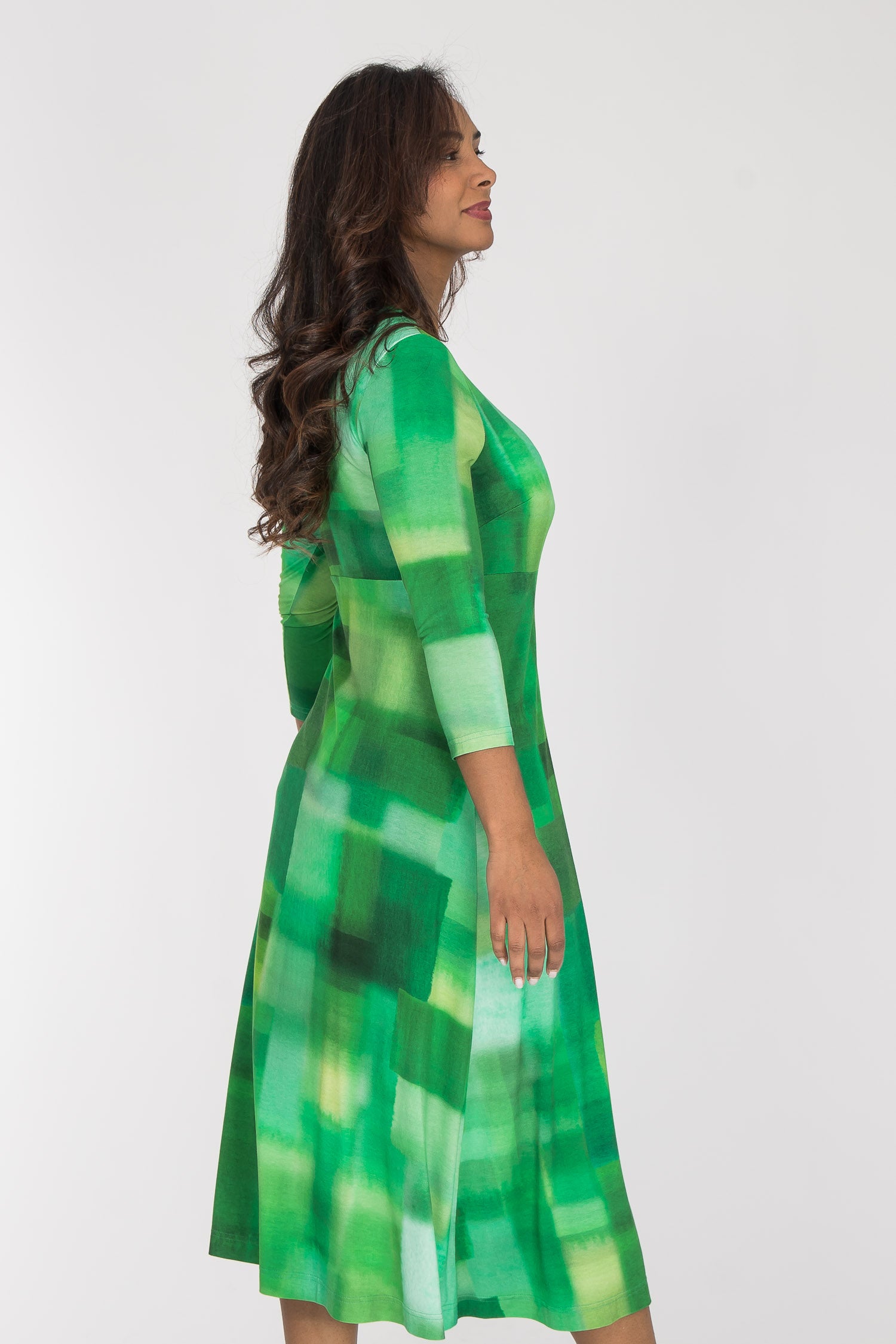 Mönstret består av flera gröna nyanser som rör sig mellan smaragdgrönt, gräsgrönt, mint och inslag av ljus lime. Färgerna är relativt klara men samtidigt något mjuka i övergångarna, vilket skapar ett harmoniskt och friskt uttryck. Kontrasten är medelhög tack vare de mörkare gröna partierna som ger djup till de ljusare tonerna.