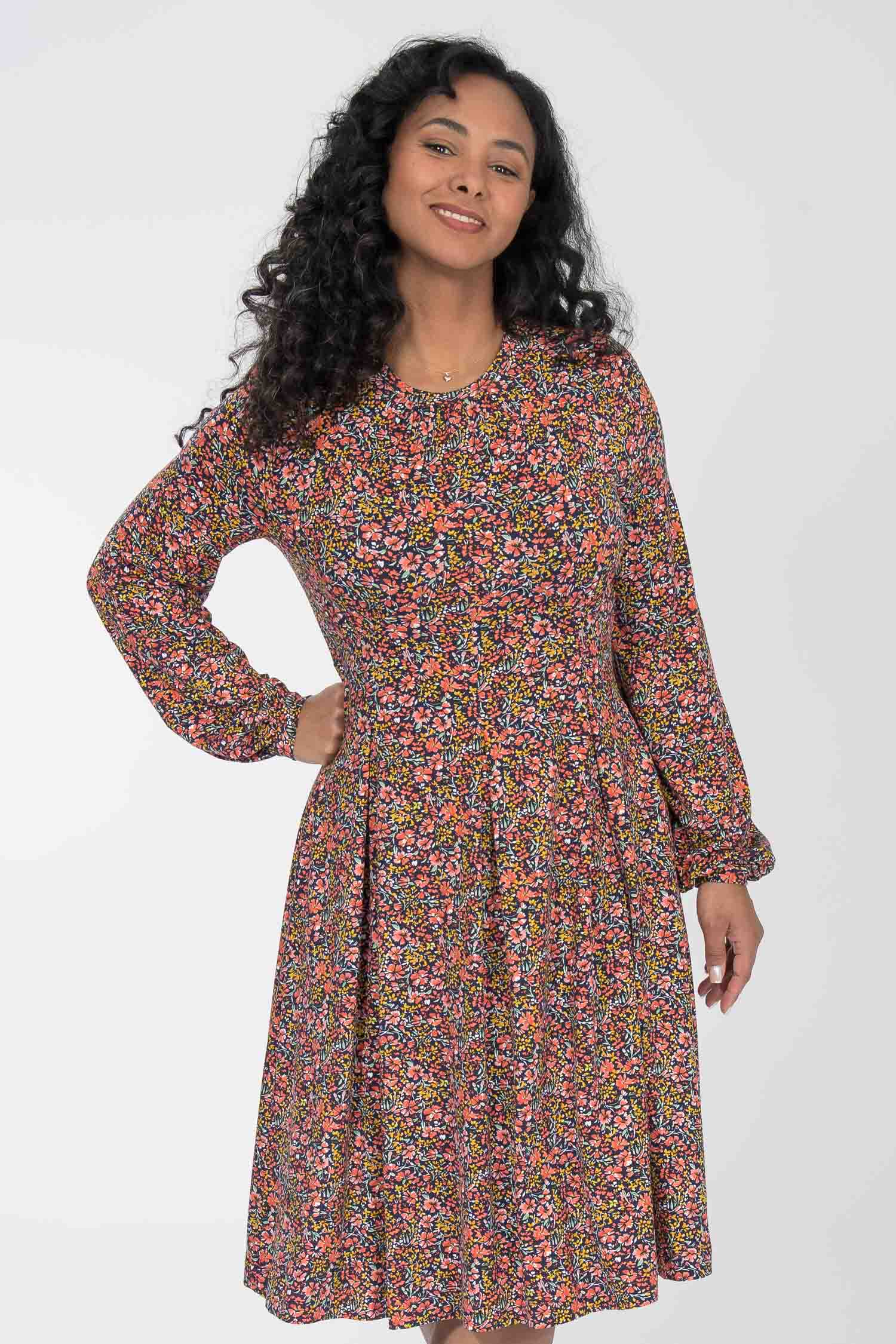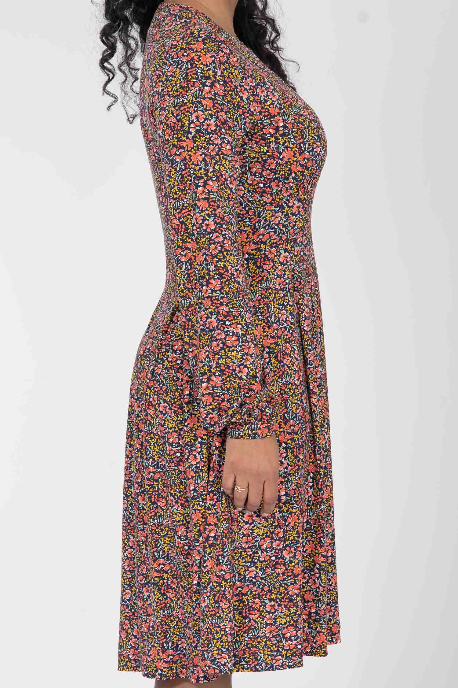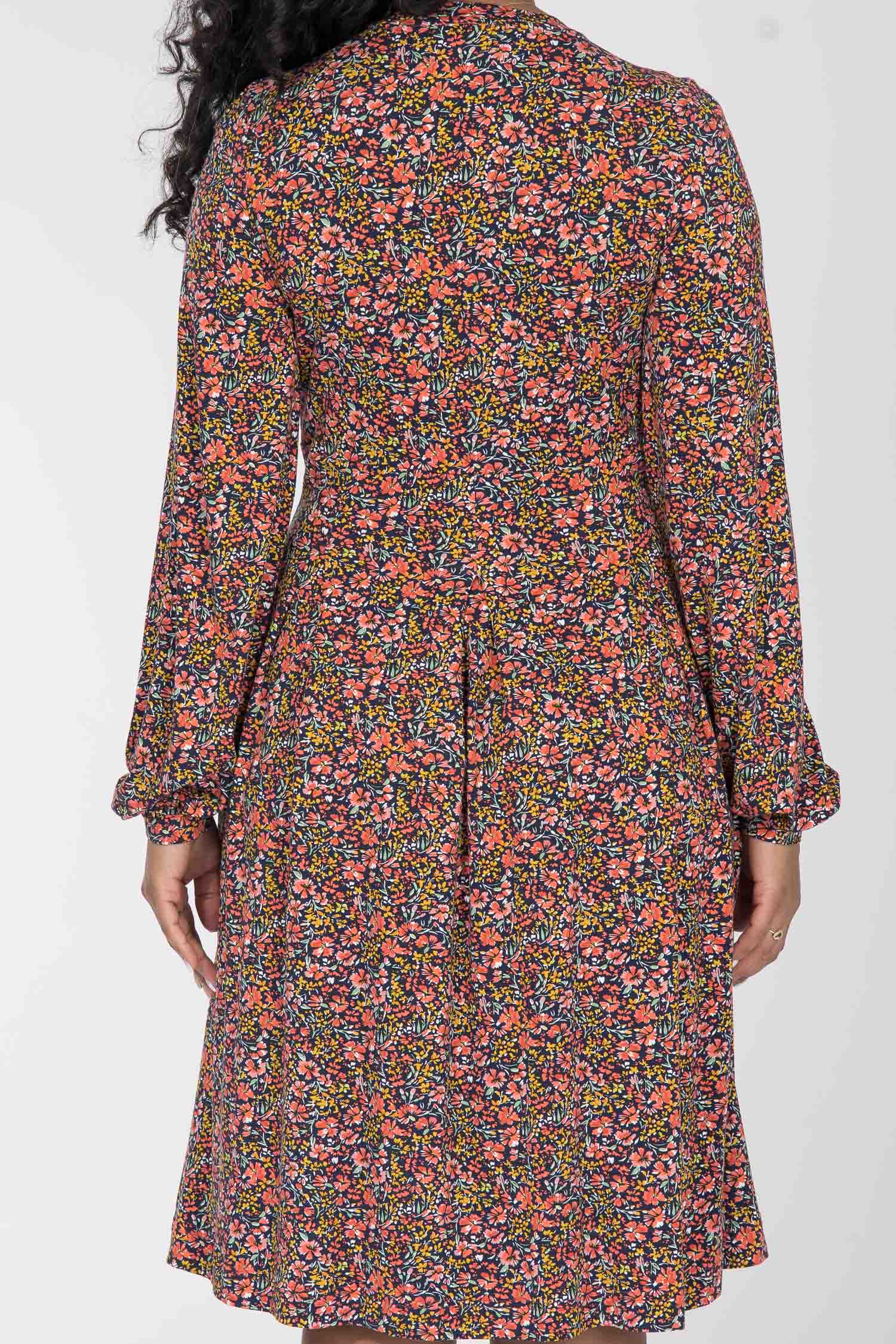 Den markerade midjan, med sina insydda motveck, gör kjolen vippig och ger en härlig vidd. Blommönstret i korallfärg står vackert mot den djupblå botten – perfekt för att lysa upp din dag. Och självklart har klänningen praktiska fickor i sidorna, så du kan ha dina småsaker nära till hands.