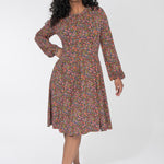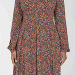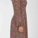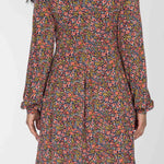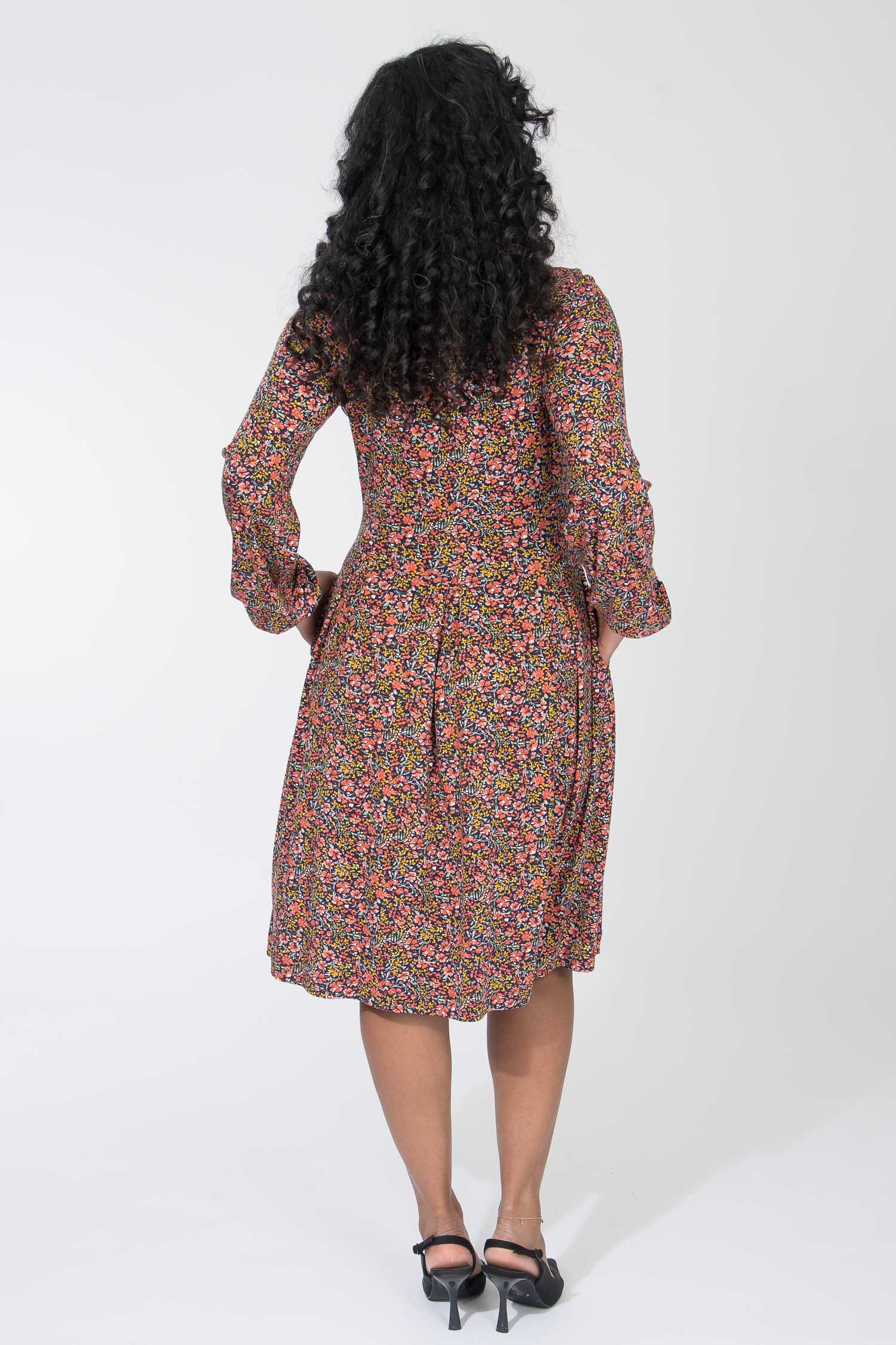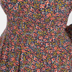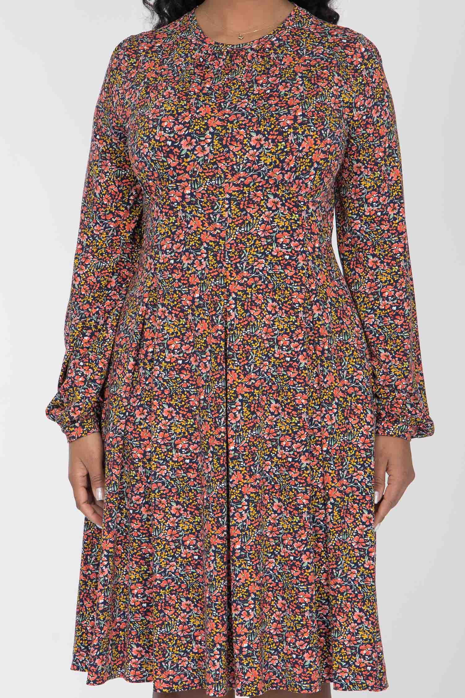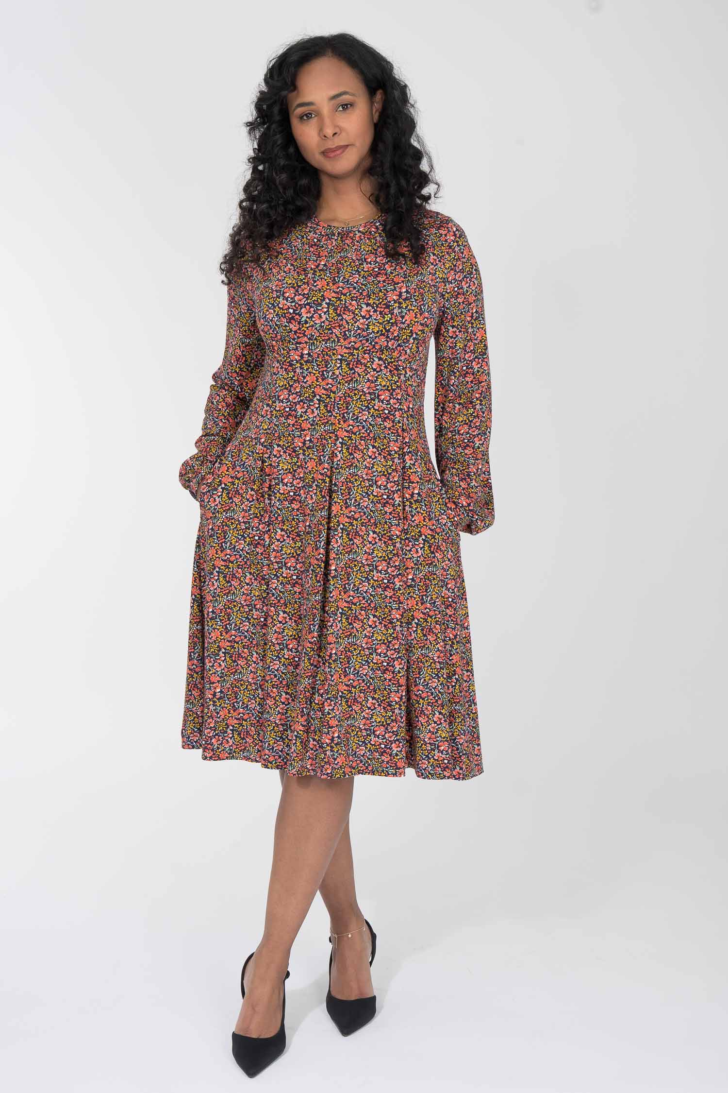 Den markerade midjan, med sina insydda motveck, gör kjolen vippig och ger en härlig vidd. Blommönstret i korallfärg står vackert mot den djupblå botten – perfekt för att lysa upp din dag. Och självklart har klänningen praktiska fickor i sidorna, så du kan ha dina småsaker nära till hands.