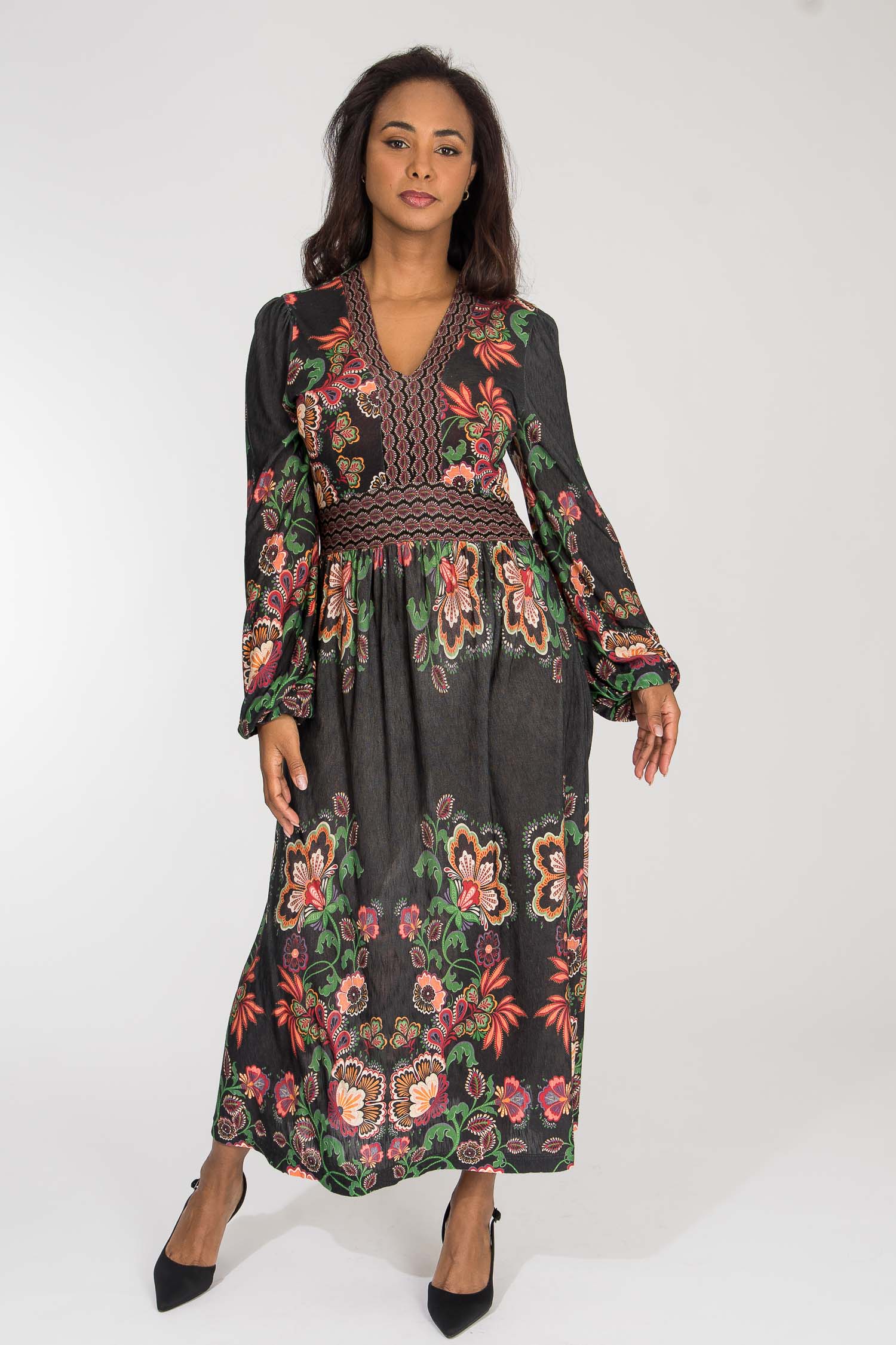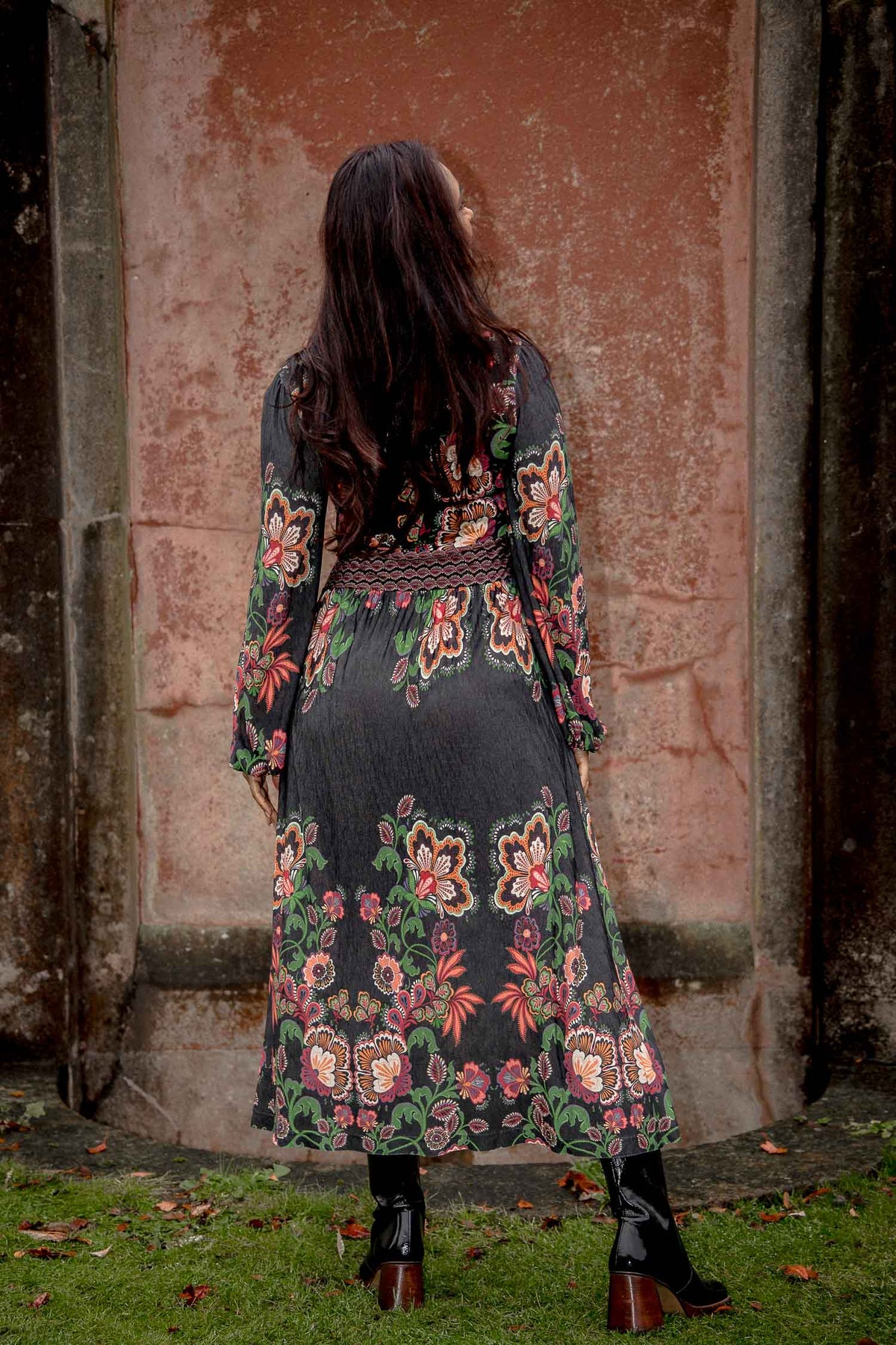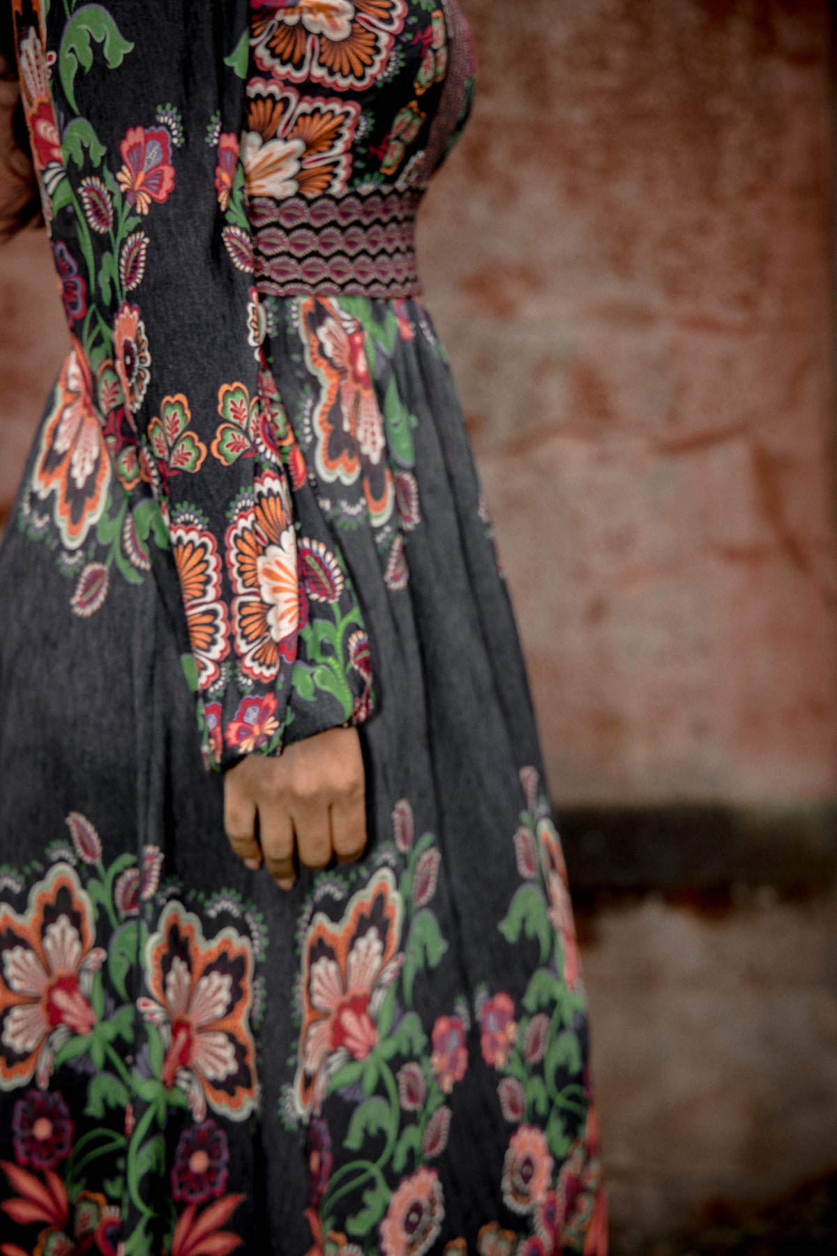 Mönstret ramar in halsringningen och midjan, vilket skapar en fin helhet och en vacker balans. Den har en ankellång kjol med mjukt fall och långa, lite vidare ärmar med resår.
