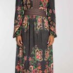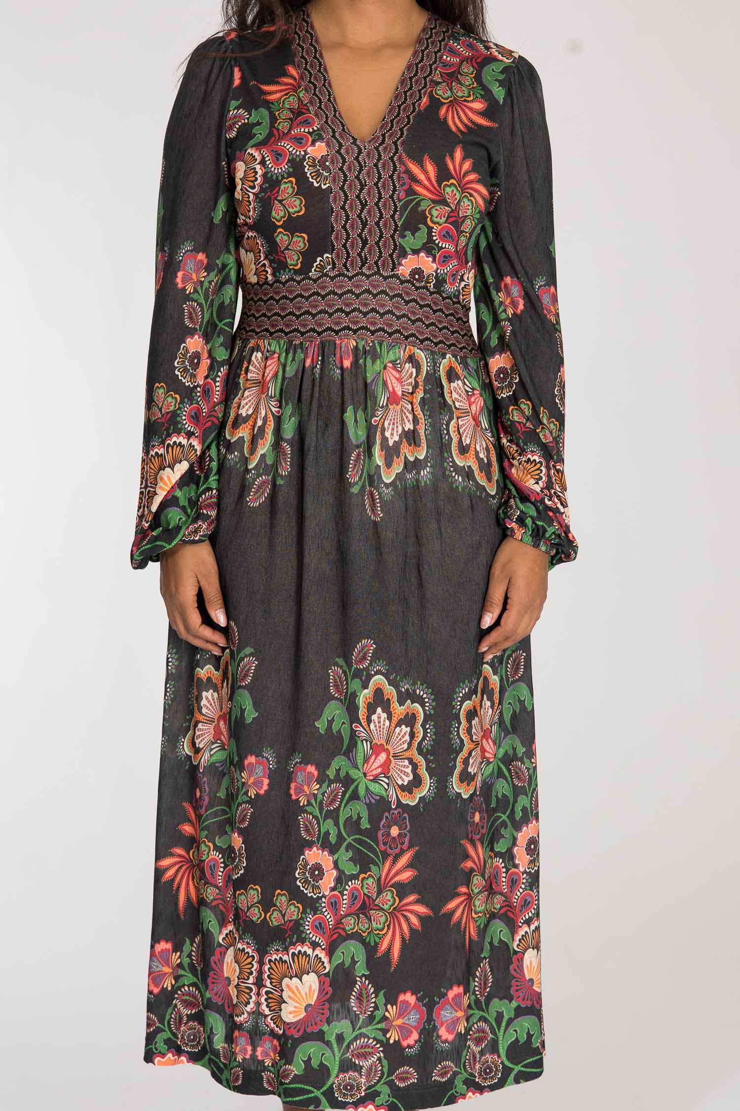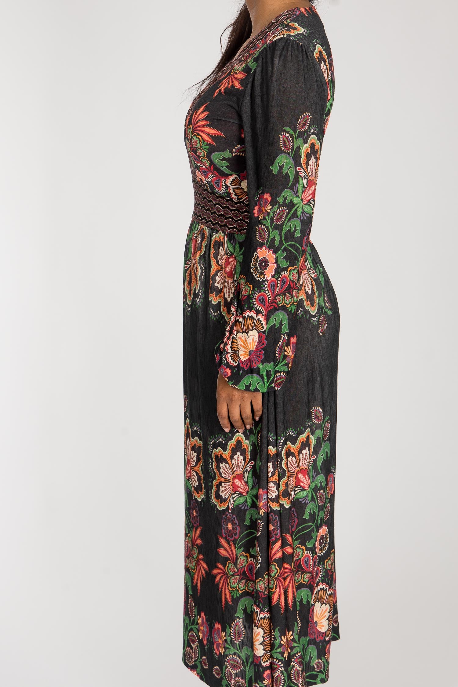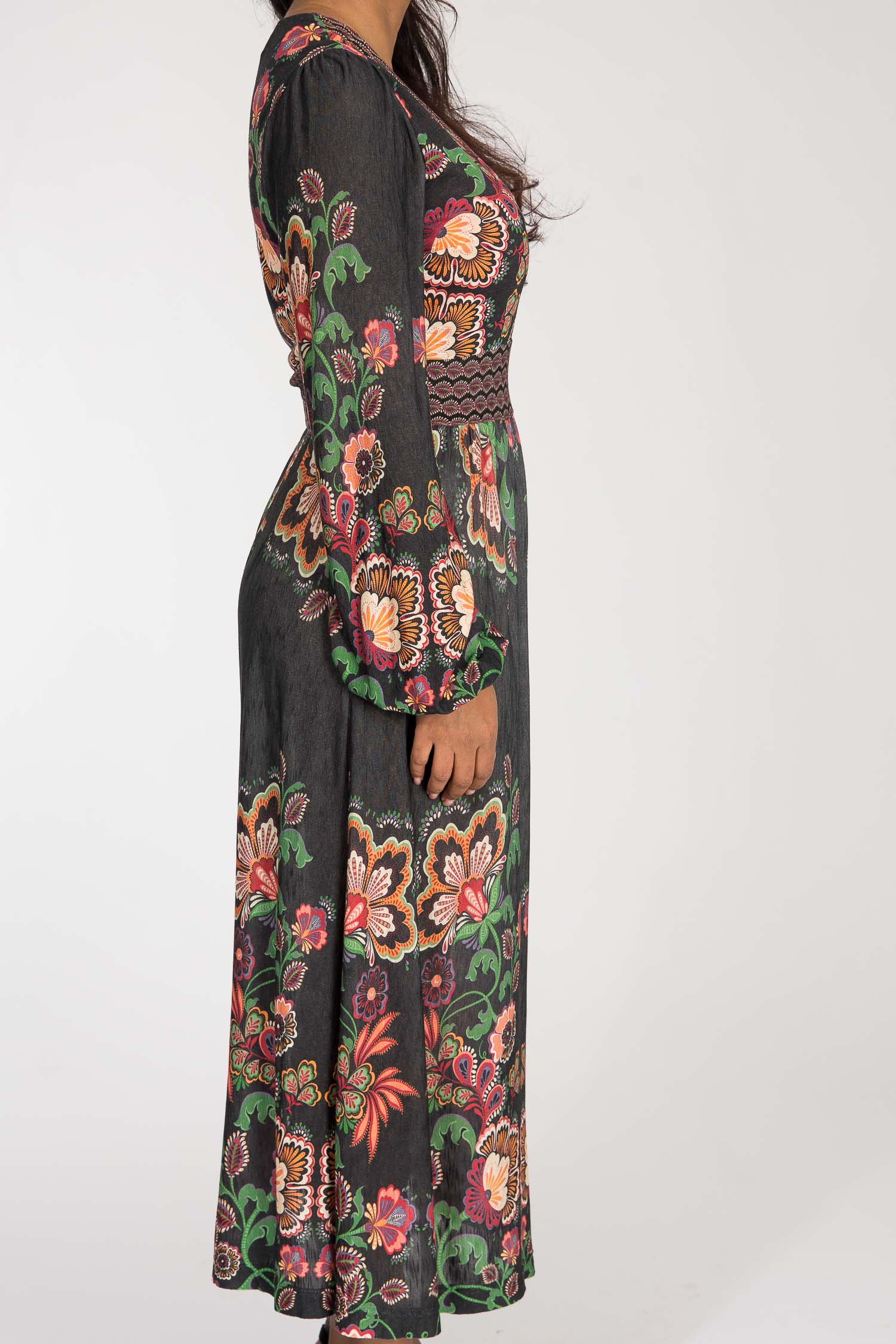 Mönstret ramar in halsringningen och midjan, vilket skapar en fin helhet och en vacker balans. Den har en ankellång kjol med mjukt fall och långa, lite vidare ärmar med resår.