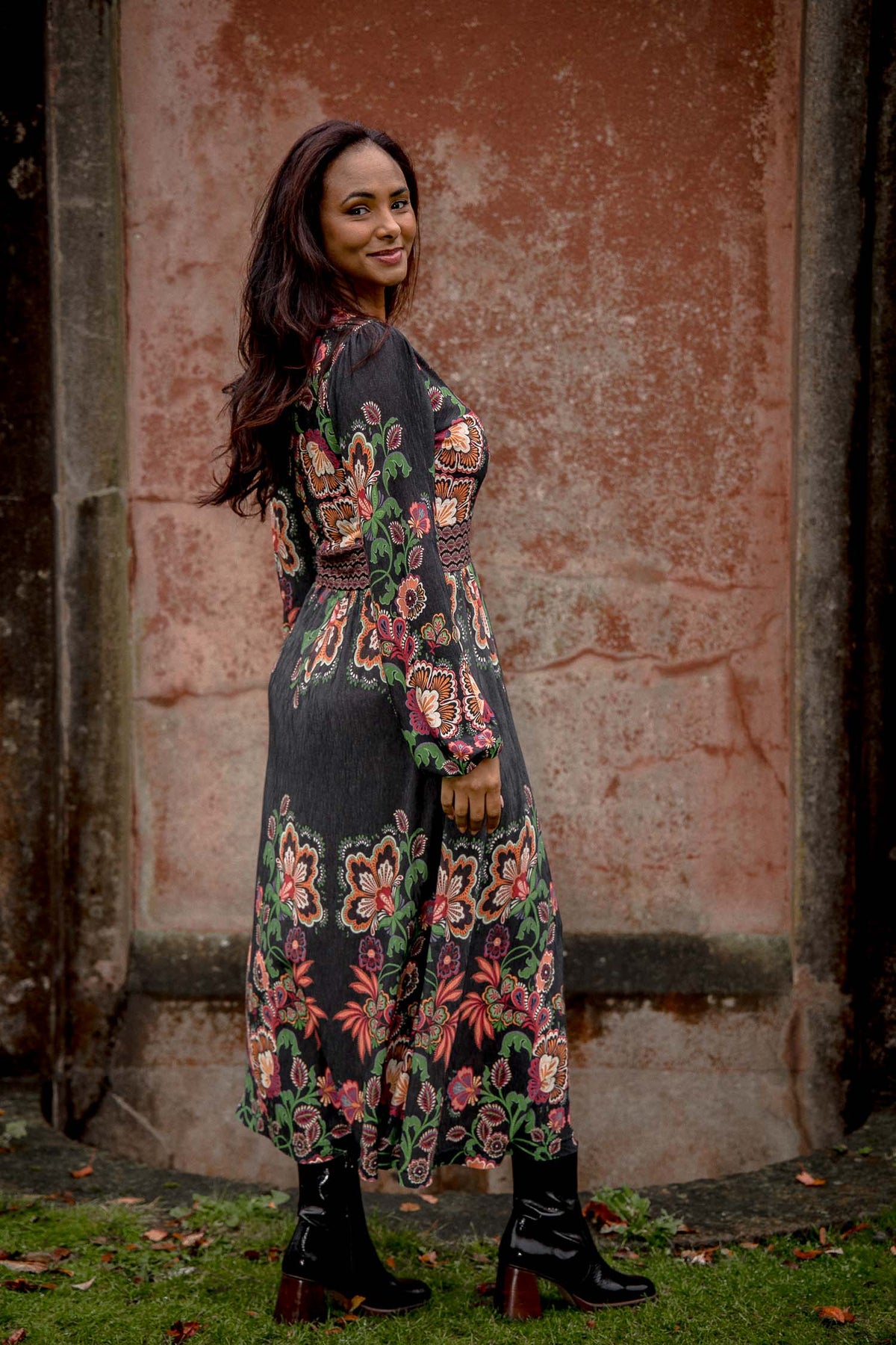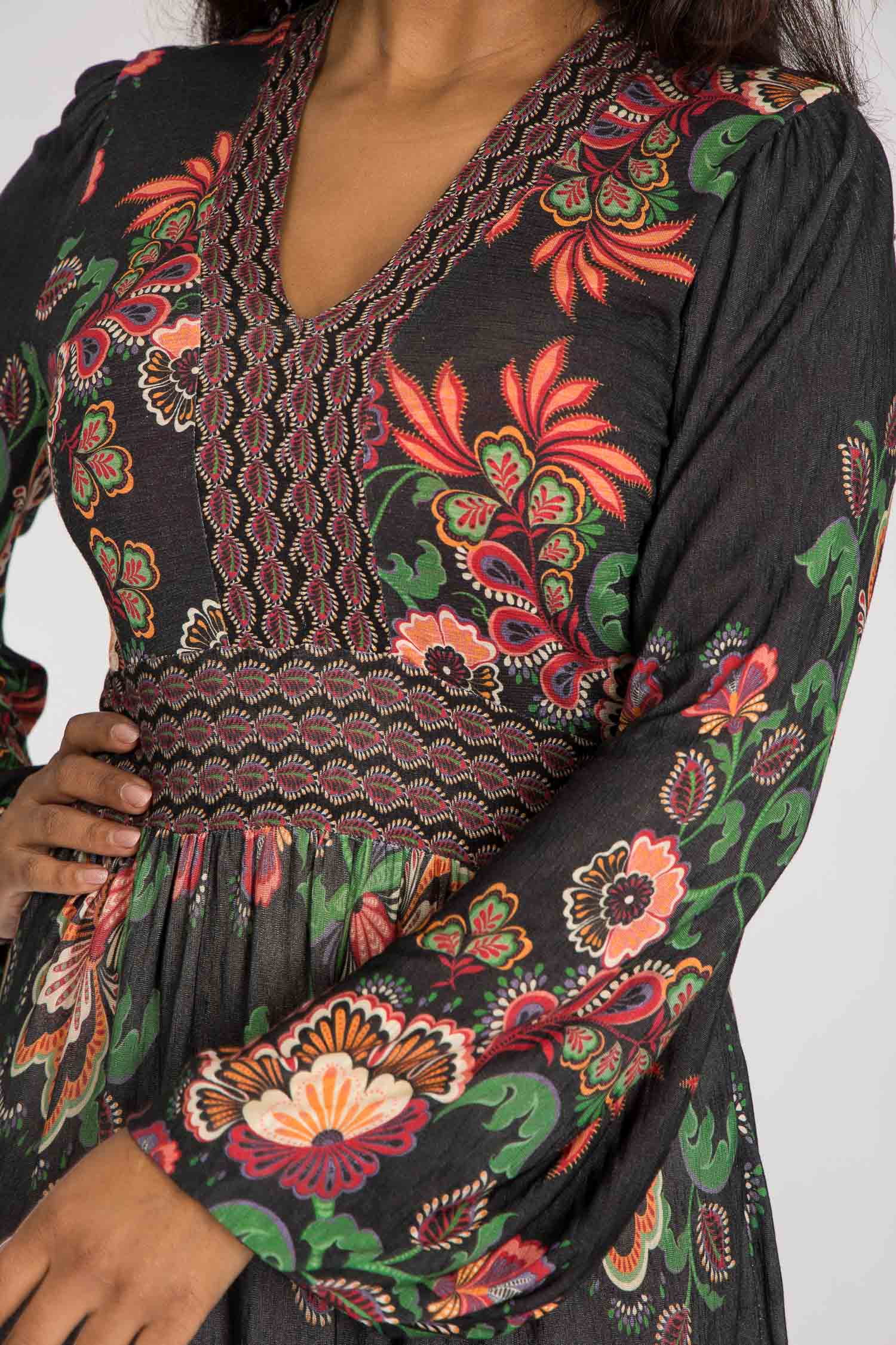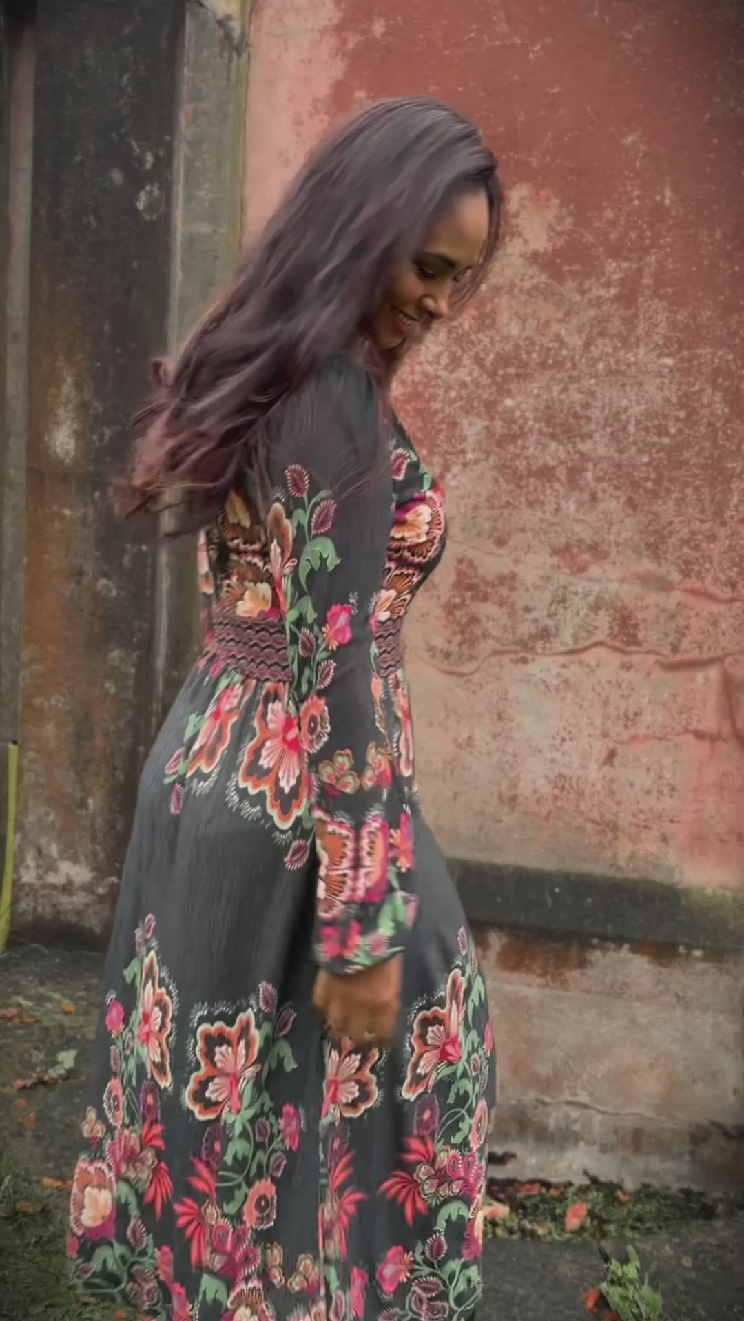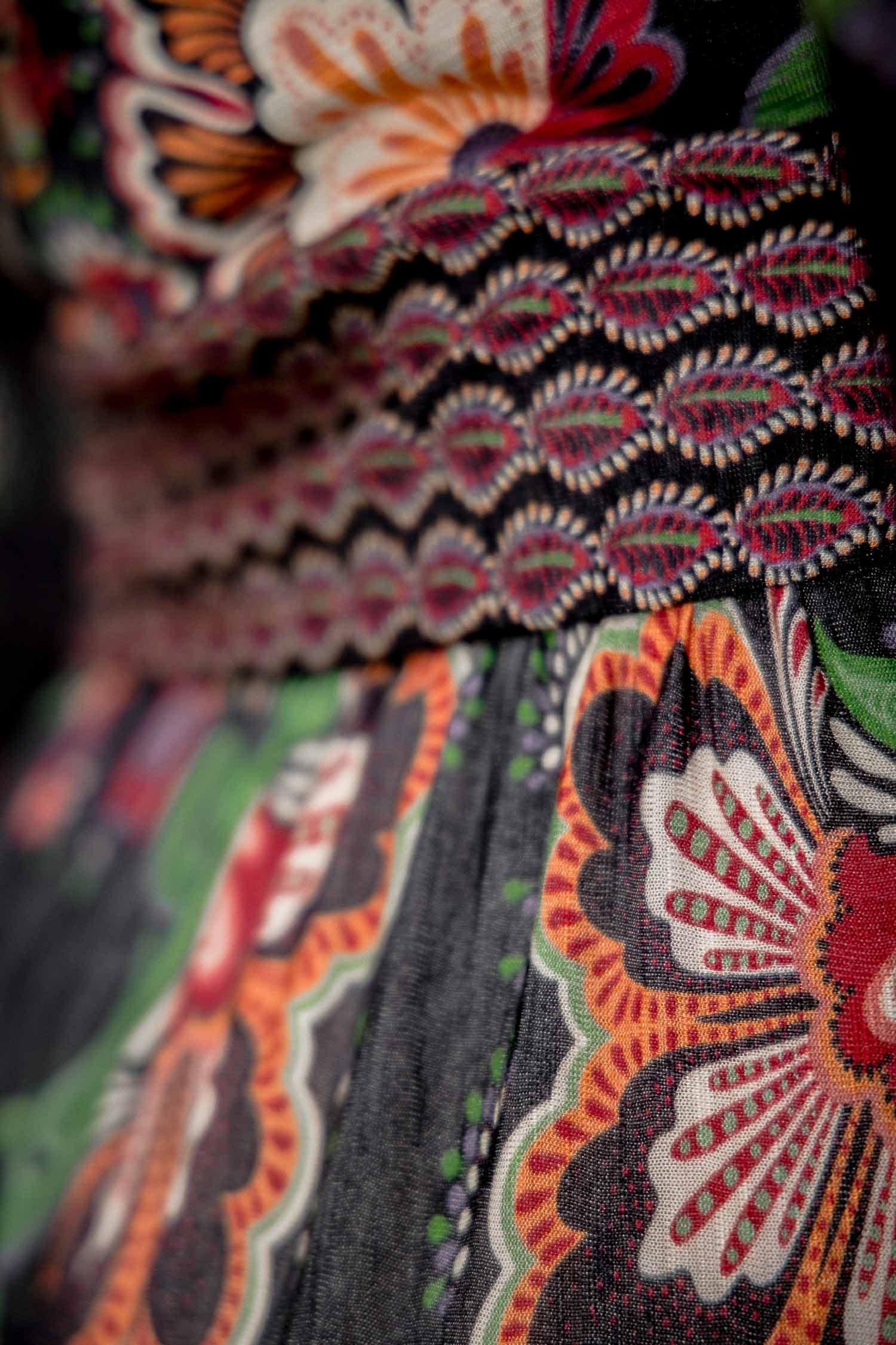 Voilà! Vår Pure Boho är tillbaka i ett nytt, helt underbart mönster. Sydd i mjuk viskostrikå med ett färgstarkt blommotiv i folklore-inspirerad stil och färger som känns helt rätt för december och vinterns alla tillfällen.