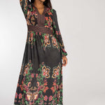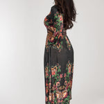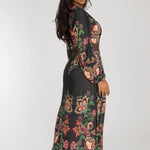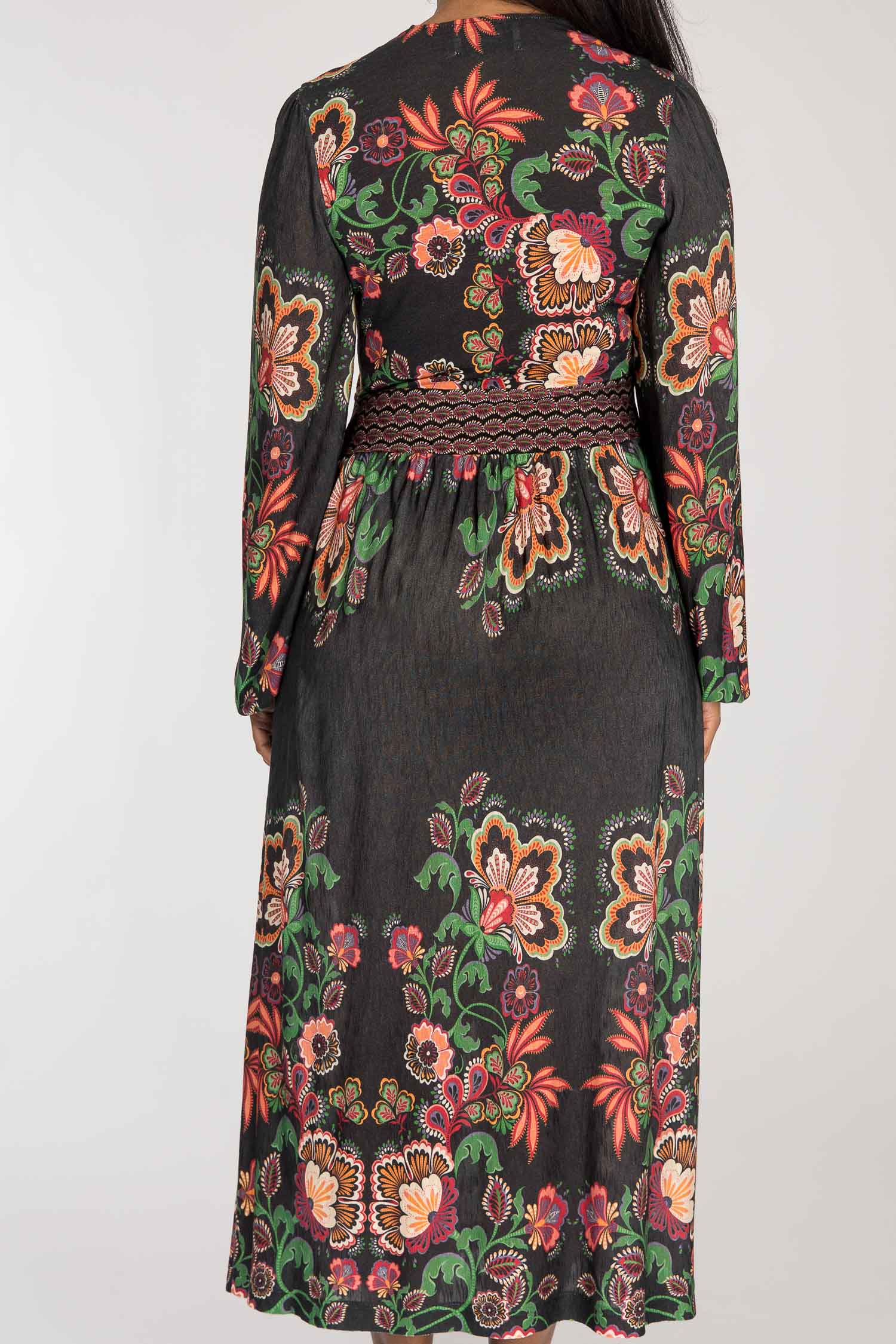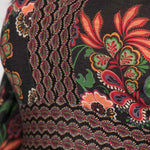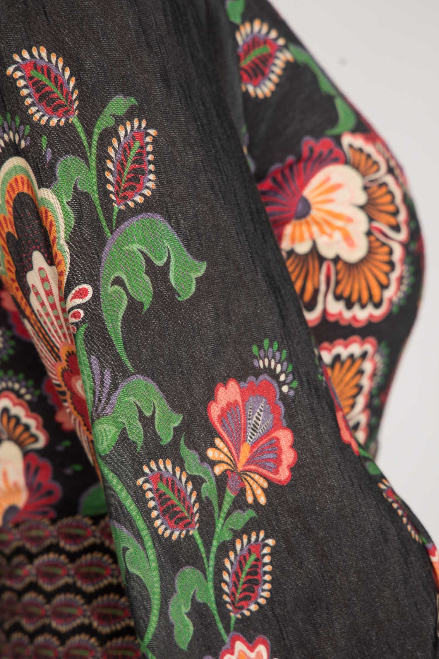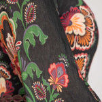 Mönstret har en mörk antracitgrå bas som skapar ett mjukare och mer jordnära uttryck än svart. Ovanpå detta ligger varma och dämpade toner av korall, aprikos, senapsgult, djupt vinrött och olivgrönt, tillsammans med mörkare grönbladiga detaljer. Färgskalan känns varm, rik och harmoniskt dämpad.