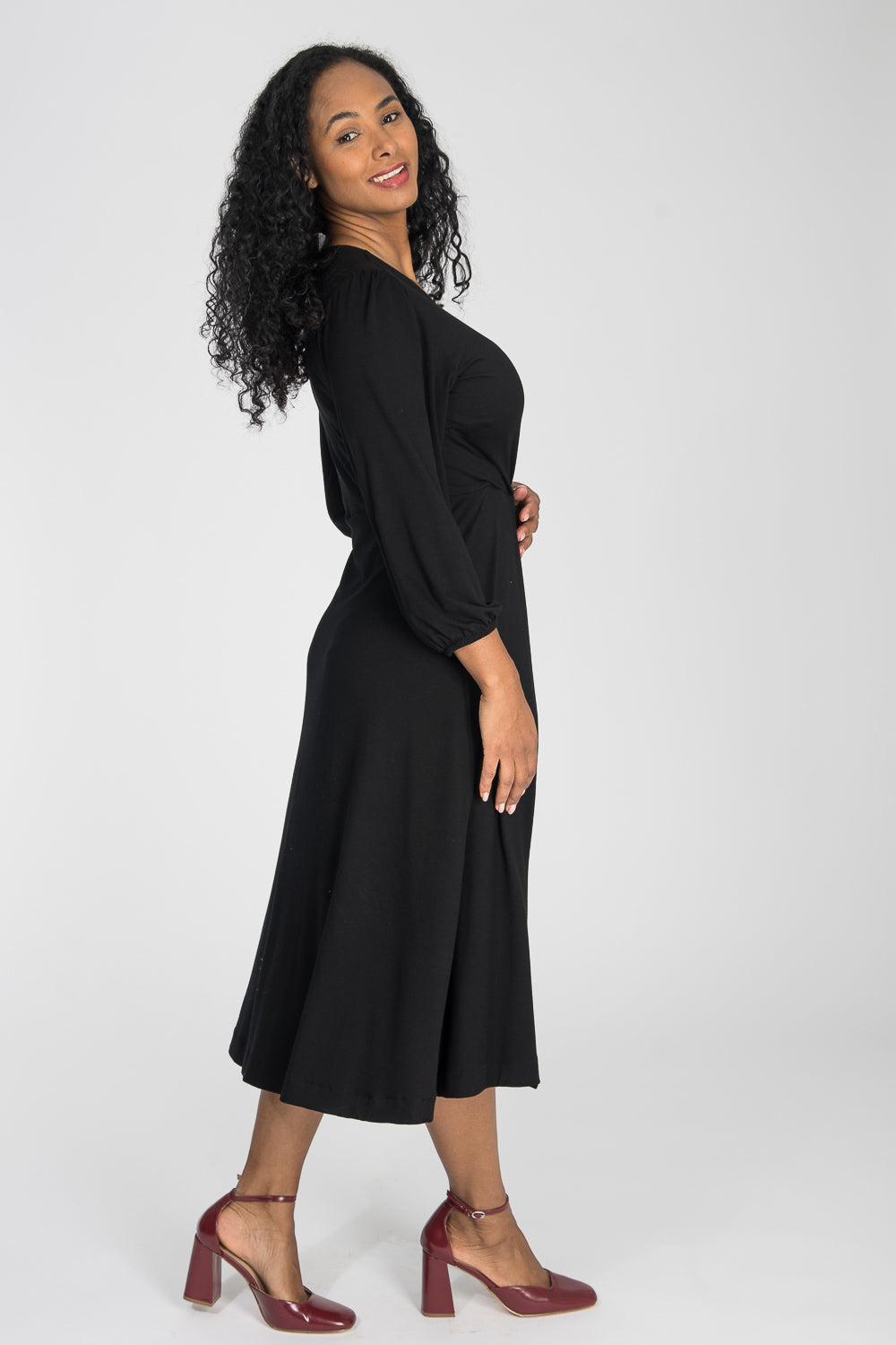 Om du läser att en klänning är sydd i stretchigt tyg med tungt fall, så är det en av våra mest omtyckta kvaliteter. Tyget är en hållbart tillverkad trikå av Vortex-viskos och elastan – mjukt, följsamt och med en elegant tyngd som ger ett vackert fall längs kroppen.