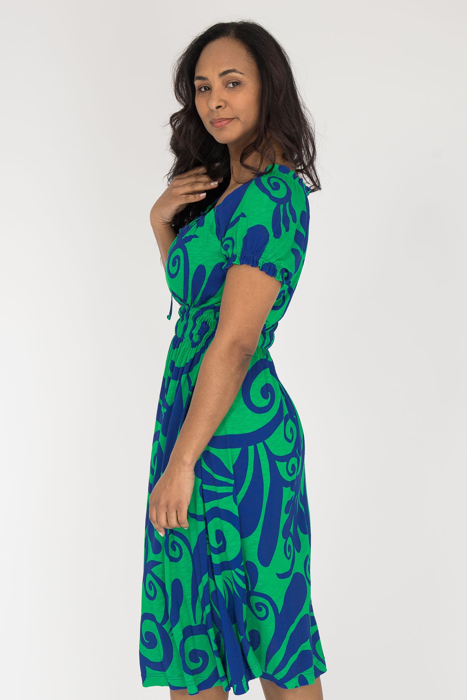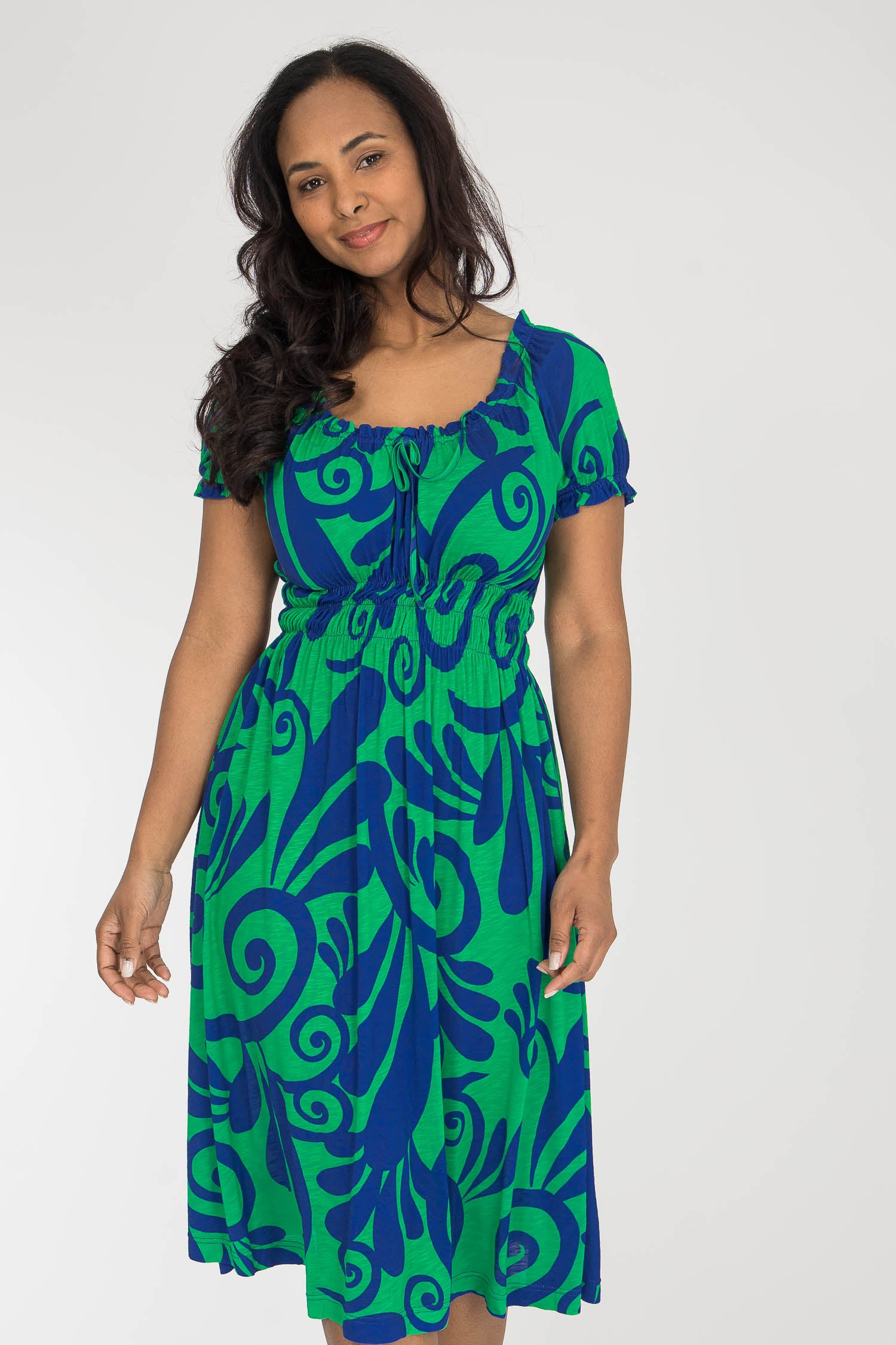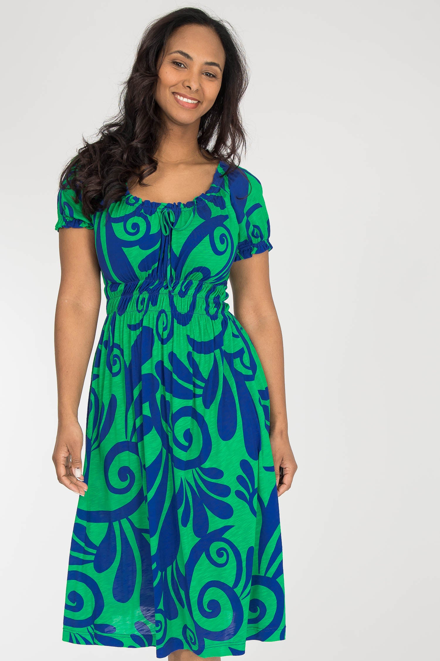 Mönstret i klara färger ger klänningen liv och gör den lika fin till enkla sandaler som till en mer uppklädd look.