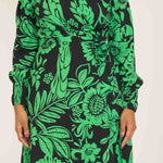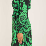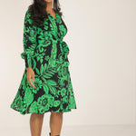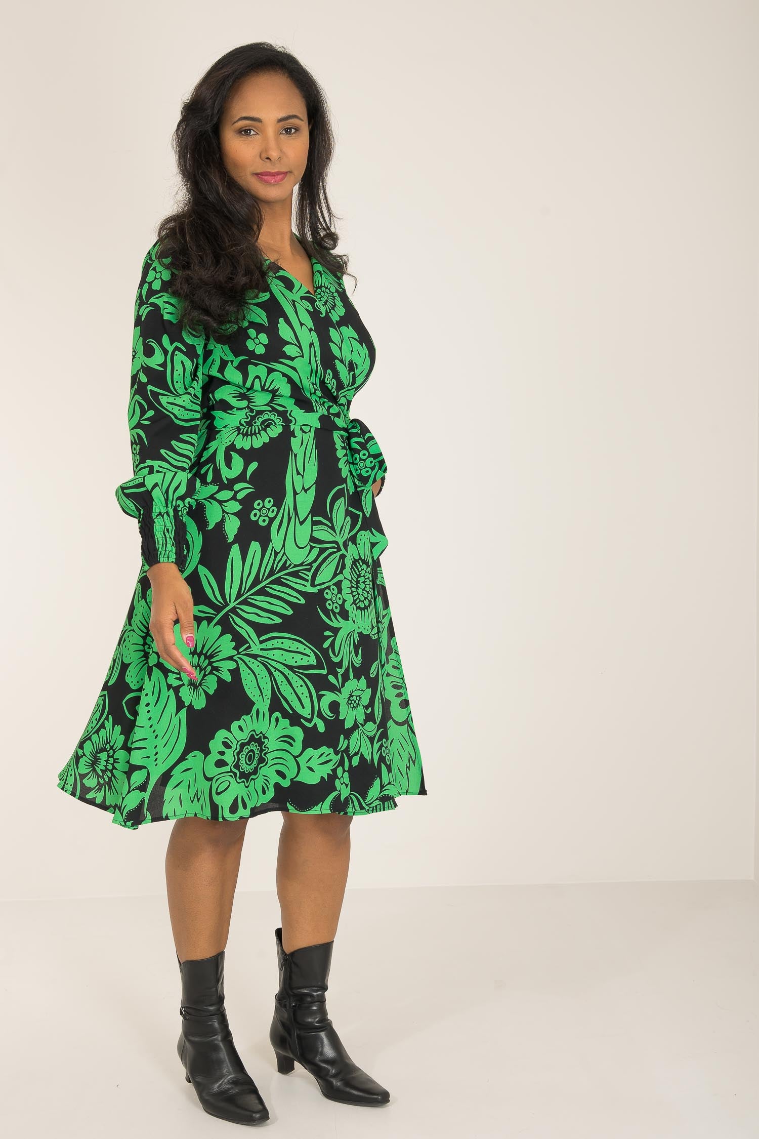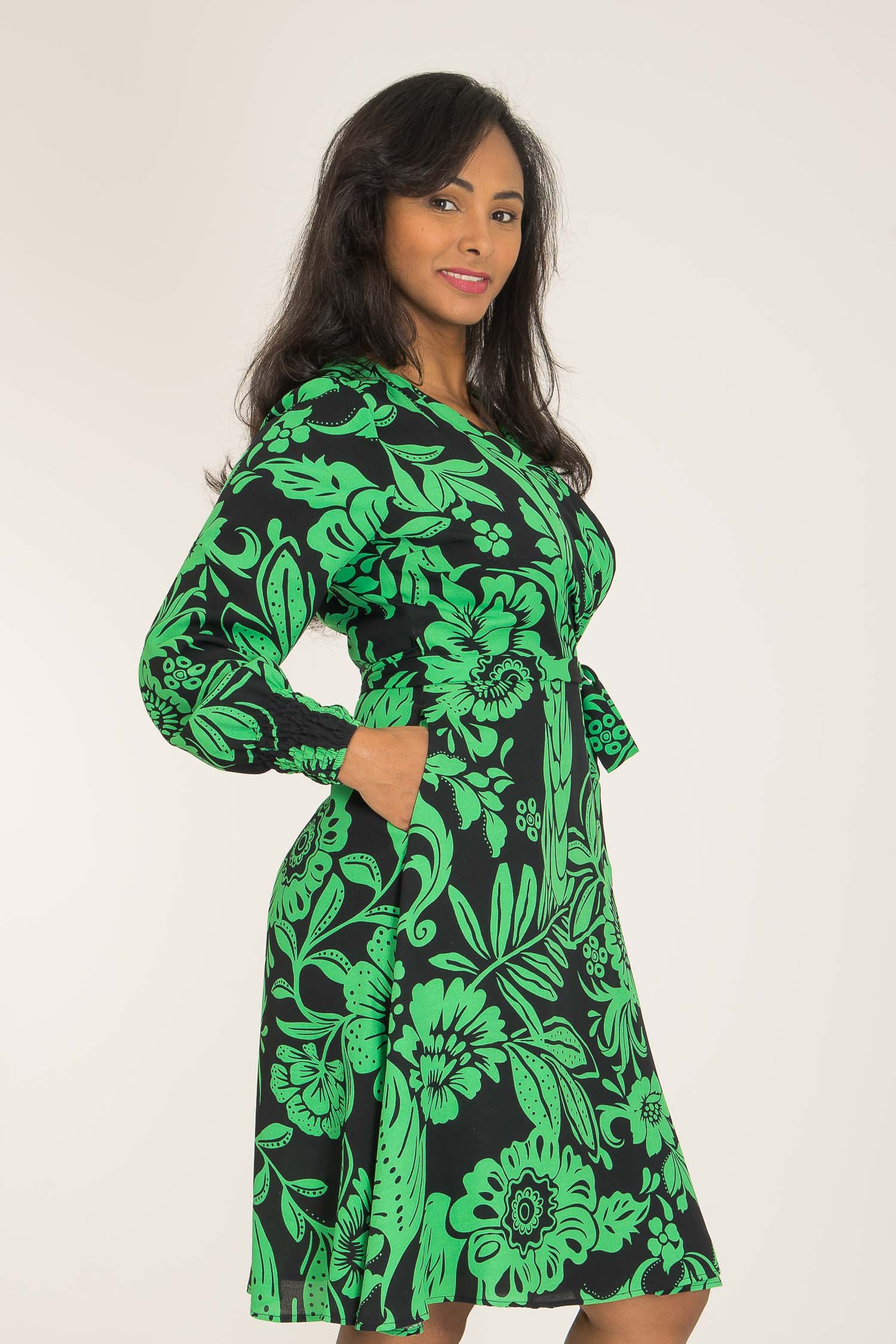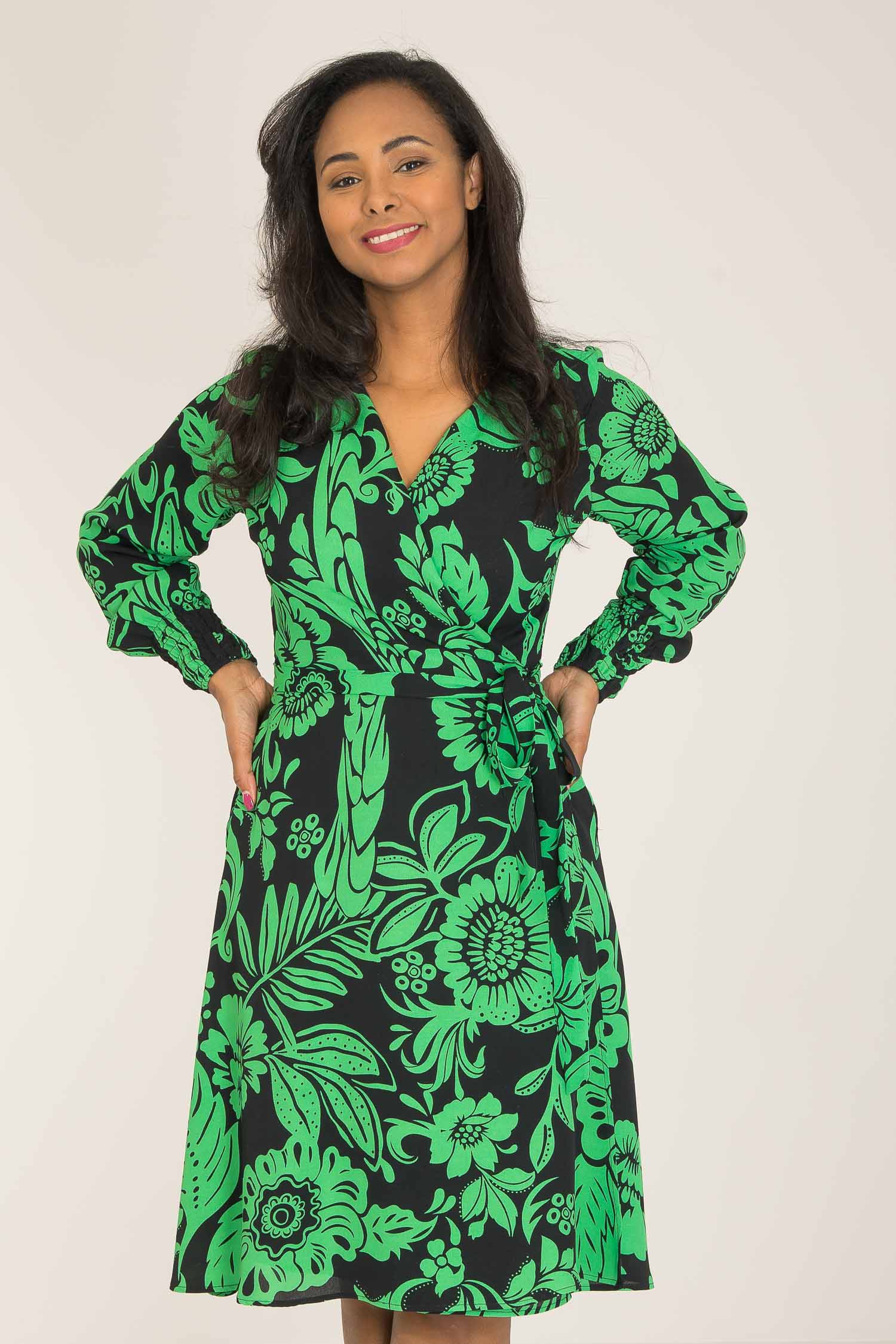 Den här omlottklänningen är den mest stilsäkra klänningen i år och det perfekta exemplet på ett bär-mig-närsomhelst plagg! Sydd i en luftig och följsam viskos är den perfekt till jobbet, en tur på stan eller sofistikerade middagar. Det färgstarka mönstret och den generösa vidden i både ärm och den böljande kjolen utstrålar 100 % feminin elegans!