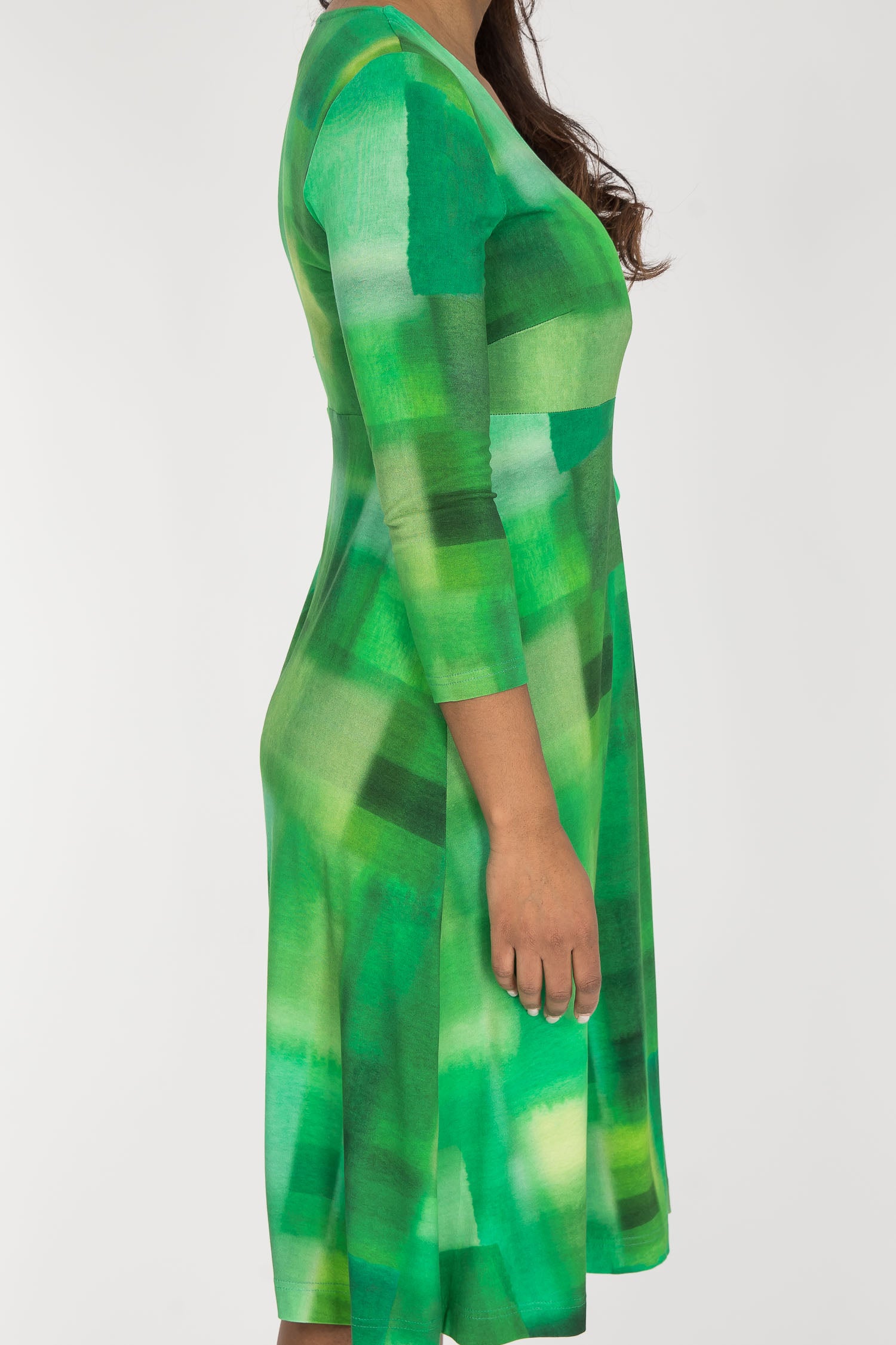 Mönstret består av flera gröna nyanser som rör sig mellan smaragdgrönt, gräsgrönt, mint och inslag av ljus lime. Färgerna är relativt klara men samtidigt något mjuka i övergångarna, vilket skapar ett harmoniskt och friskt uttryck. Kontrasten är medelhög tack vare de mörkare gröna partierna som ger djup till de ljusare tonerna.